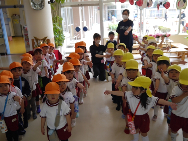 基本動作の後、ALT英語教室に参加しました。年長組最初のALTでしたが、荒居先生もヤナ先生もずっとお世話になっているのでみんな楽しく落ち着いて参加できていました。今日は日付の確認をして月の名前などを確認した後に、新しく幸せなら手を叩こうの英語バージョンの歌や虫の歌を教えてもらって体を動かしながら楽しみました。繰り返し練習して覚えていきたいと思います。