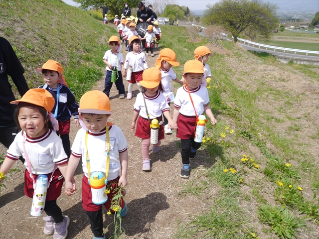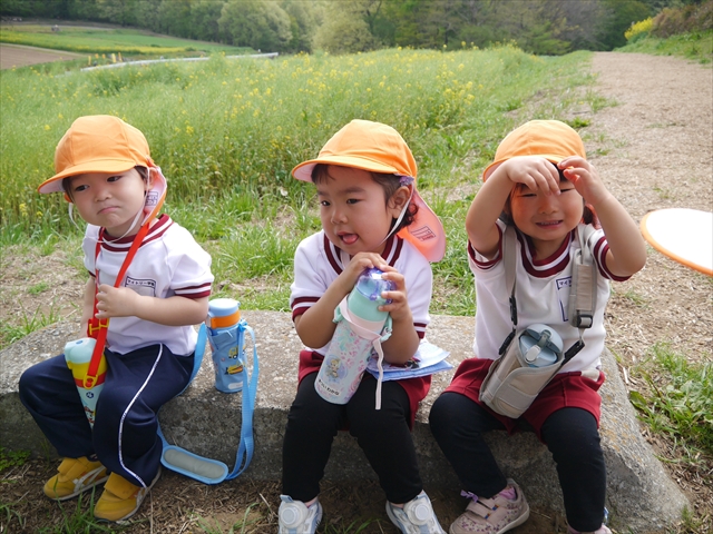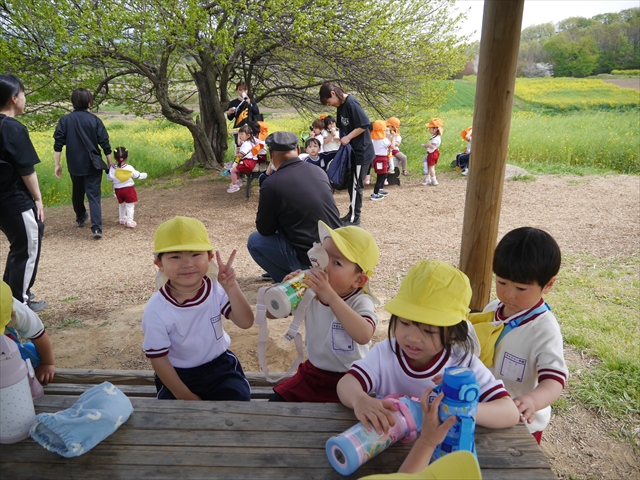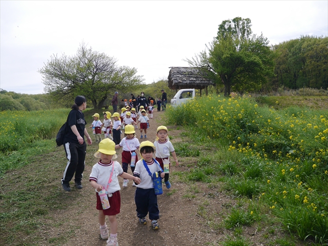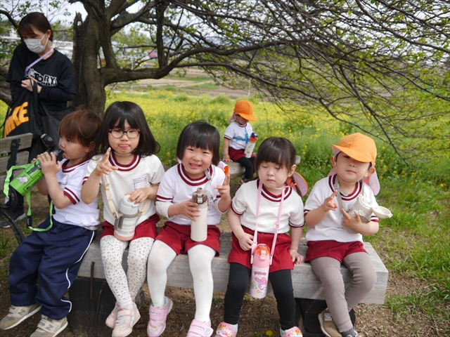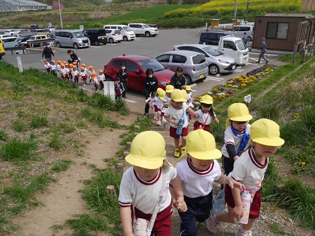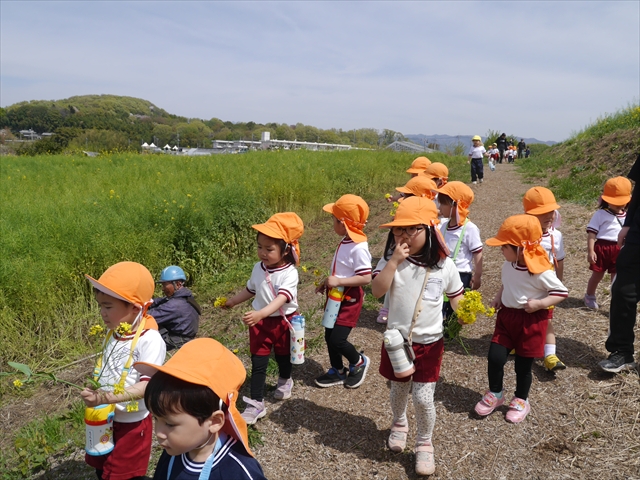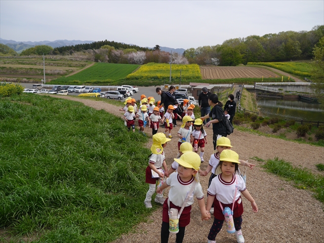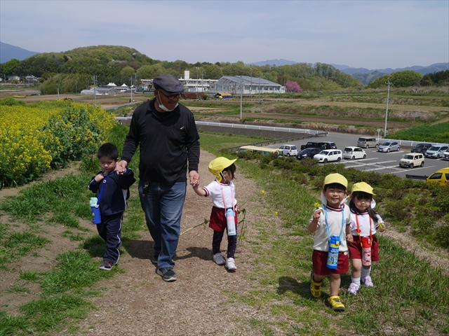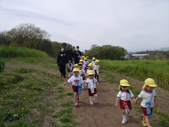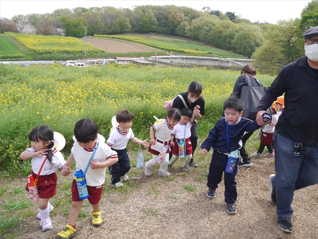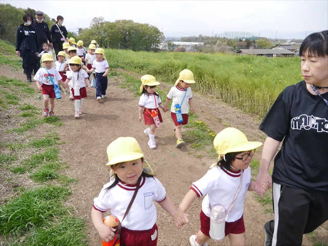この園外散歩は、幼稚園の年少さんになったご褒美の散歩でもありますし、年少さんたちが先生たちの言うことを聞いてどこまでしっかり行動できるかを試す園外散歩でもありました。出かける前はちょっと心配でしたが、「たんぽぽさん」の頃とは違って、みんな先生たちの指示をよく聞いて、友達と手をつなぎ、自分で歩き、自分で見て、しっかりと「菜の花見学、菜の花畑散策」ができました。とっても偉かったです!まる!(^_^)v (^_^)b