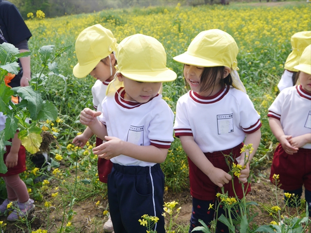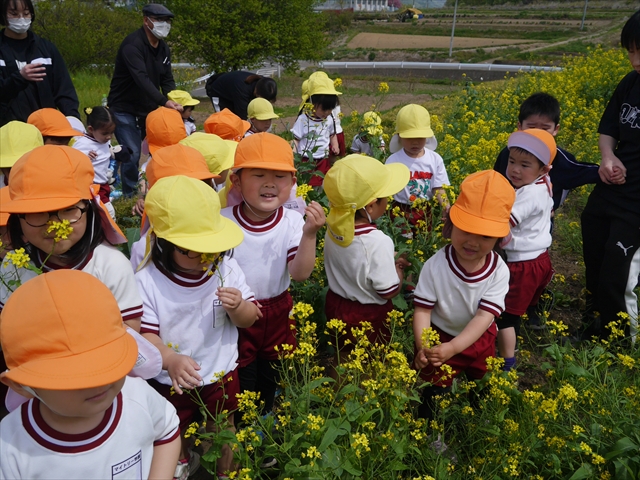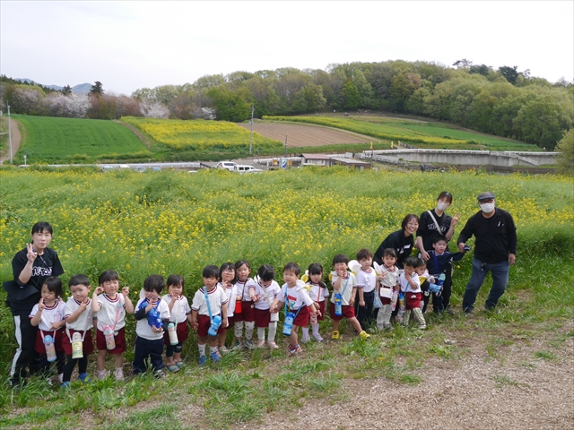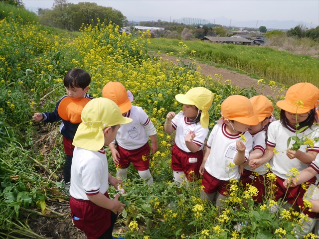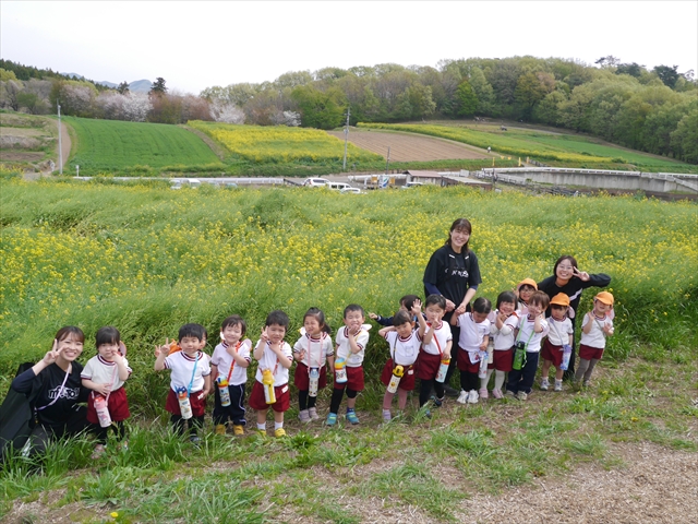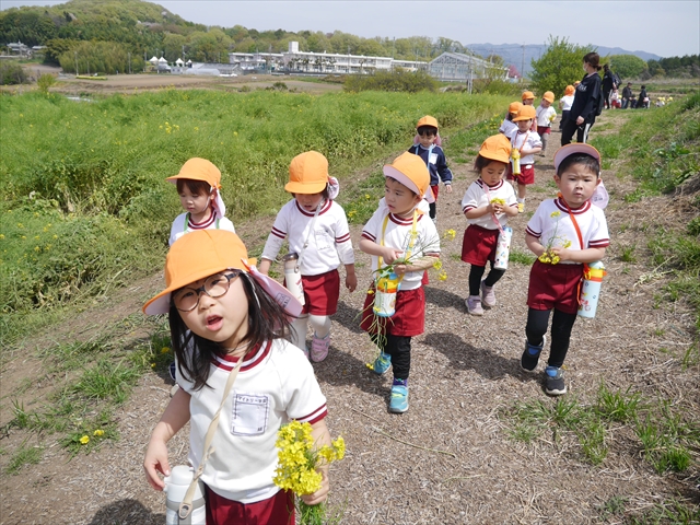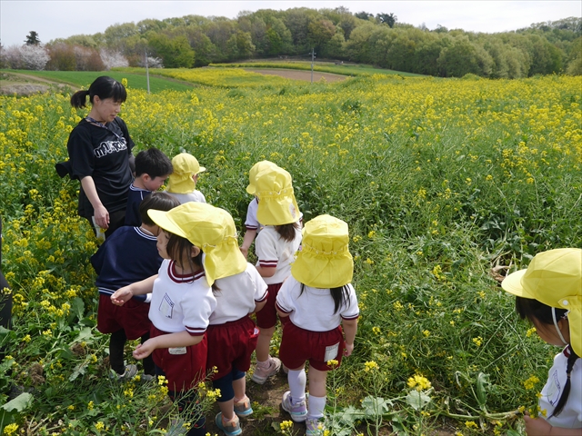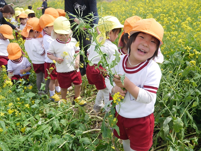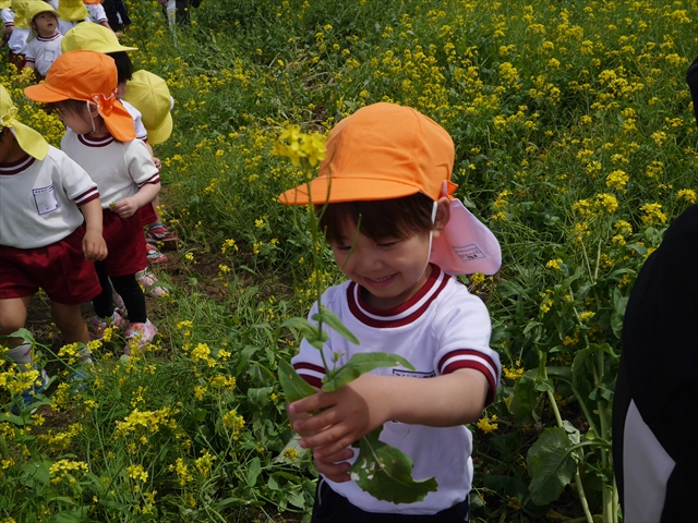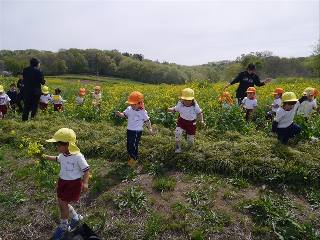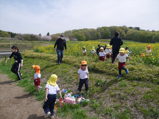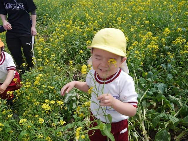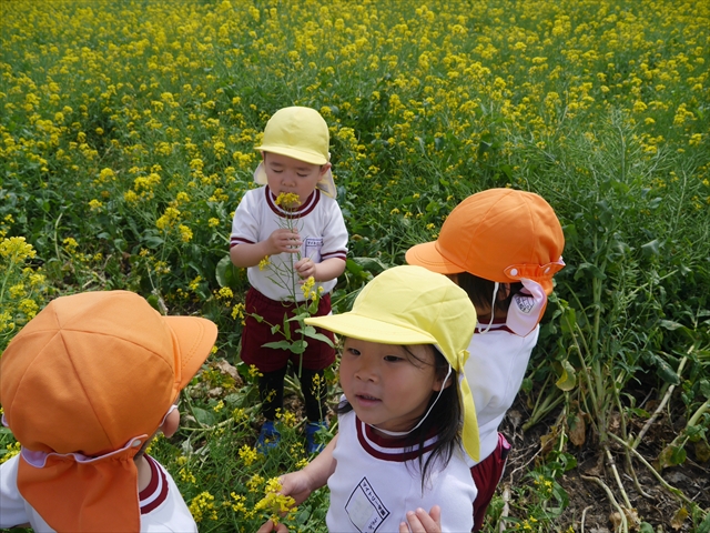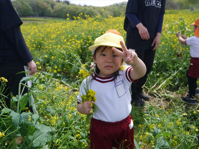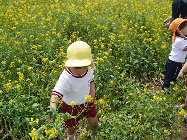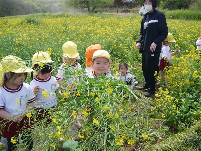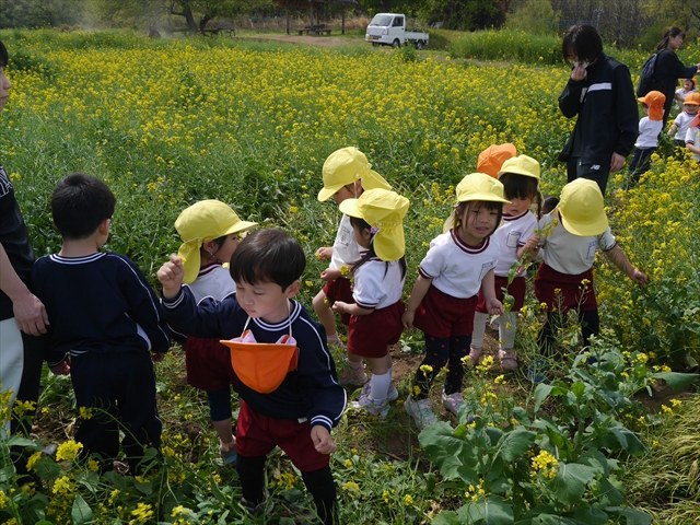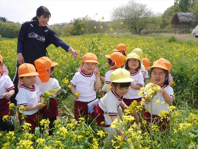 ここ数日春の暖かな日が続きますが、今日も朝から暖かく春の散歩には丁度良い天気でした。今日は、自然体験学習第2弾として、 絶好のお散歩日和の中、 年少組の「菜の花見学・菜の花畑散策」を行いました。鹿田山の清水新沼一帯の菜の花畑もそろそろ終わりを迎えつつありますが、まだまだたくさんの菜の花が咲いており、たくさんの人が散策に来て駐車場も満杯に近い状況でした。 年少組にとっては、今回幼稚園に入園して初めてのバスに乗っての園外散歩でした。畑いっぱいの菜の花の間を散歩し、記念写真を撮り、「自由時間の遊びの時間」では、 今日は、「菜の花刈り取りの方」がいたので、お願いして菜の花畑の中で遊ぶことを許可していただきました。なので、みんな大はしゃぎで菜の花畑の間を歩き回り、菜の花の匂いを嗅ぎ、菜の花と戯れていっぱい遊びました。また、菜の花を摘んで、ママへのプレゼントにするんだという子どもたちもいました。えらい!とにかくみんな汗ばむような陽気の中、絶好のお散歩遊びのひとときとなりました。(*^_^*) (^_^)v