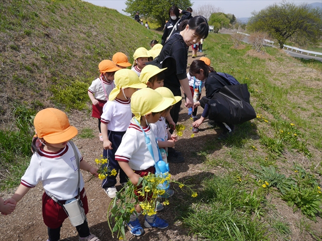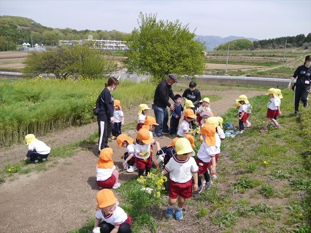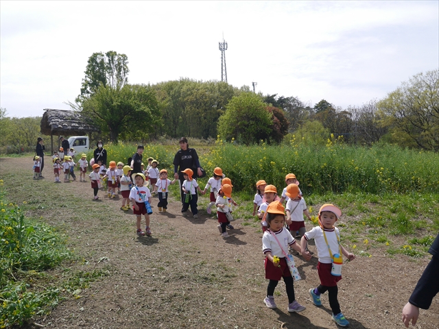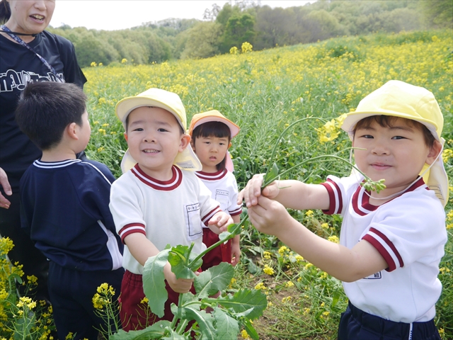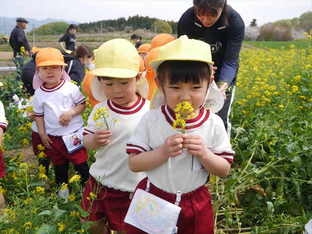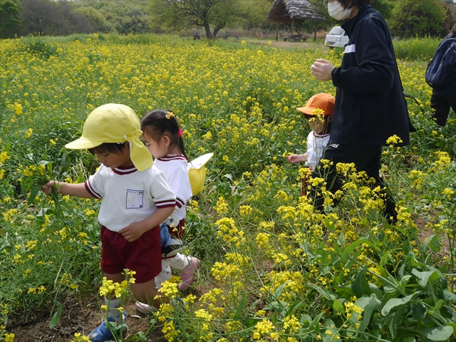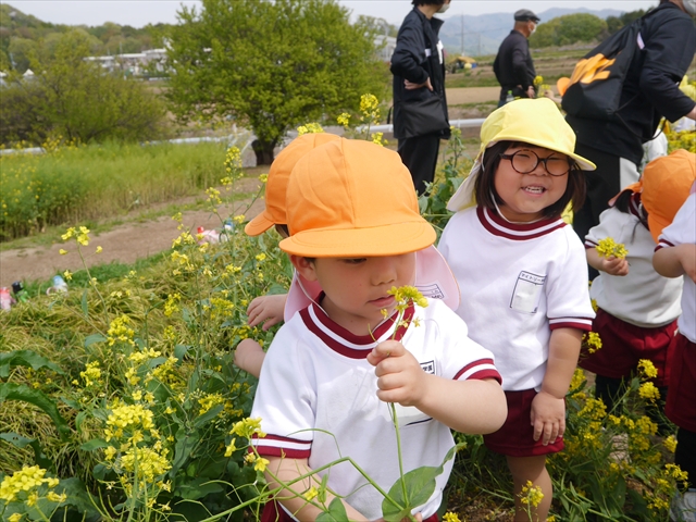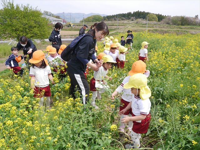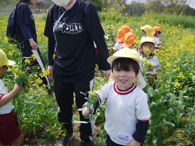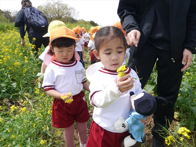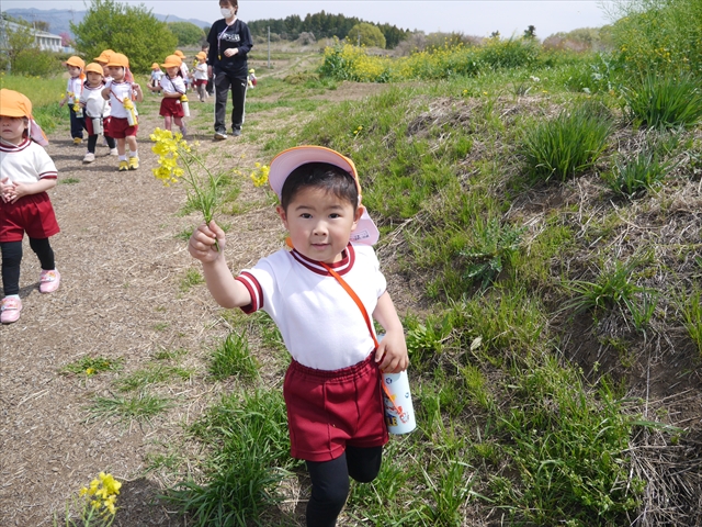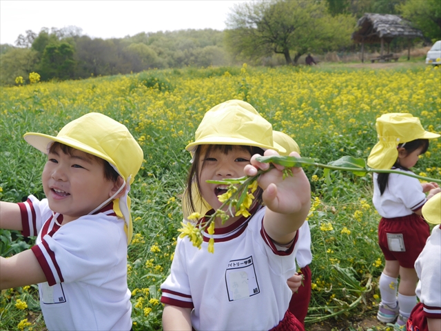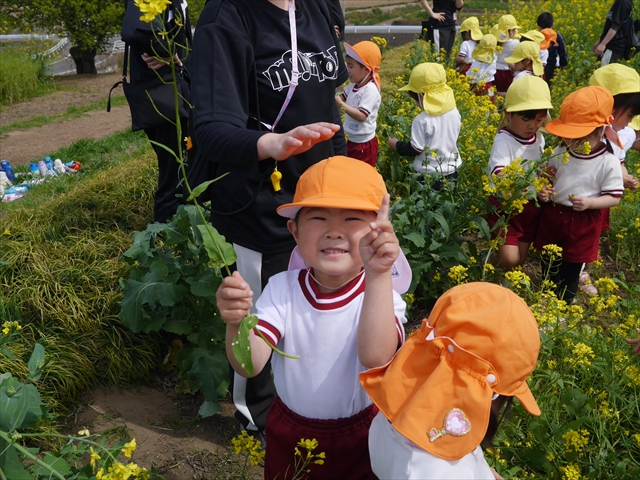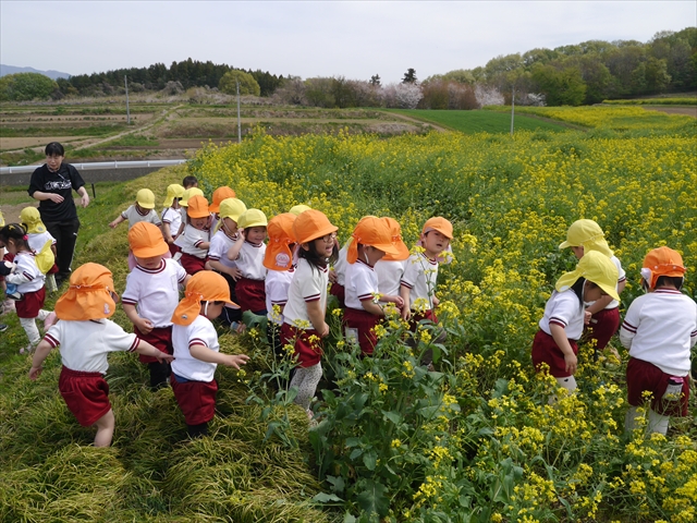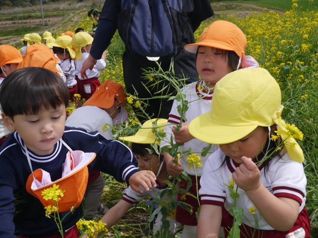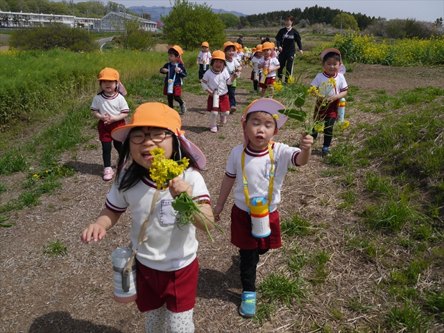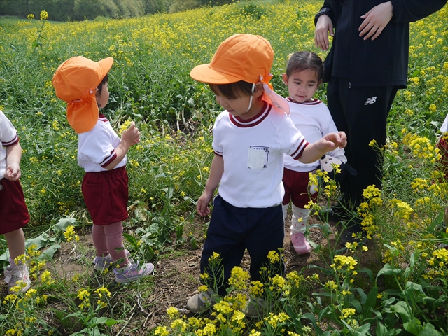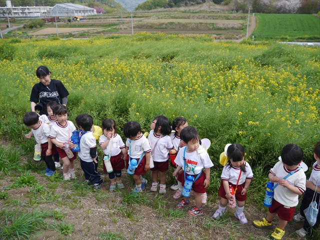 ここ数日春の暖かな日が続きますが、今日も朝から暖かく春の散歩には丁度良い天気でした。今日は、自然体験学習第2弾として、 絶好のお散歩日和の中、 年少組の「菜の花見学・菜の花畑散策」を行いました。鹿田山の清水新沼一帯の菜の花畑もそろそろ終わりを迎えつつありますが、まだまだたくさんの菜の花が咲いており、たくさんの人が散策に来て駐車場も満杯に近い状況でした。 年少組にとっては、今回幼稚園に入園して初めてのバスに乗っての園外散歩でした。畑いっぱいの菜の花の間を散歩し、記念写真を撮り、「自由時間の遊びの時間」では、 今日は、「菜の花刈り取りの方」がいたので、お願いして菜の花畑の中で遊ぶことを許可していただきました。なので、みんな大はしゃぎで菜の花畑の間を歩き回り、菜の花の匂いを嗅ぎ、菜の花と戯れていっぱい遊びました。また、菜の花を摘んで、ママへのプレゼントにするんだという子どもたちもいました。えらい!とにかくみんな汗ばむような陽気の中、絶好のお散歩遊びのひとときとなりました。(*^_^*) (^_^)v