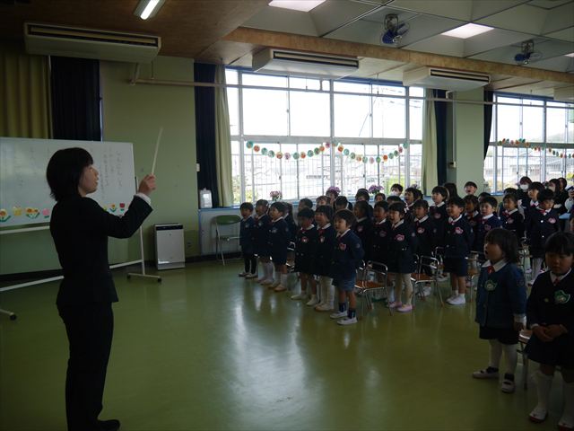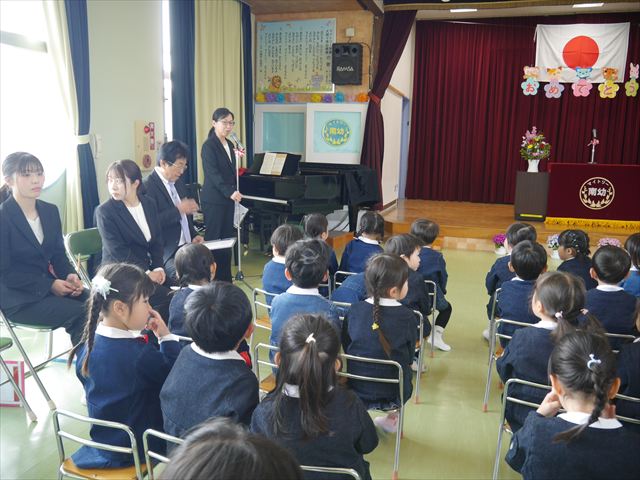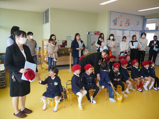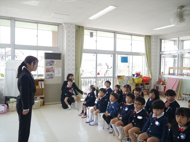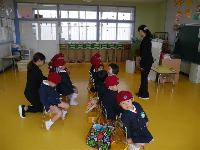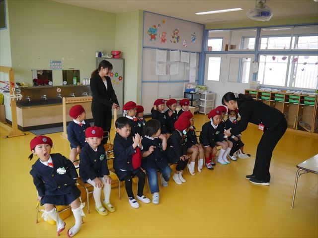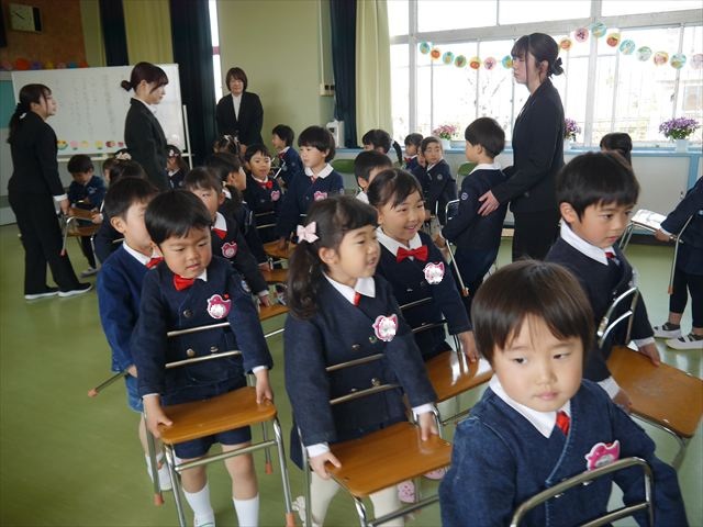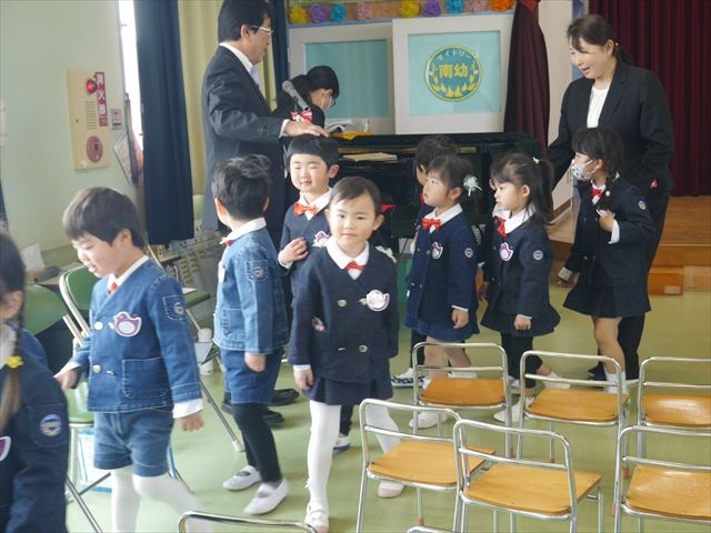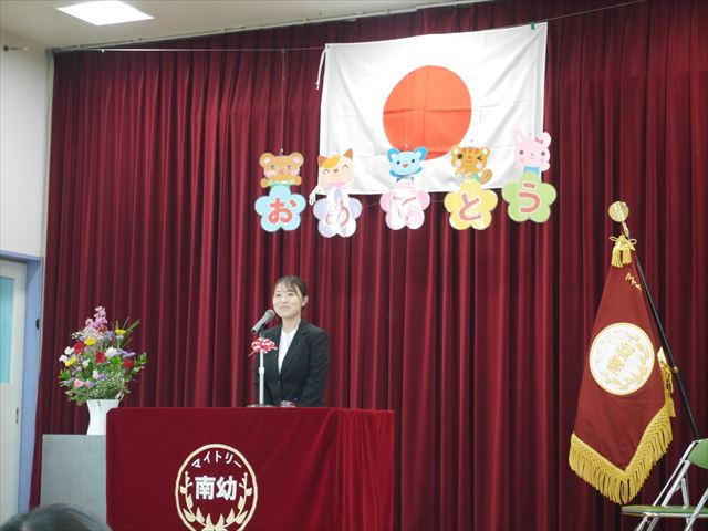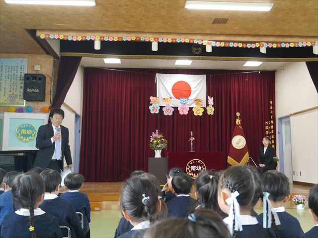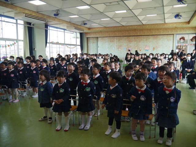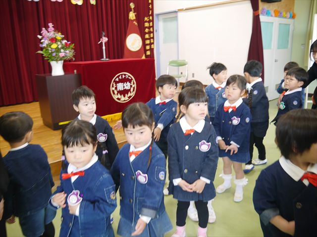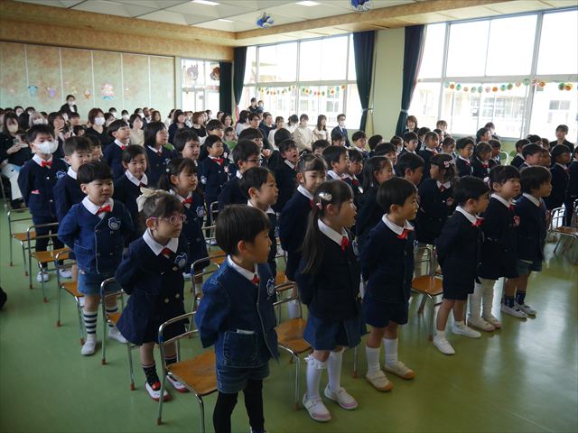 始業式では、園長先生から「みんな一つ学年が上がり、年長さん、年中さんになりました。新しい学年が始まり、いろいろ期待したり、わくわくどきどきしたり、心配したりすることがあるかもしれないけど、大丈夫!大間々南幼稚園の先生はいい先生ばかりで、みんなをいっぱい応援してくれるから安心して下さい。そして友達もいい子ばかりだから、楽しい1年になります。だから、とにかくみんなは元気に登園して、友だちと仲良くいっぱい遊んで、いろいろなことに逃げずに自分からどんどん取り組んで頑張っていって下さい。」と話しがありました。子どもたちは元気に「はい!」と答えてくれました。みんな期待してますよ!そのあと、担任・職員紹介がありましたが、詳細は園だより第1号をご覧下さい。m(_ _)m