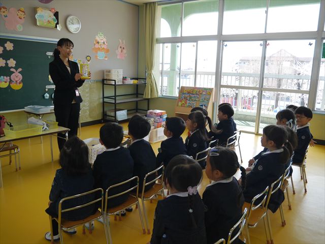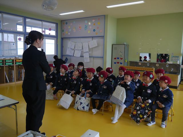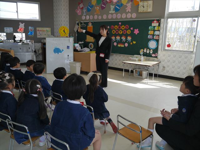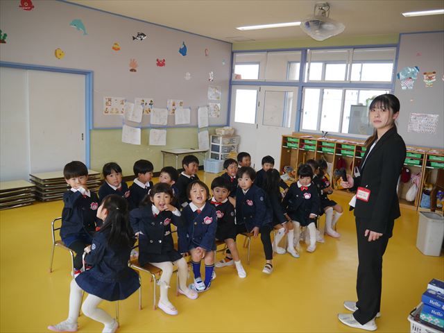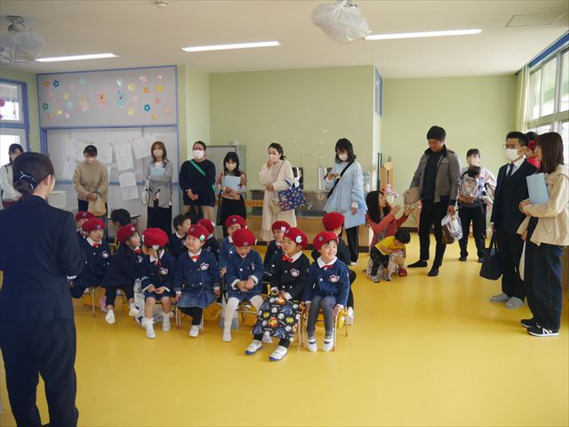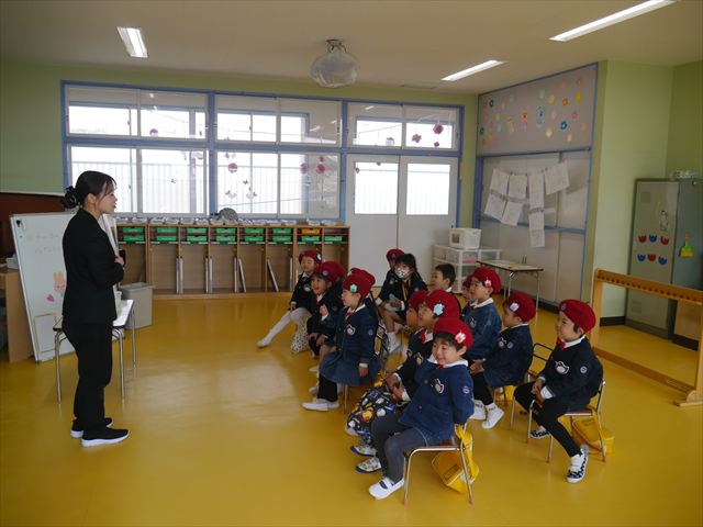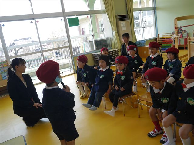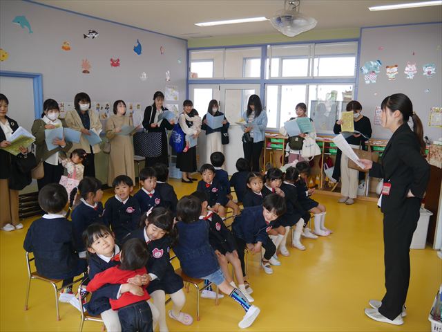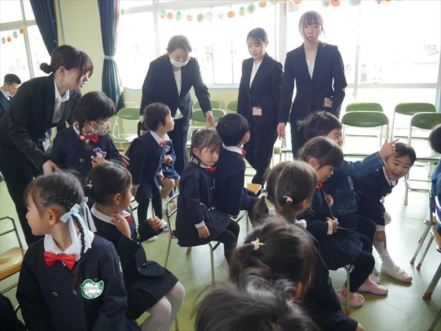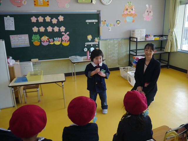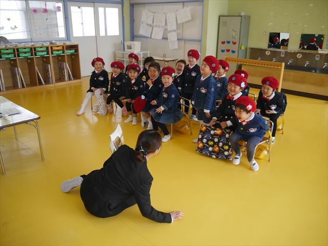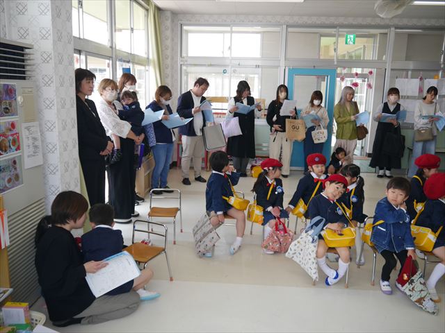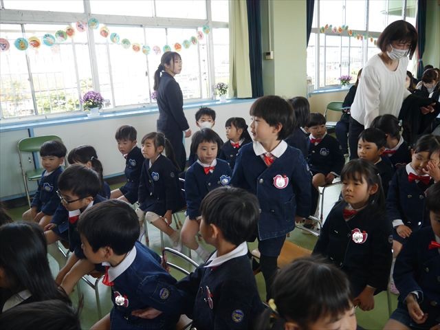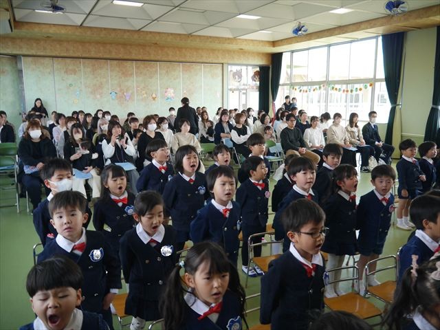 始業式では、園長先生から「みんな一つ学年が上がり、年長さん、年中さんになりました。新しい学年が始まり、いろいろ期待したり、わくわくどきどきしたり、心配したりすることがあるかもしれないけど、大丈夫!大間々南幼稚園の先生はいい先生ばかりで、みんなをいっぱい応援してくれるから安心して下さい。そして友達もいい子ばかりだから、楽しい1年になります。だから、とにかくみんなは元気に登園して、友だちと仲良くいっぱい遊んで、いろいろなことに逃げずに自分からどんどん取り組んで頑張っていって下さい。」と話しがありました。子どもたちは元気に「はい!」と答えてくれました。みんな期待してますよ!そのあと、担任・職員紹介がありましたが、詳細は園だより第1号をご覧下さい。m(_ _)m