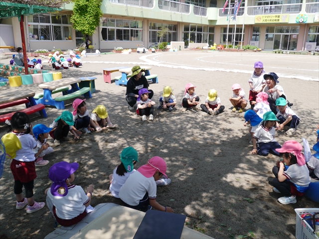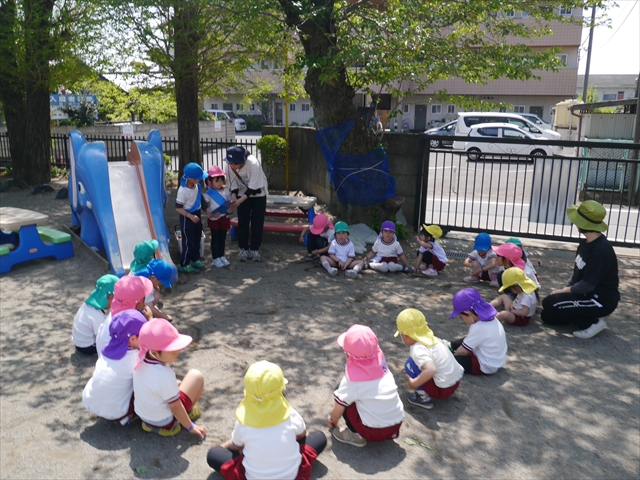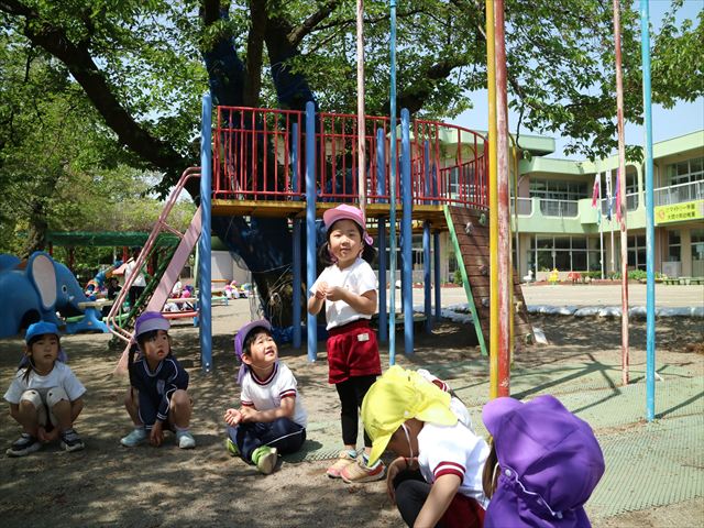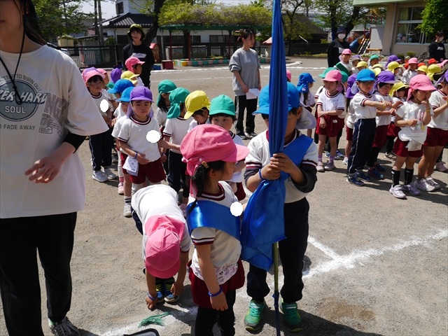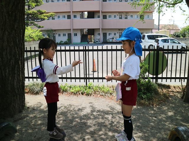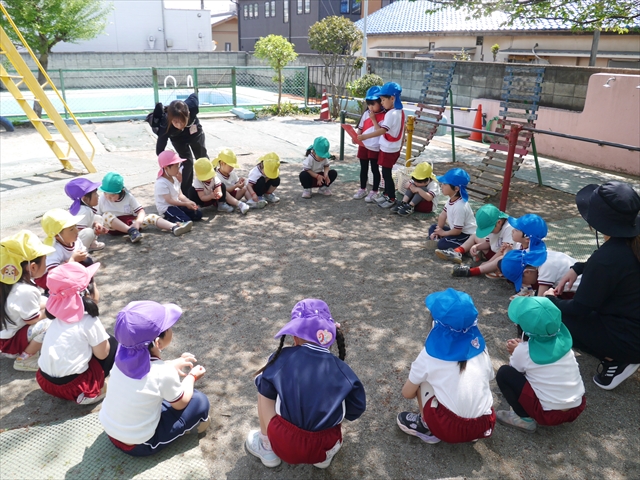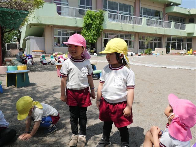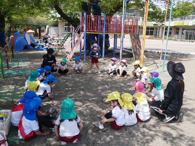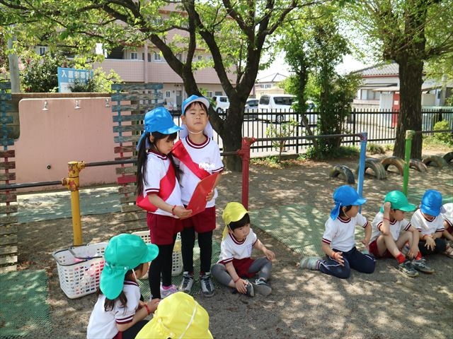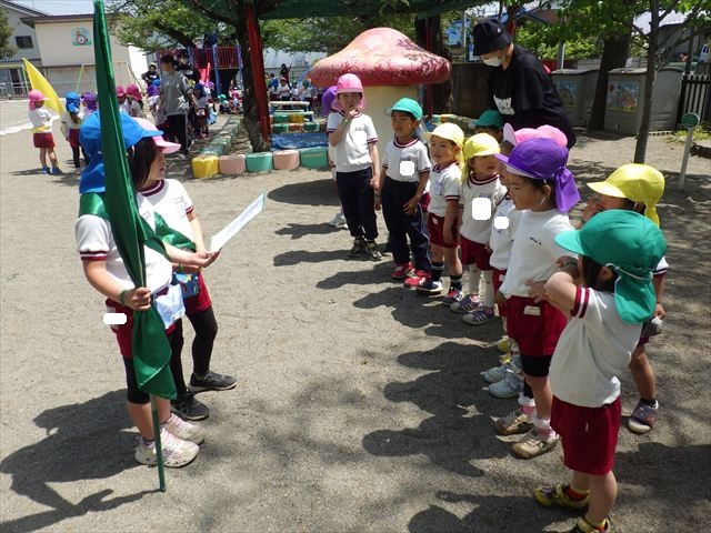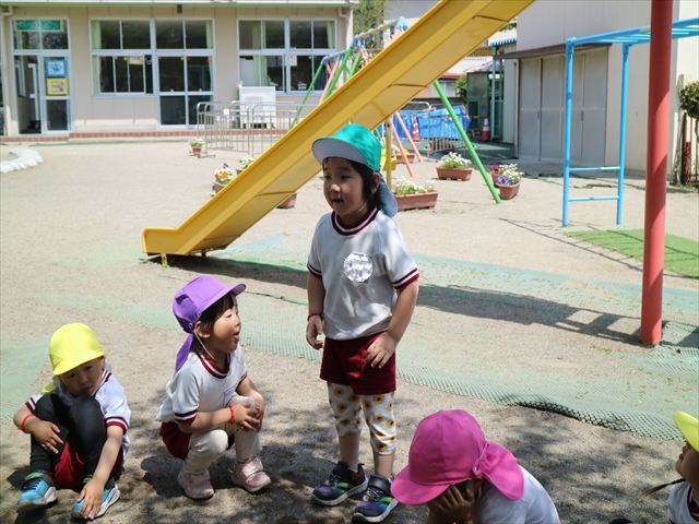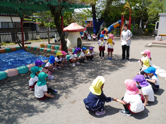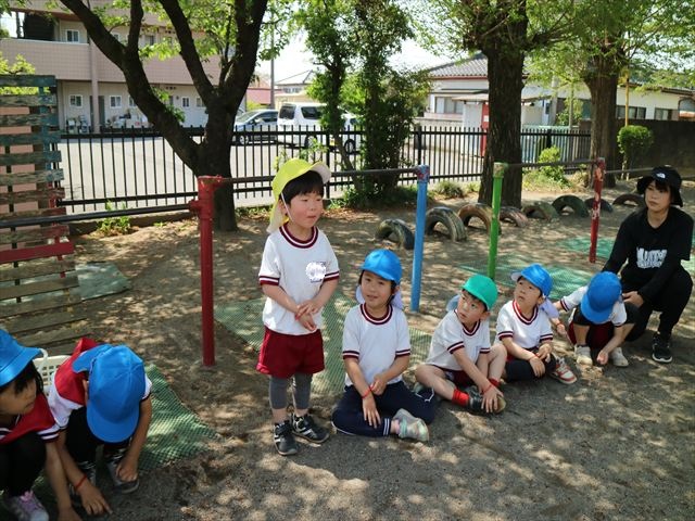 全園児・全職員が4グループの縦割り班(レッド・イエロー・ブルー・グリーン)に分かれ、それぞれのグループで先生も子どもたちも全員自己紹介をし、今日の活動する内容(バディの子と一緒に自由遊びをしよう!)を確認して、年長さんがリーダーとなって年中さんや年少さんの面倒を見ながら実践しました。そして、その後はバディの子たちどうし、気持ち良い好天の中、思い思いに好きな遊びを存分に楽しみました。なお、たんぽぽさんたちは、もう少し園になれてからの第3回《7/3(木)》から参加します。(^_^)b