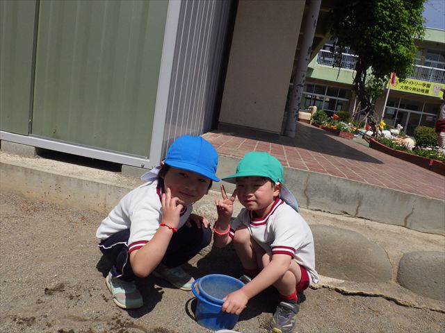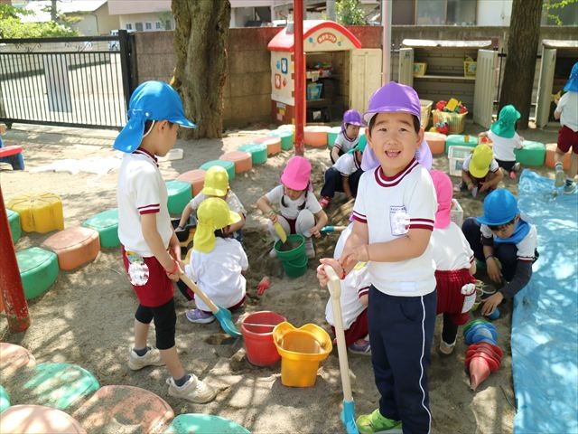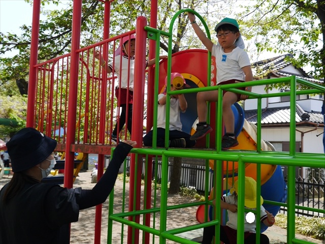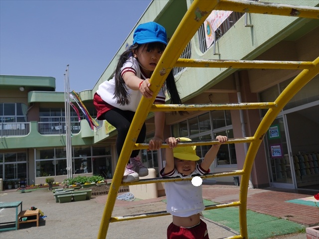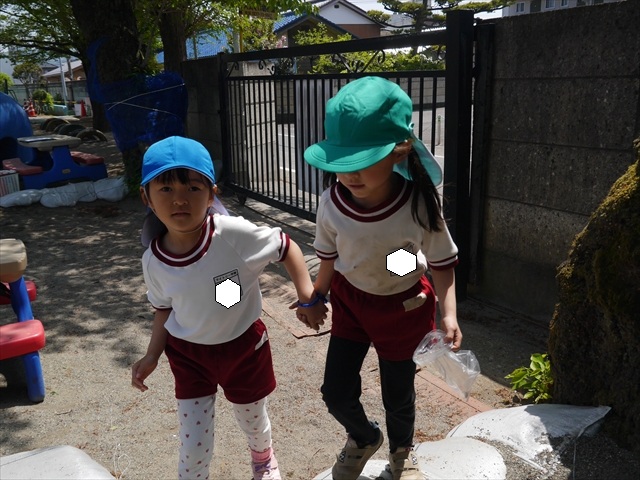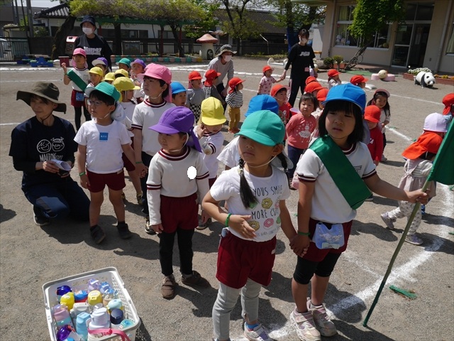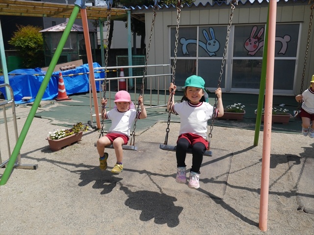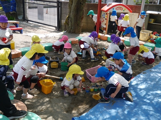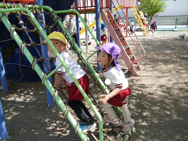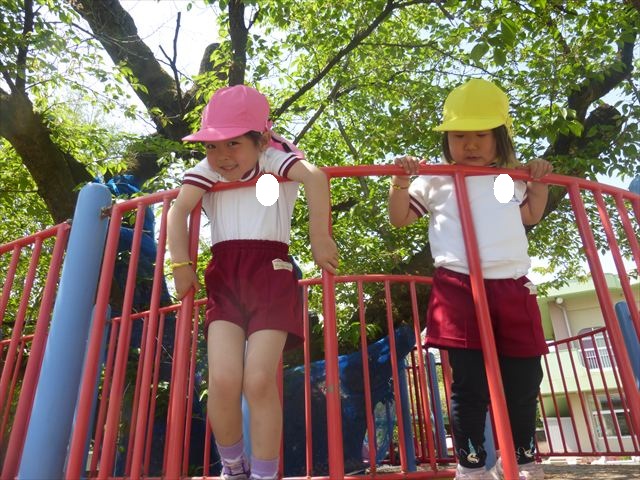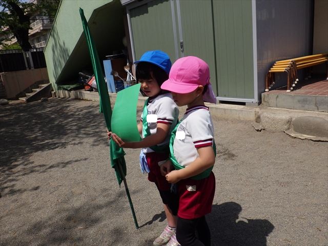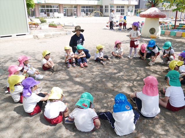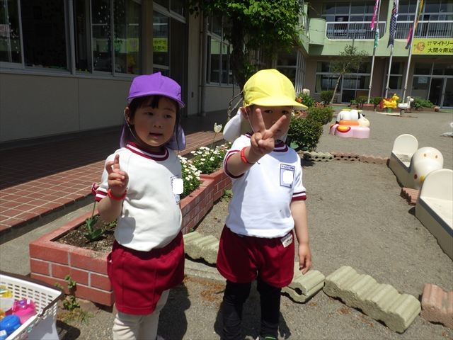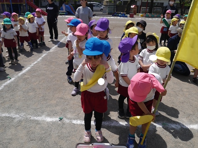 全園児・全職員が4グループの縦割り班(レッド・イエロー・ブルー・グリーン)に分かれ、それぞれのグループで先生も子どもたちも全員自己紹介をし、今日の活動する内容(バディの子と一緒に自由遊びをしよう!)を確認して、年長さんがリーダーとなって年中さんや年少さんの面倒を見ながら実践しました。そして、その後はバディの子たちどうし、気持ち良い好天の中、思い思いに好きな遊びを存分に楽しみました。なお、たんぽぽさんたちは、もう少し園になれてからの第3回《7/3(木)》から参加します。(^_^)b