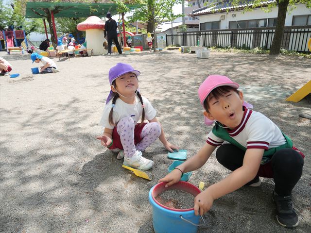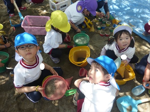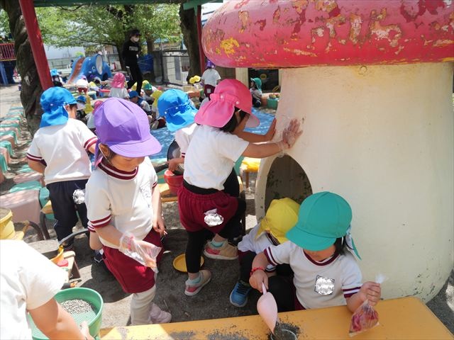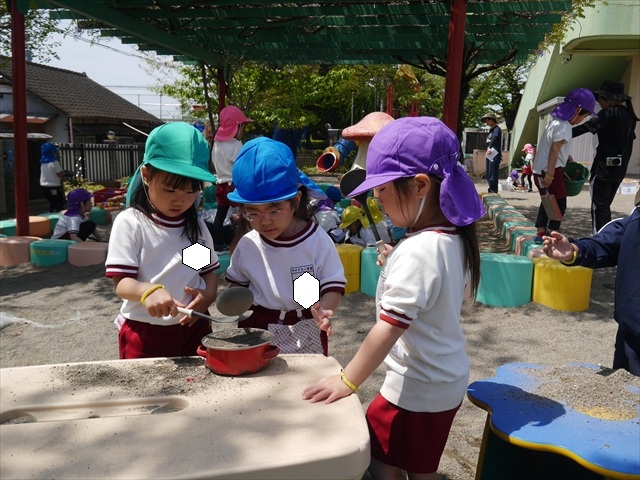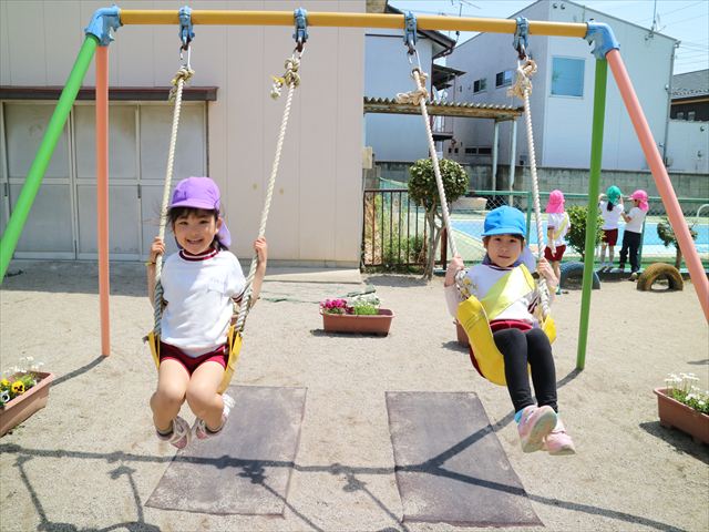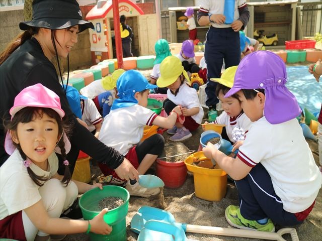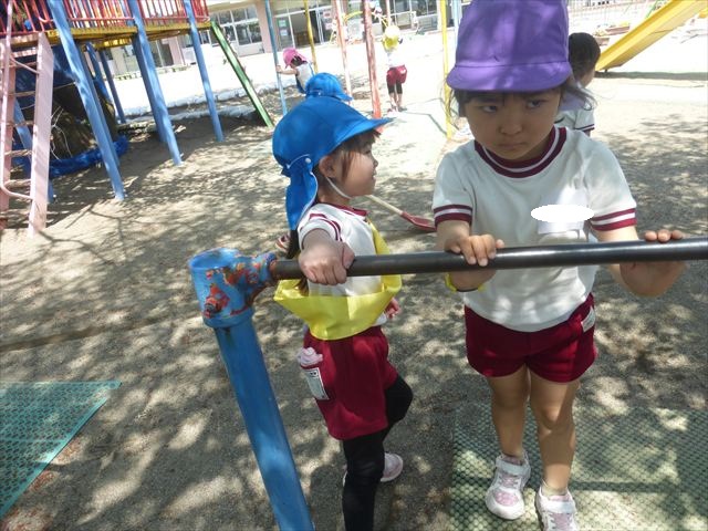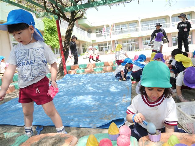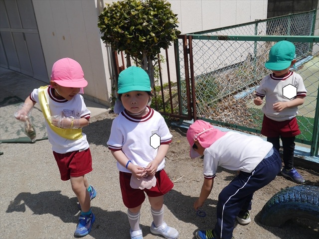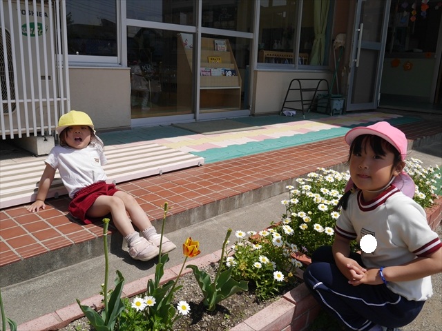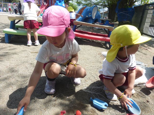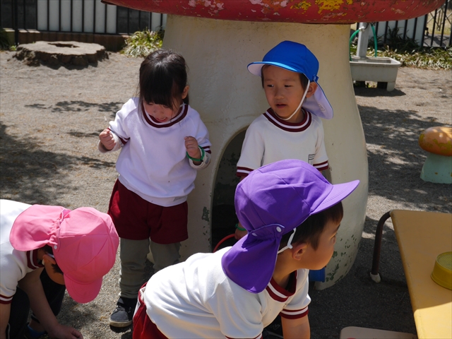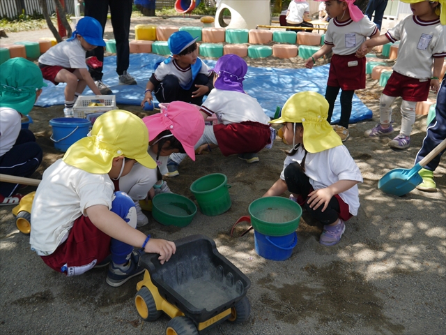 全園児・全職員が4グループの縦割り班(レッド・イエロー・ブルー・グリーン)に分かれ、それぞれのグループで先生も子どもたちも全員自己紹介をし、今日の活動する内容(バディの子と一緒に自由遊びをしよう!)を確認して、年長さんがリーダーとなって年中さんや年少さんの面倒を見ながら実践しました。そして、その後はバディの子たちどうし、気持ち良い好天の中、思い思いに好きな遊びを存分に楽しみました。なお、たんぽぽさんたちは、もう少し園になれてからの第3回《7/3(木)》から参加します。(^_^)b