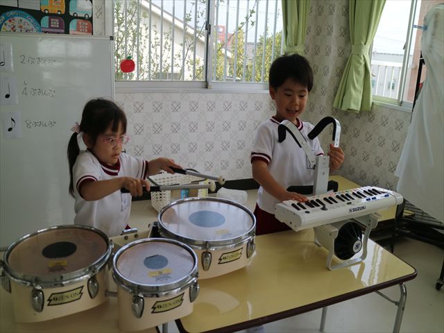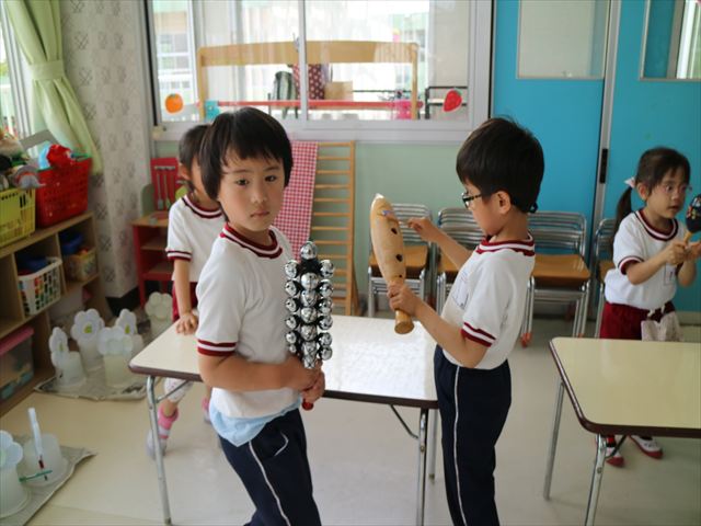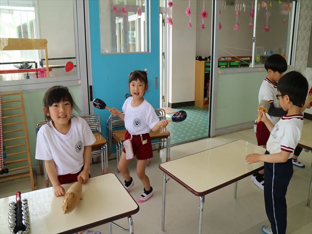 今日は朝礼の後、縦割り保育活動の前に、縦割り保育活動の体系で「朝の体操」を行いました。毎週火曜日と金曜日の朝は、「体操」の時間があります。今年度1学期の朝の体操は、「ラララ!トロピカーニバル!」という体操です!熱帯的なお祭りの雰囲気のような振り付けを取り入れながら、いろいろな動作やポーズを楽しむ体操だそうです。先生方は、過日特訓していたので、さすが模範体操演技が大変上手でした!(^_^;)