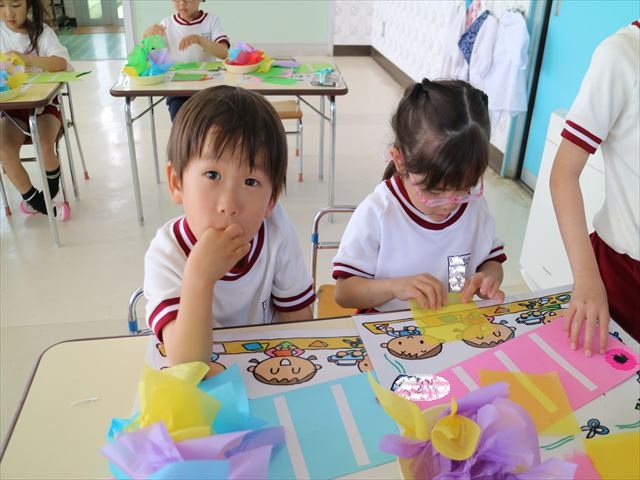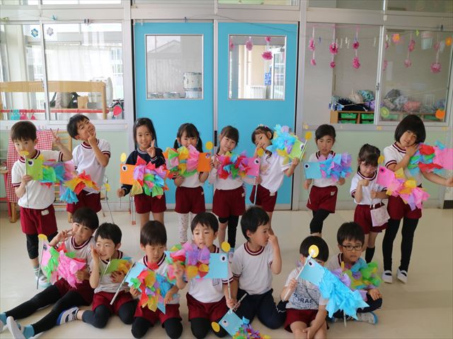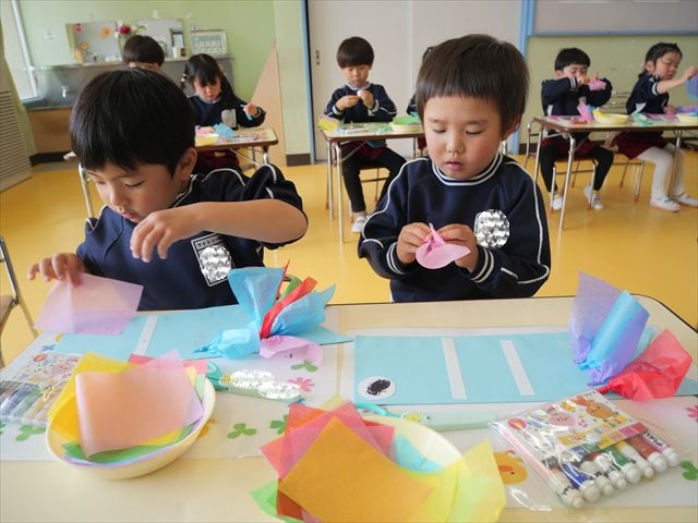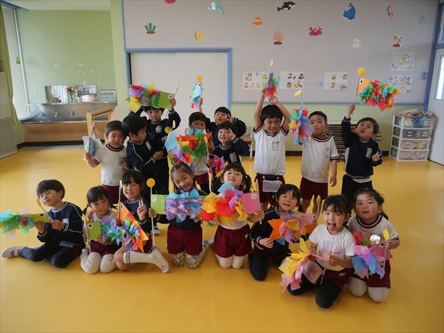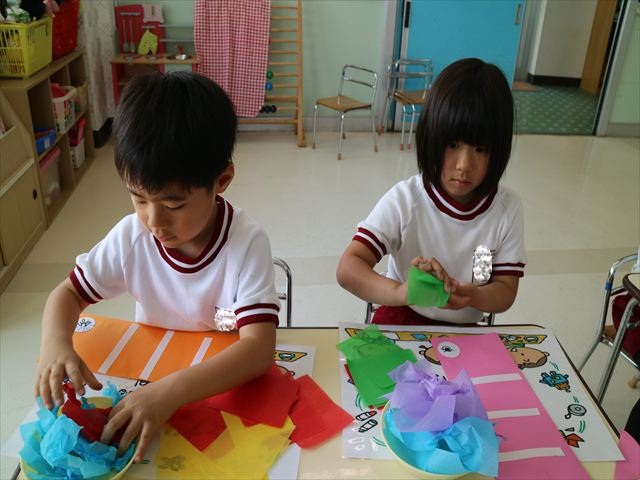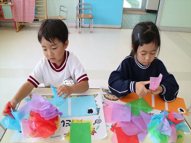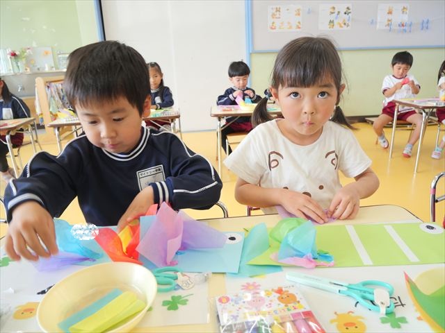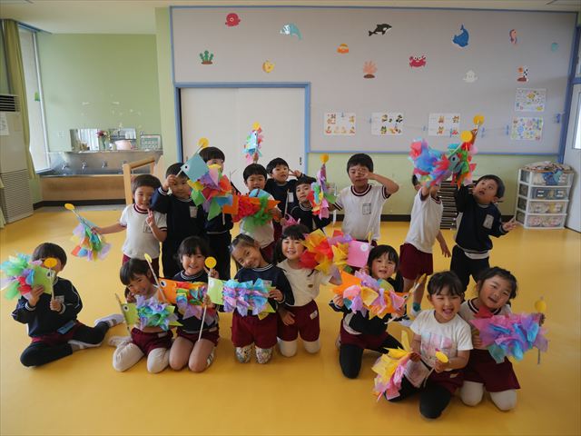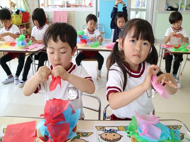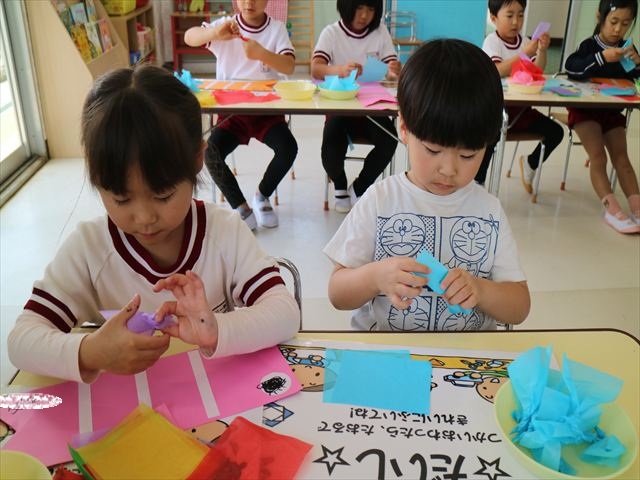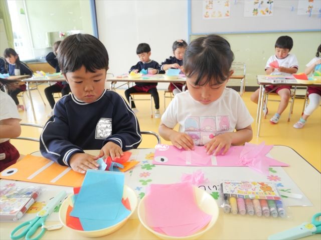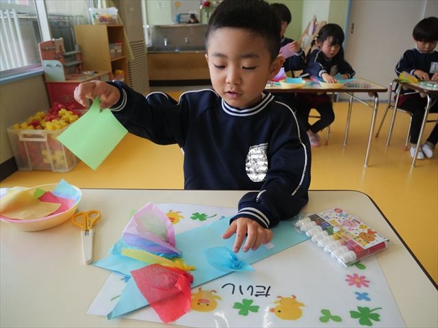 今日は個人用の鯉のぼりを作りました!今回は指先を使ってお花紙をねじることを主な作業とした製作でした。初めの方は、お花紙が上手くねじれなかったり、画用紙にお花紙をくっつけていく作業に苦戦する姿も見られましたがだんだんとコツを掴んだようで、裏側はスムーズに進められていました!好きな色の画用紙、好きな色のお花紙を使ってオリジナルの鯉のぼりが作れて子どもたちは完成した鯉のぼりに満足した様子でした! とってもカラフルで可愛らしい鯉のぼりがたくさん出来ました(^^)