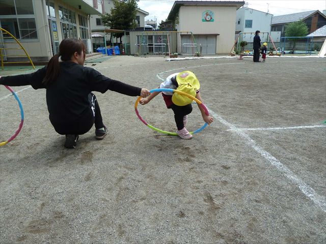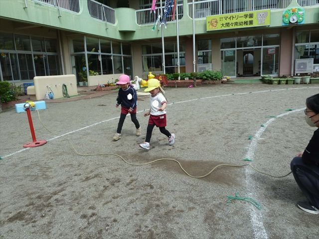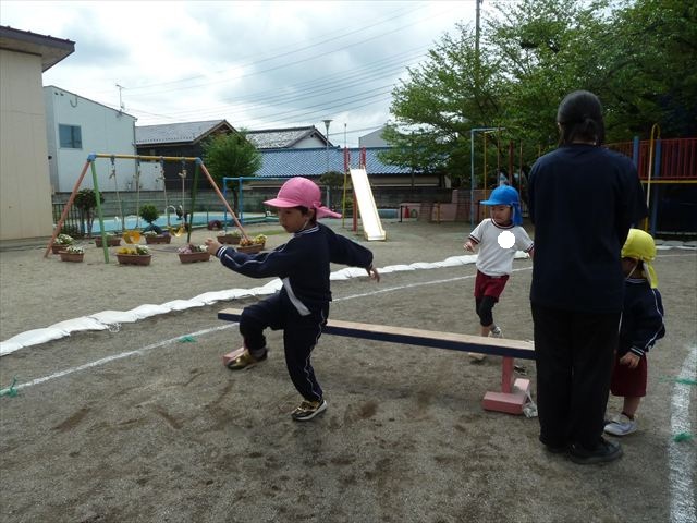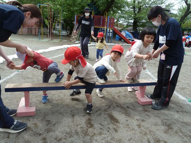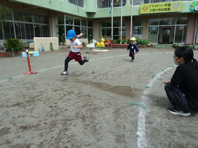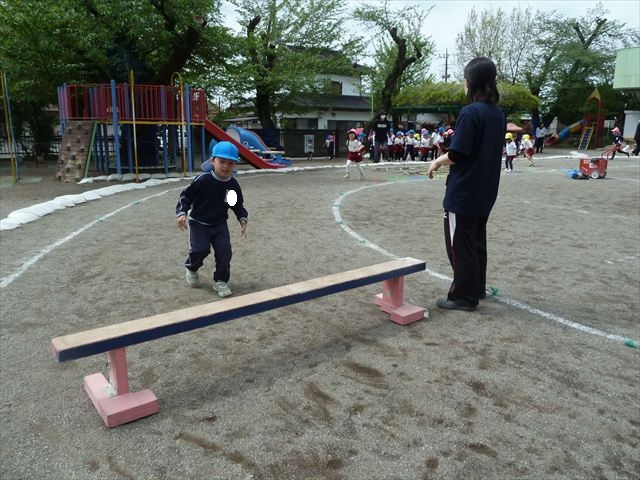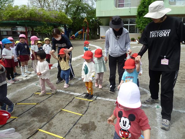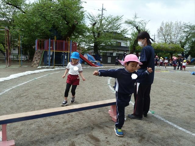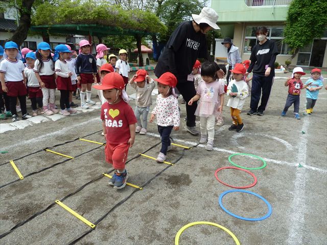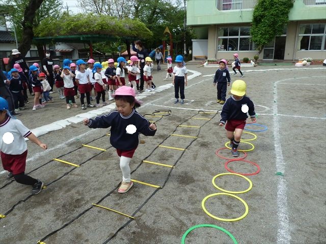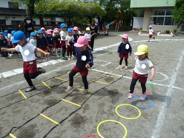 今日は今年度初めてのサーキットトレーニング1でした!まずラダーや輪っかを使ってジャンプをして、次に平均台を飛び越え、次にフラフープを屈んで通り抜け、最後に縄を使ってくねくねする縄を飛び越えるヘビジャンプをしてゴールというコースでやってみました!初めてのコースで、初めは戸惑う姿もありましたが、だんだんと慣れてきて最後の方には笑顔でゴール出来る子が増えました!たんぽぽ組のお友達も初めてのサーキットトレーニングの子が多くいましたが、うさぎさんに返信してみんなで可愛くジャンプが出来たり、フラフープの輪を通れたり楽しめたようでした(
