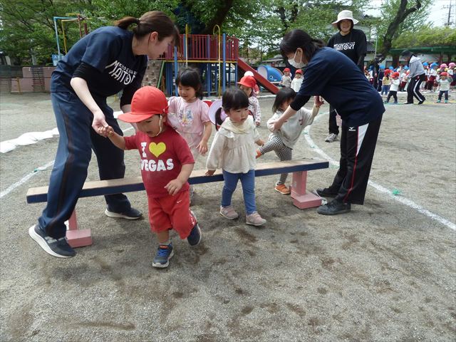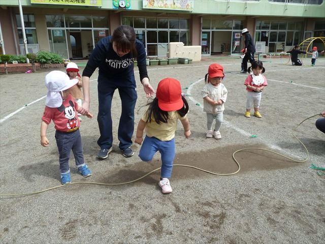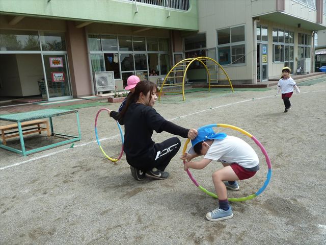今回の自由保育の時間は、うみ組は”新しいクラスの友だちと仲良くなってほしい””ルールのある遊びをみんなで楽しみたい!”と思い、集団遊びをしました。初めに「ねことねずみ」という遊びをしました。白帽子のねこチームと青帽子のねずみチームに分かれて、「ね!」「ね!」と言いながら近づき、先生が「ねこ!」と言ったらねこチームがねずみチームを追いかけて捕まえる、捕まってしまったら相手チームに移動して、最後に人数の多いチームが勝ち!というルールでした。この遊びは先生の言葉をよく聞いていないとできないゲームでしたが、みんなよく聞きながら、ルールを理解して楽しむことが出来ました☆その後は「線の上鬼ごっこ」をしました。白い線の上しか逃げることが出来ない鬼ごっこで、線から落ちないようにバランスを取りながら楽しむことが出来ました!みんないい汗をかきながら「楽しかったね!」「またやろう!」とクラスの中が深まったようでした(^^♪