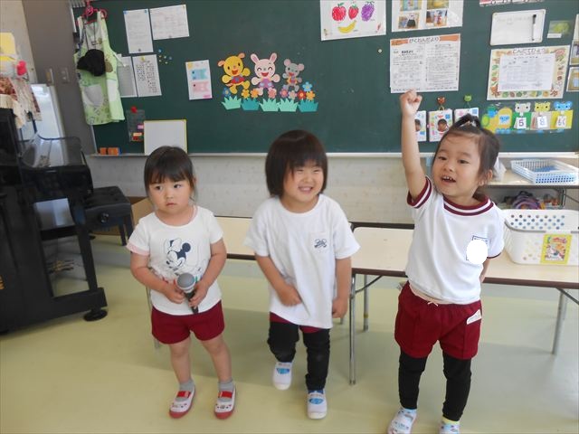 本を読んだ後は、教室で日本太鼓を使ってリズム遊びをしました。バナナ、リンゴなど言葉に合わせてリズムを打ちました。約束を守って正しくバチや太鼓を扱う事が出来ました。