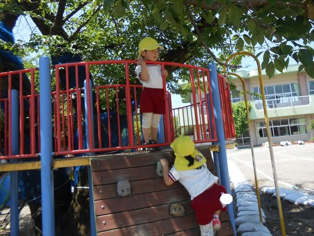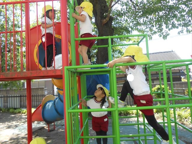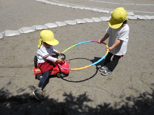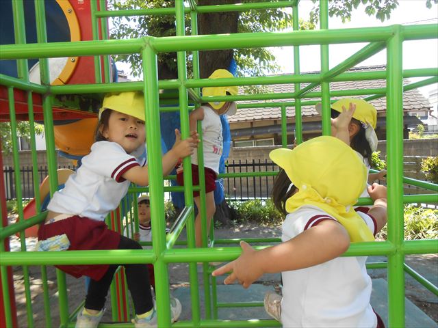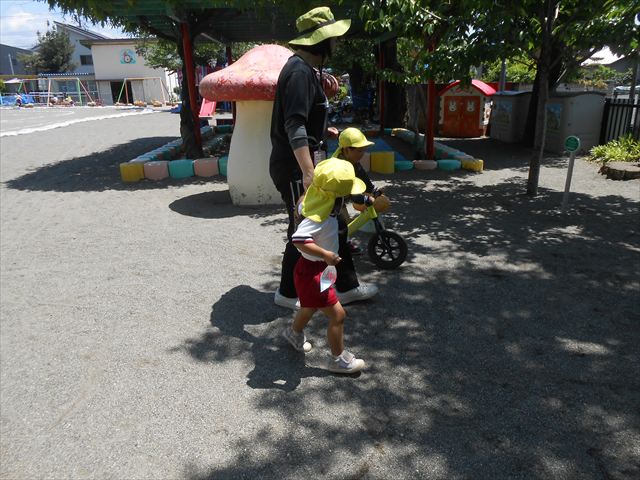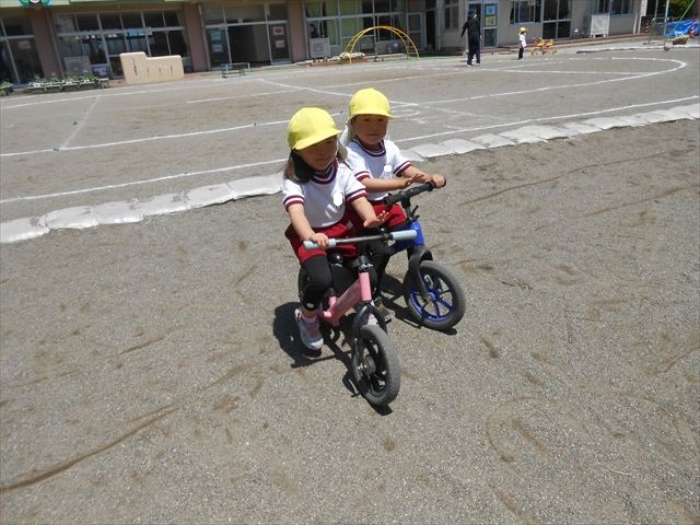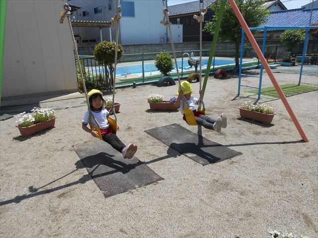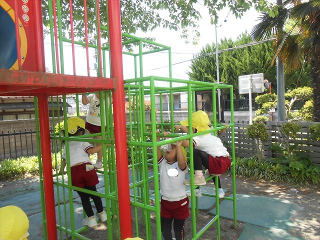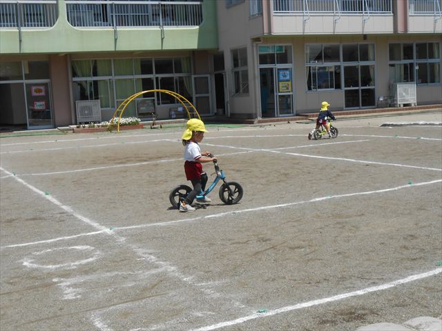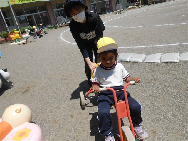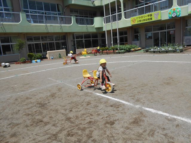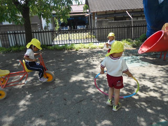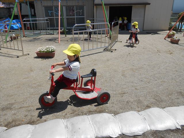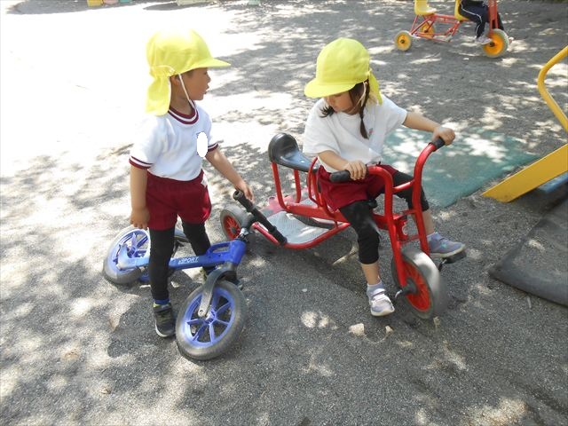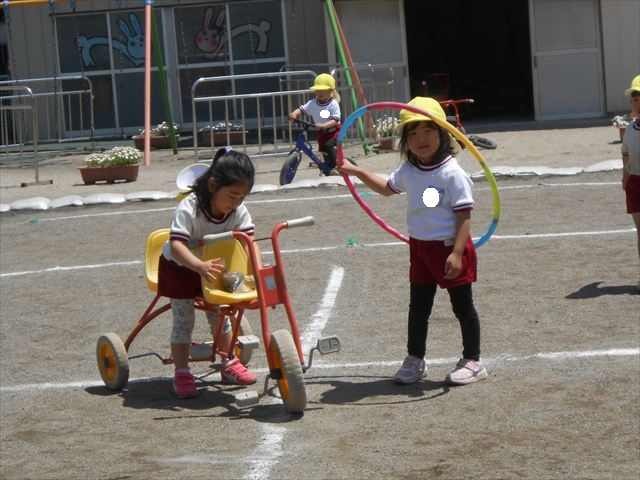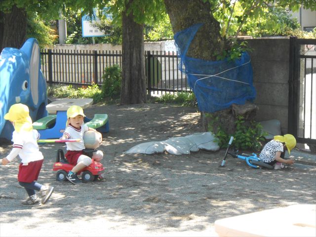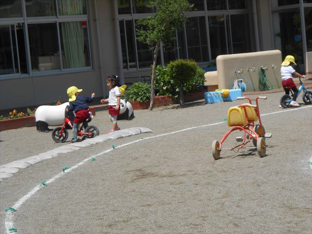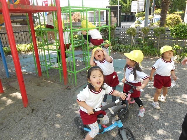 ^^)天気も丁度よくみんな思い思いに遊ぶことができました。自転車に乗ったりバイクに乗ったりブランコ、ジャングルジムで遊んだりと楽しそうな年少さんでした(