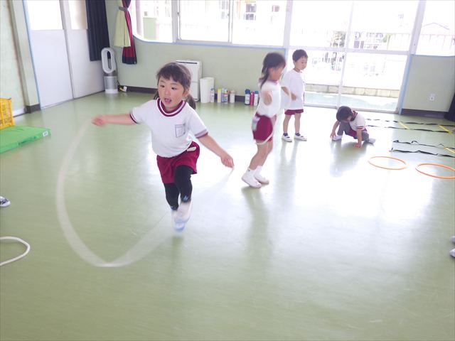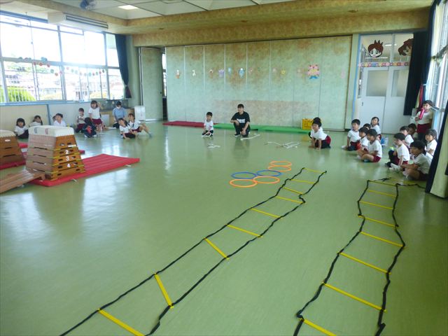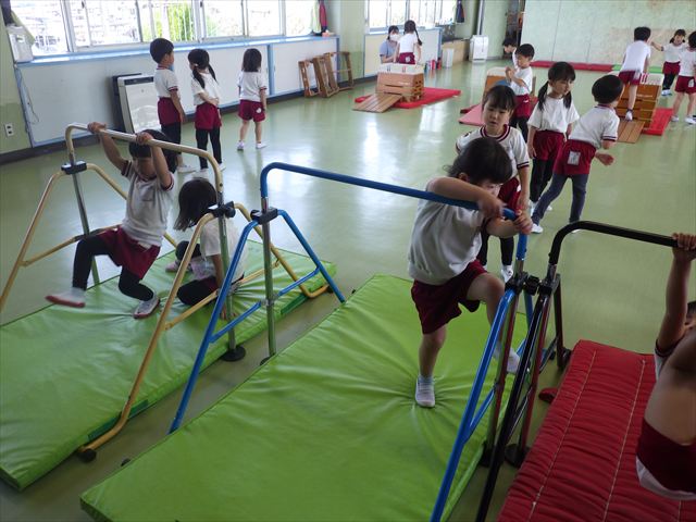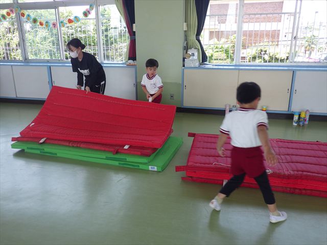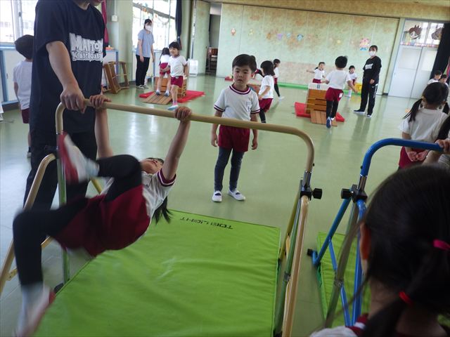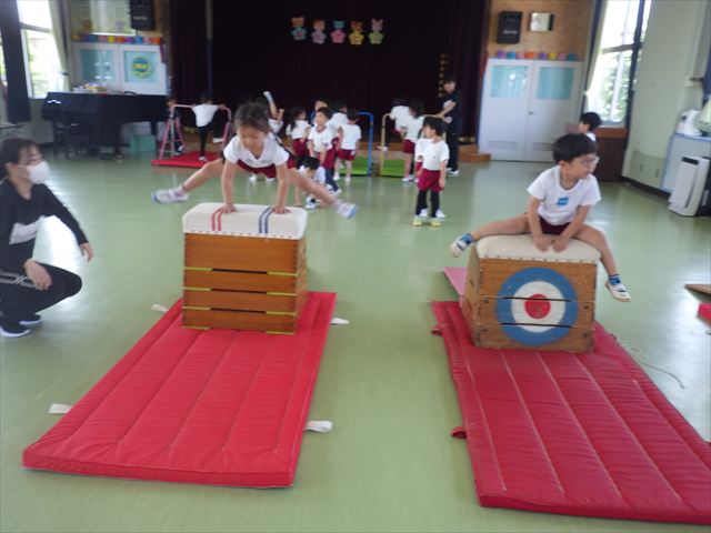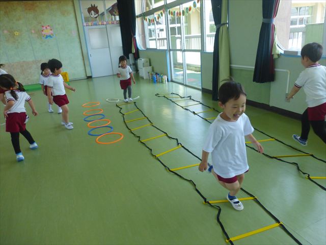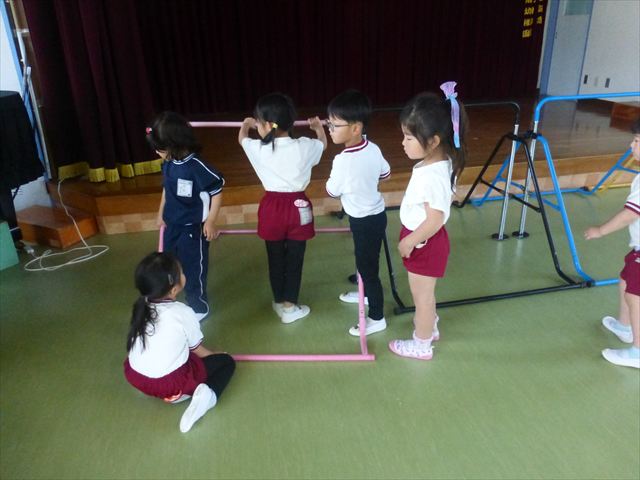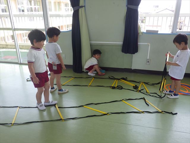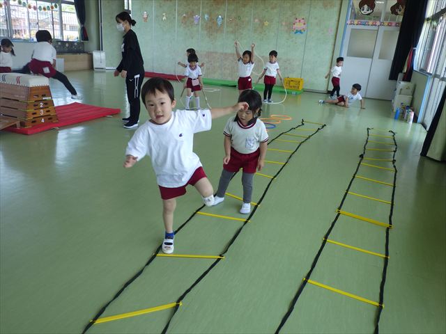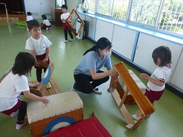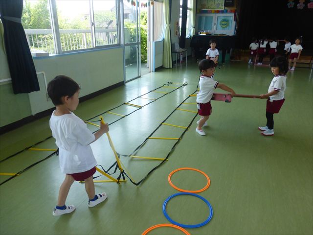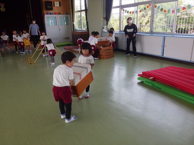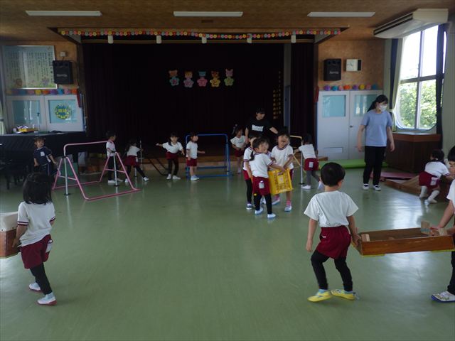 今日の年中組の「主体性の時間」の活動は、運動遊び第2回目として、前回同様いろいろな運動用具を使って運動遊びをしました。前回は、みんなでサーキットコースを作って遊びましたが、今回は自分の取り組みたいものを自分たちで用意して遊びました。途中休憩を入れながら種目変更をして楽しみました。自主的に運動遊びをしたのでみんなとっても楽しそうでした!