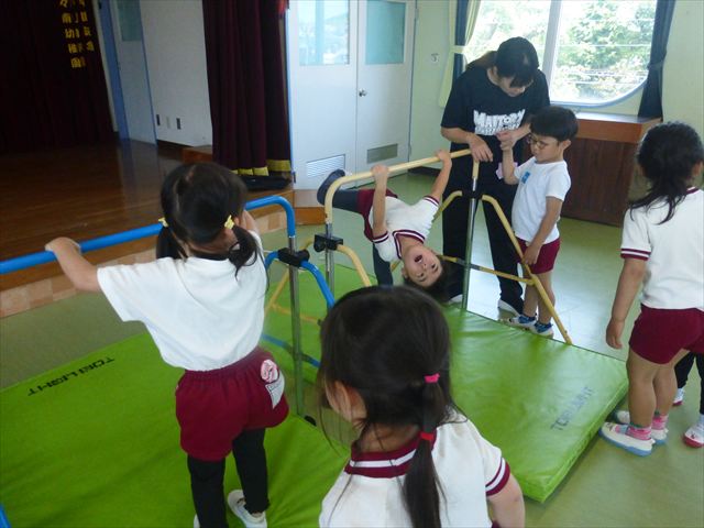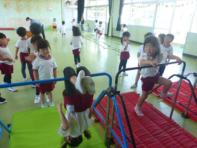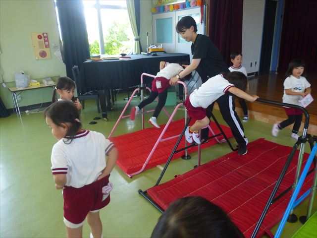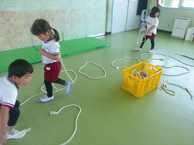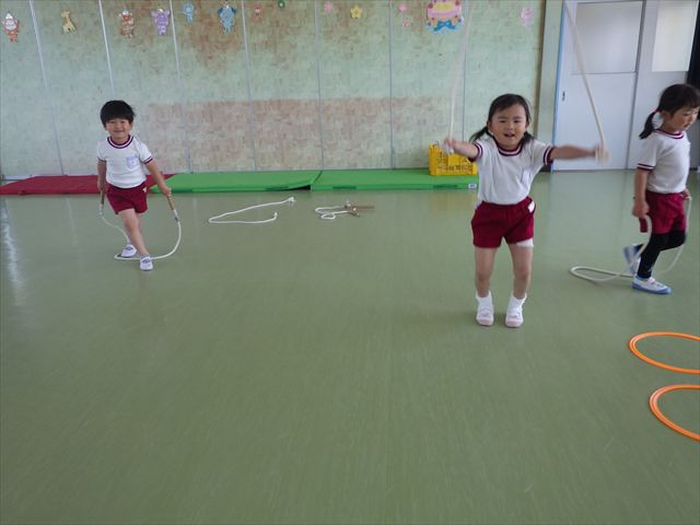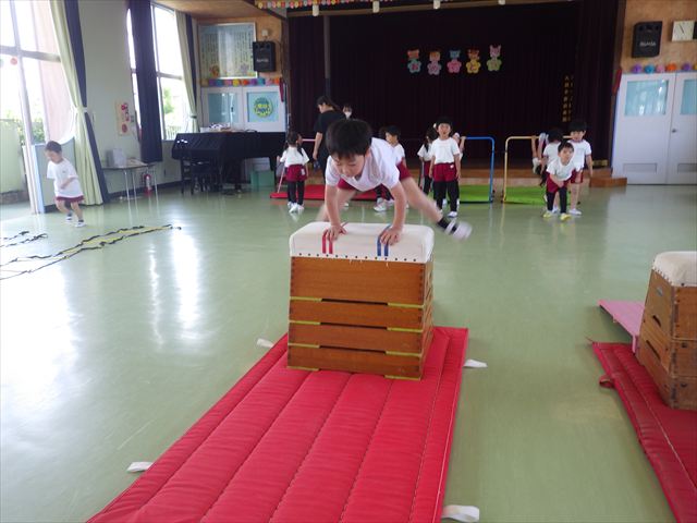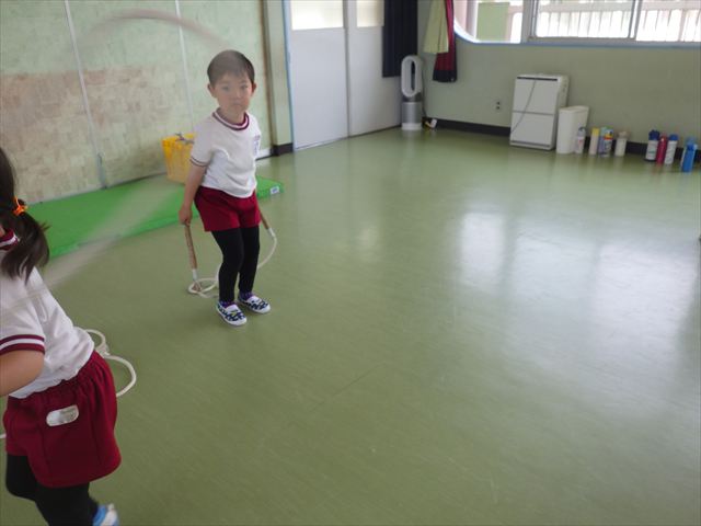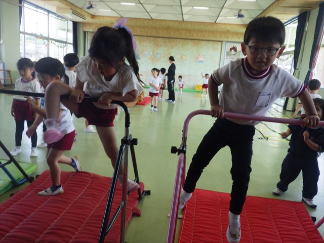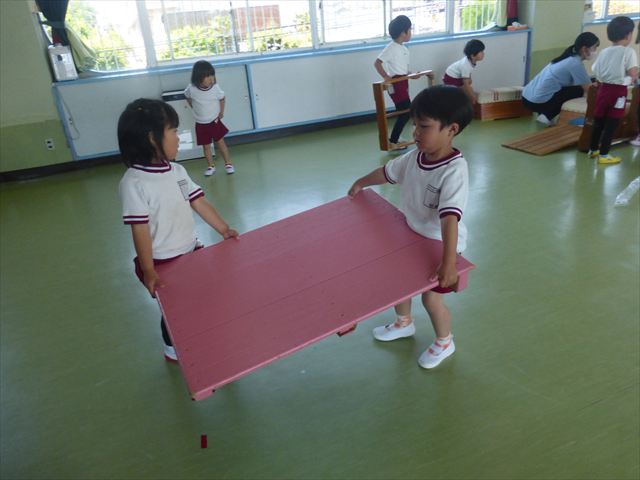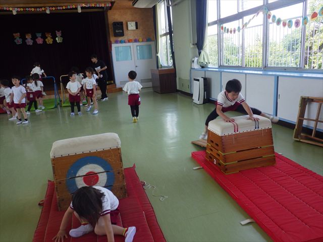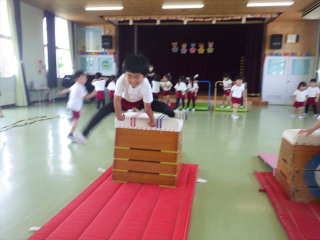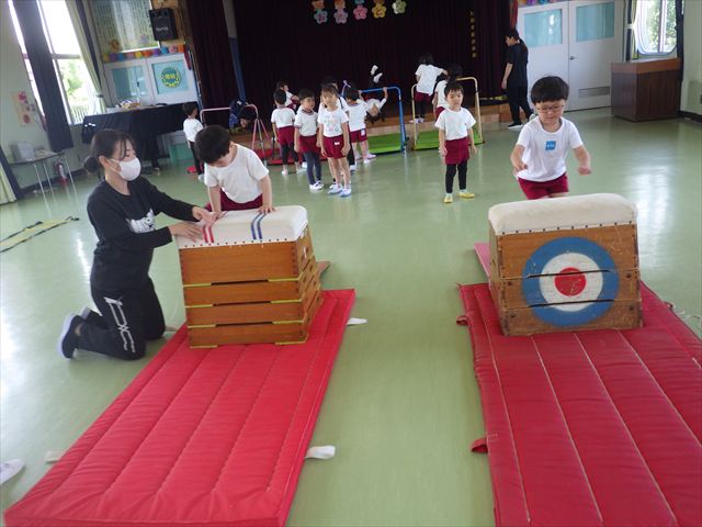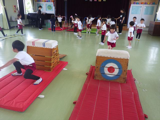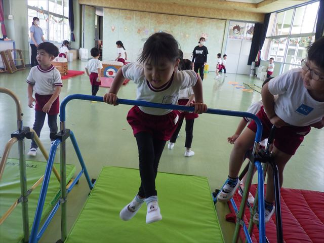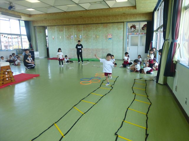 今日の年中組の「主体性の時間」の活動は、運動遊び第2回目として、前回同様いろいろな運動用具を使って運動遊びをしました。前回は、みんなでサーキットコースを作って遊びましたが、今回は自分の取り組みたいものを自分たちで用意して遊びました。途中休憩を入れながら種目変更をして楽しみました。自主的に運動遊びをしたのでみんなとっても楽しそうでした!