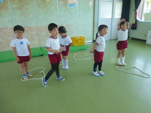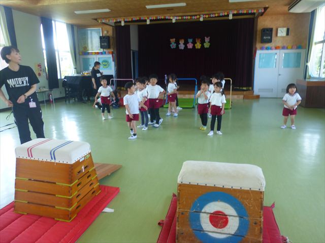 午後は、ともえ先生のリトミックがありました!今回はクラス別で行ないました。赤、青、黄色のボードを使い、まずはみんなで車の運転!信号を見ながら上手に運転できました。その後はボードを使い、背の順に並ぶ練習をしました。音が鳴ったら先生のところに行き、また音が鳴ったら自分のボードに戻ることを繰り返し取り組むうちに、自分の場所が分かりすぐ戻れるようになってきました!ともえ先生、ありがとうございました☆