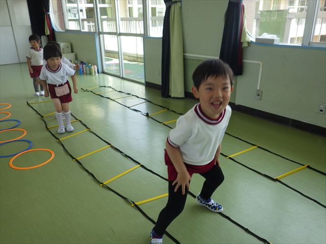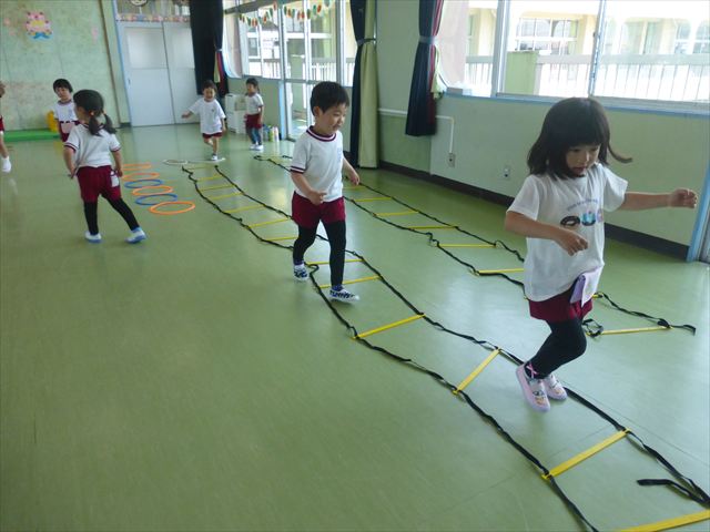 体育の時間では、教室でラダーやコーンを使って体を動かしました!チーム戦の競争などもして楽しめました!