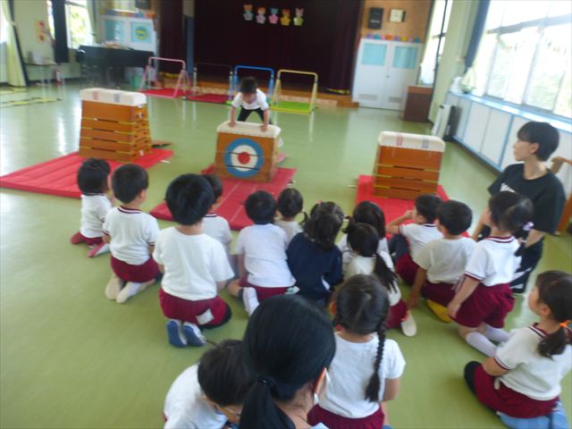 今日は「朝礼」で、園長先生から「今日は昨日と違ってとても暖かくていい天気になりました。今週はずっと夏みたいないい天気が続くので、園庭で元気いっぱい遊んで下さい。」と話がありました。そのあと、幼稚園の先生になるために勉強にきた教育実習生を紹介しました!頑張ってくれると思うので、みんな仲良くして下さい!(^_^) (^_^)b