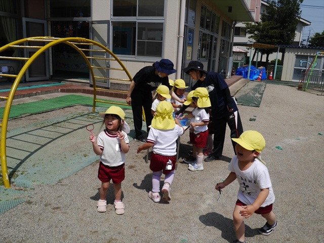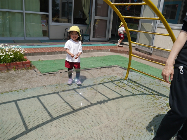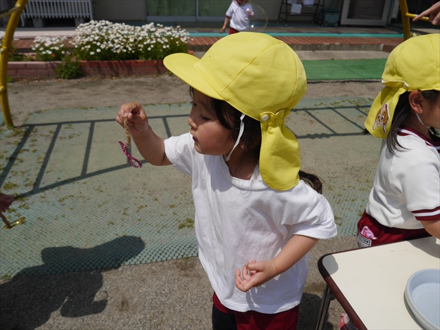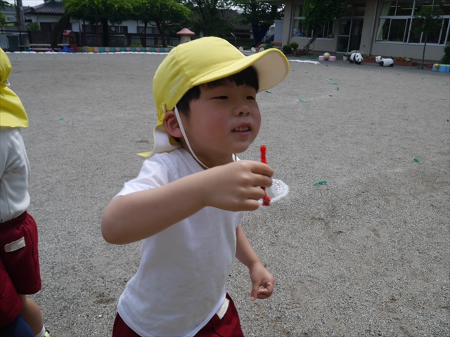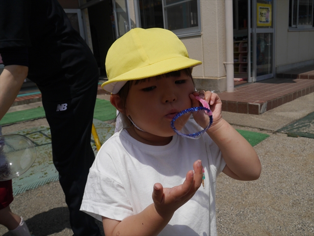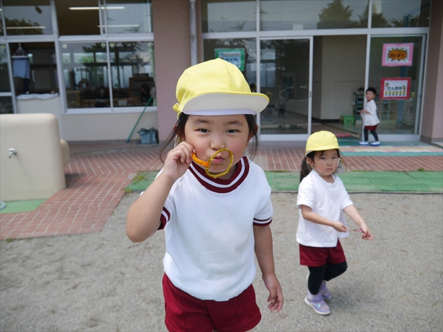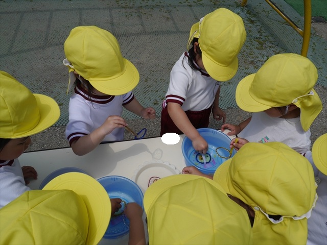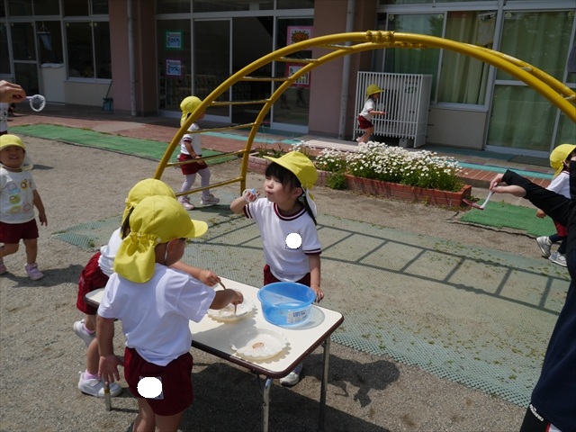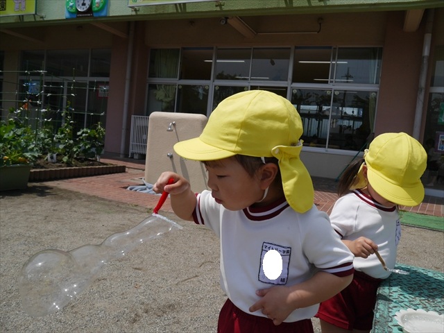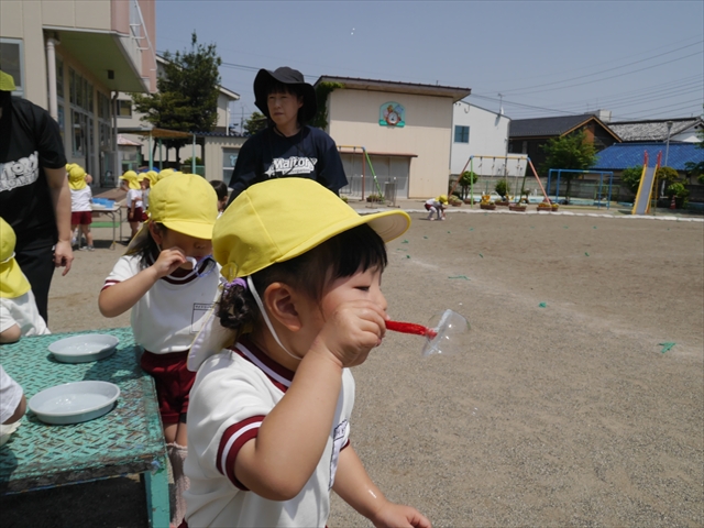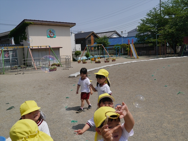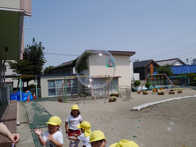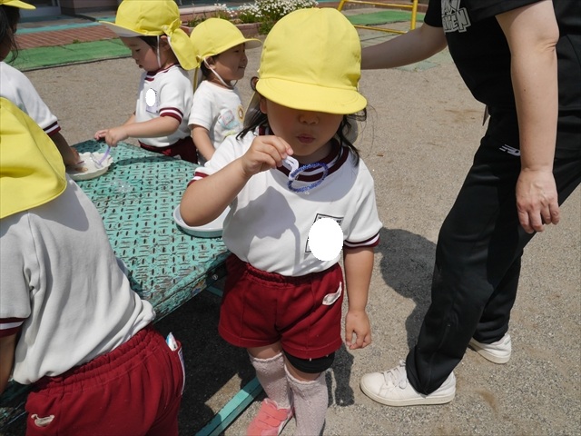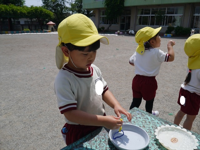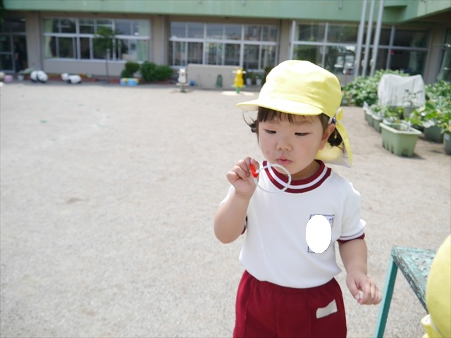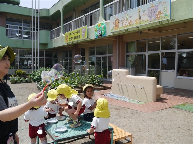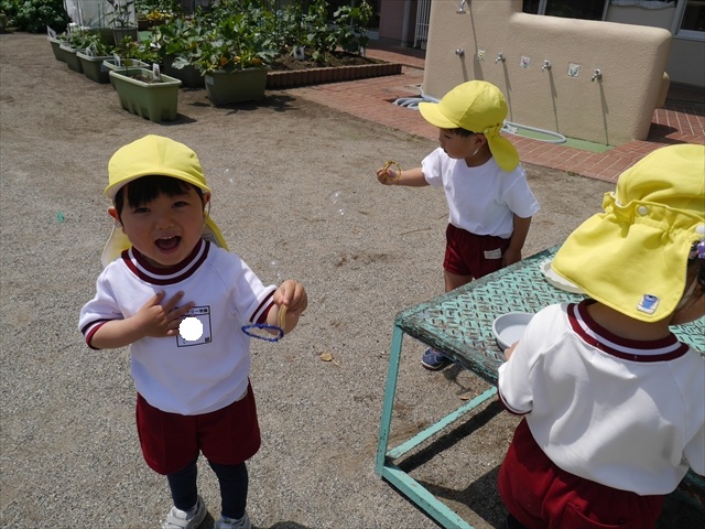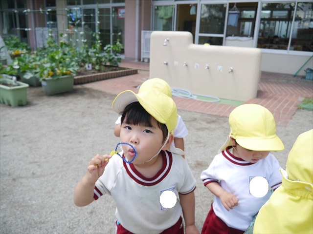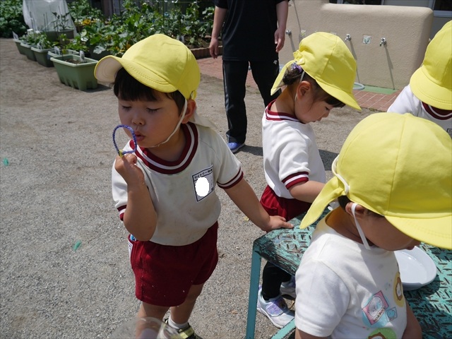 ^^)そして見本を見せると、わぁーすごーい!と大盛りあがりの年少さん。外に出てやってみました!初めは難しい子もいましたが何度かやってみたりお友だちの様子を見て真似したりしながらしゃぼん玉遊びを楽しむことができました。風があると吹かなくても自然としゃぼん玉ができました。飛ばして遊んだり飛んだしゃぼん玉を追いかけたりみんなで楽しむことができてよかったです(
