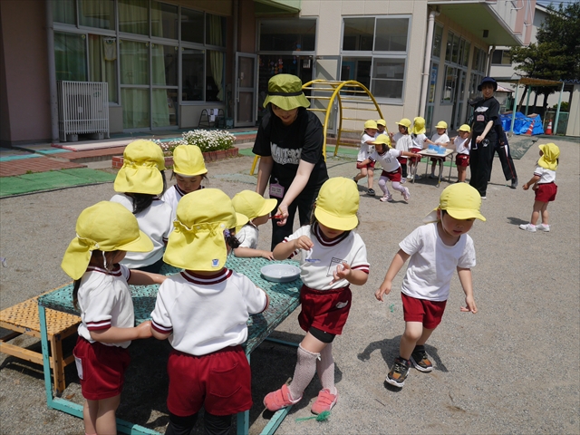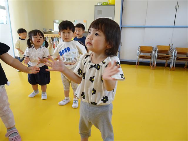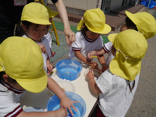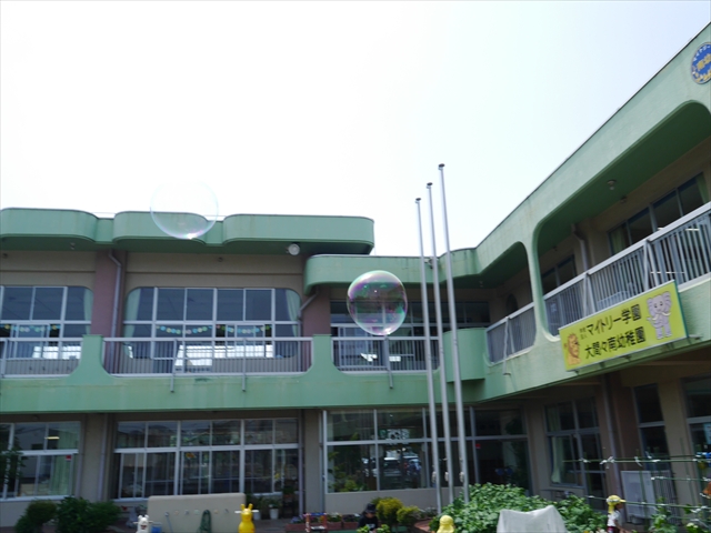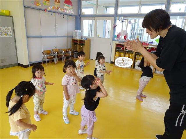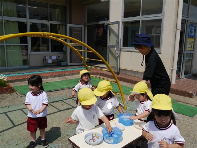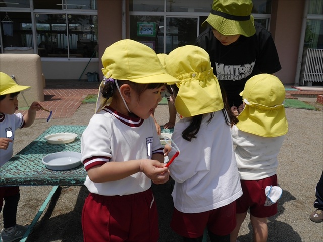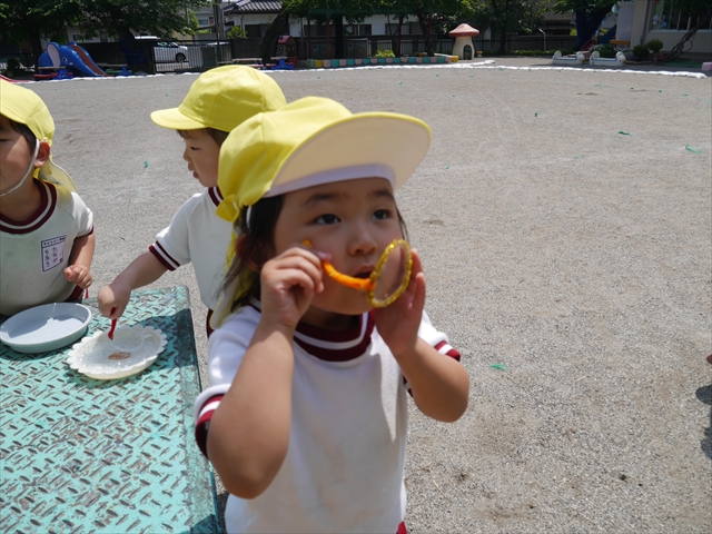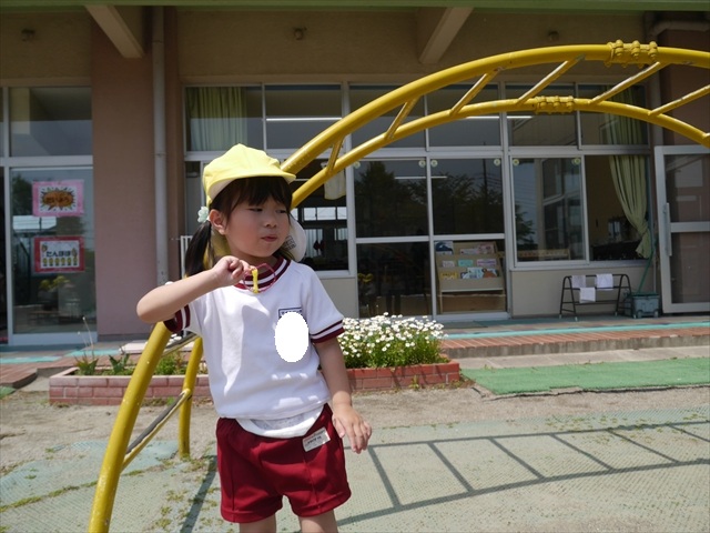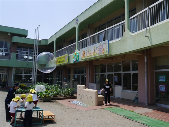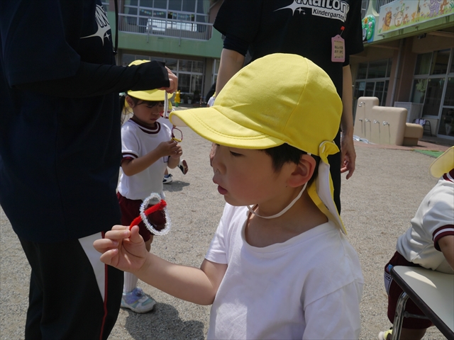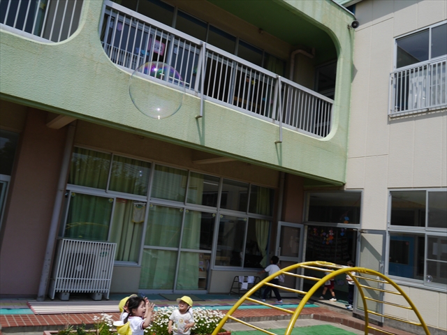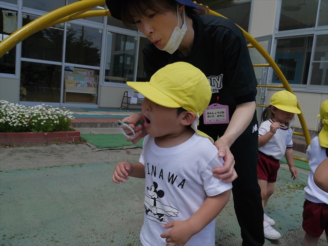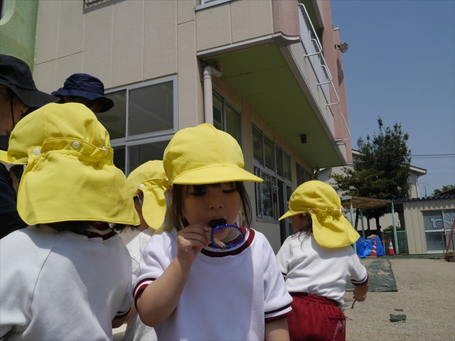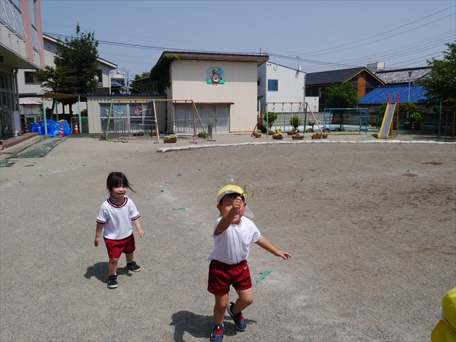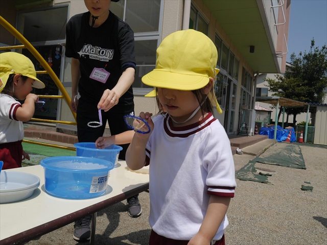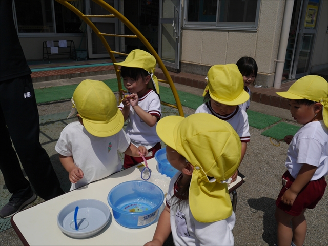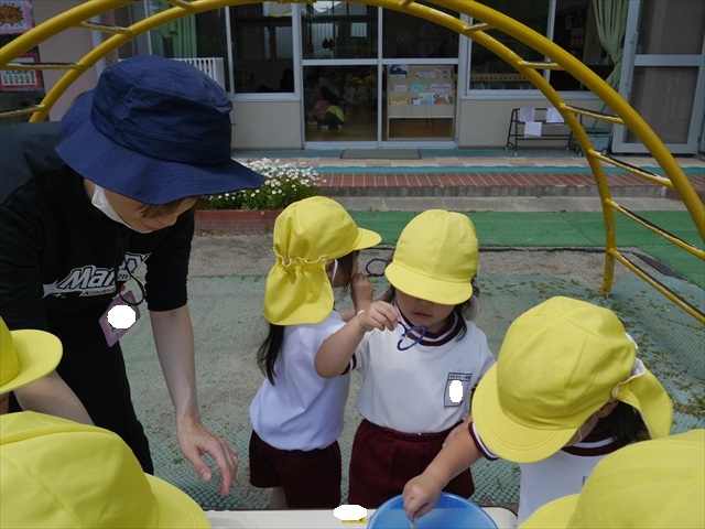 ^^)そして見本を見せると、わぁーすごーい!と大盛りあがりの年少さん。外に出てやってみました!初めは難しい子もいましたが何度かやってみたりお友だちの様子を見て真似したりしながらしゃぼん玉遊びを楽しむことができました。風があると吹かなくても自然としゃぼん玉ができました。飛ばして遊んだり飛んだしゃぼん玉を追いかけたりみんなで楽しむことができてよかったです(