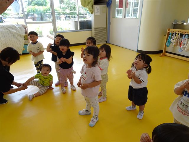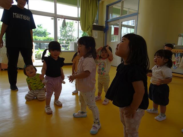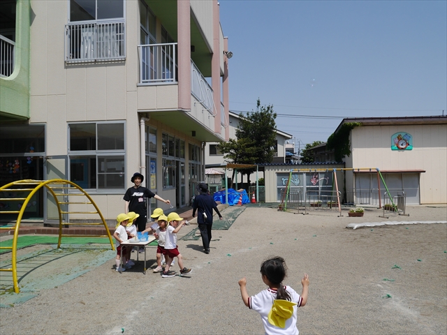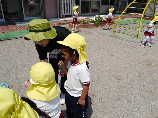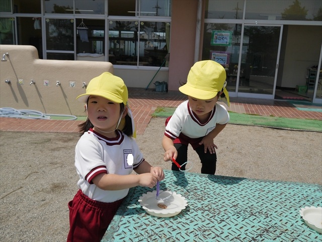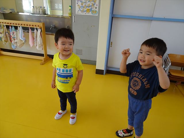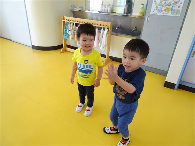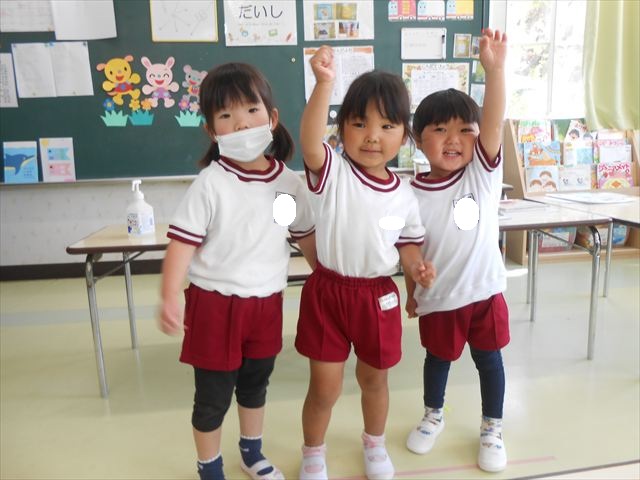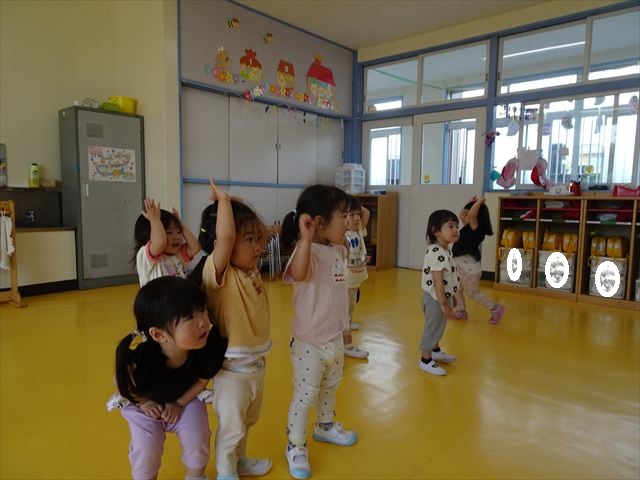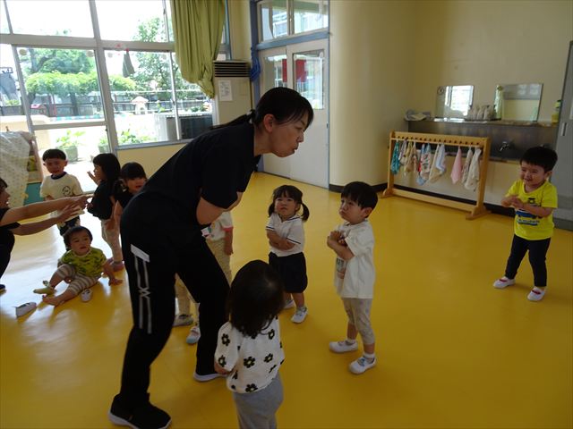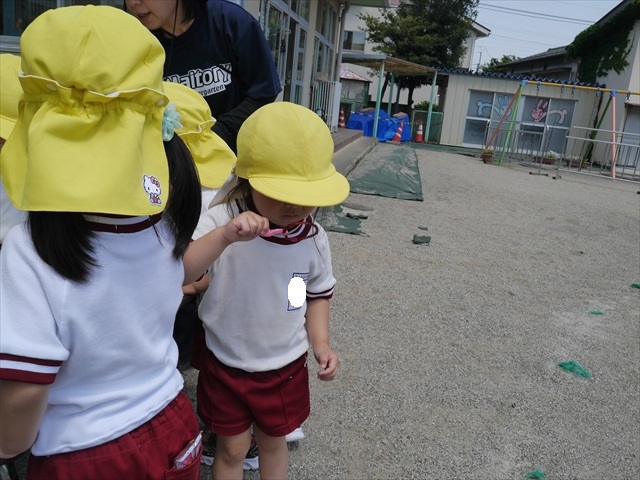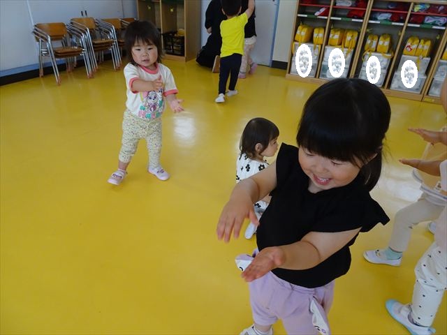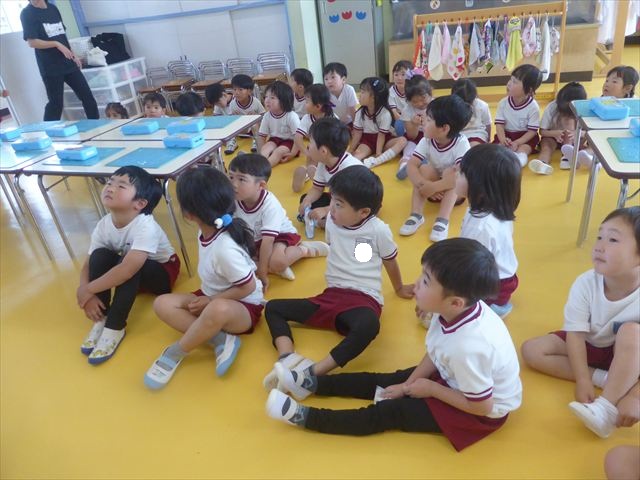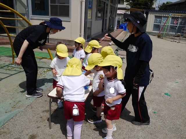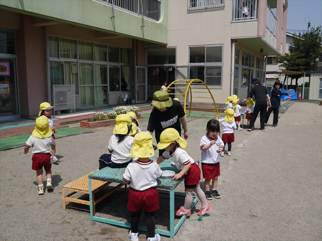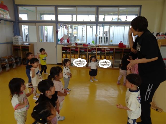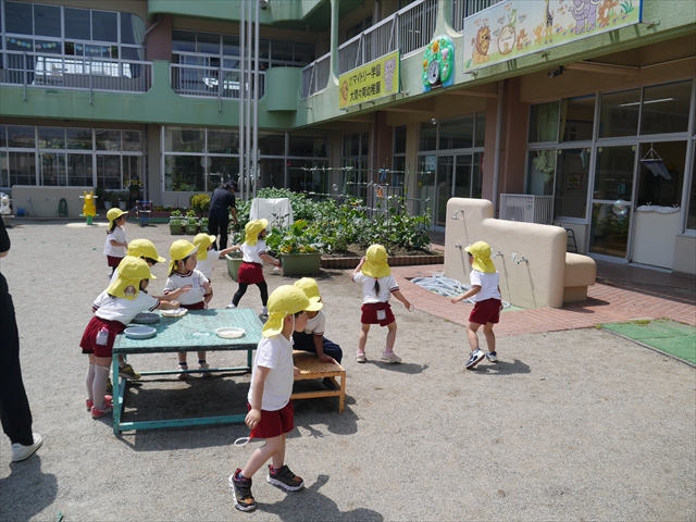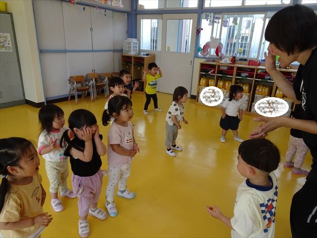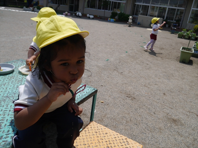 ^^)そして見本を見せると、わぁーすごーい!と大盛りあがりの年少さん。外に出てやってみました!初めは難しい子もいましたが何度かやってみたりお友だちの様子を見て真似したりしながらしゃぼん玉遊びを楽しむことができました。風があると吹かなくても自然としゃぼん玉ができました。飛ばして遊んだり飛んだしゃぼん玉を追いかけたりみんなで楽しむことができてよかったです(