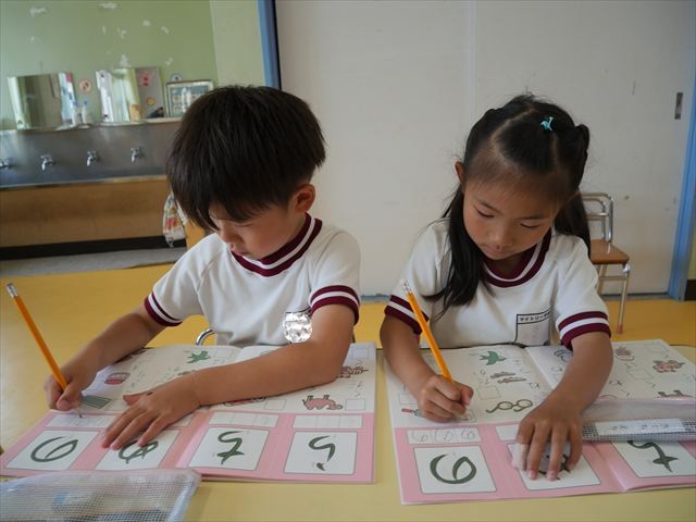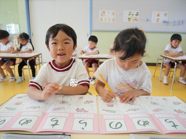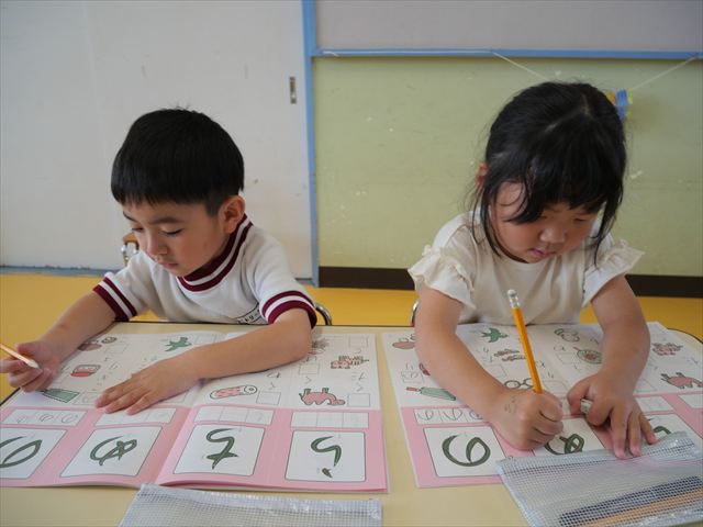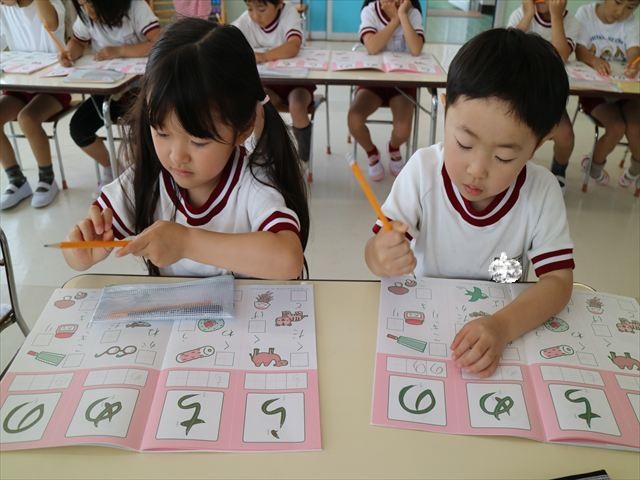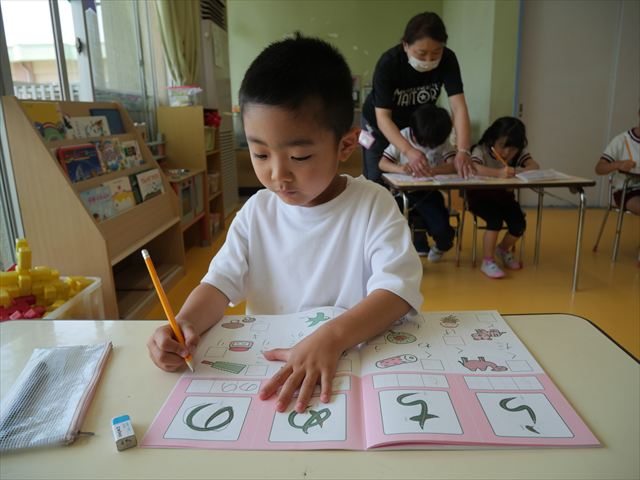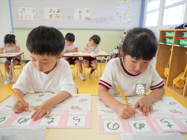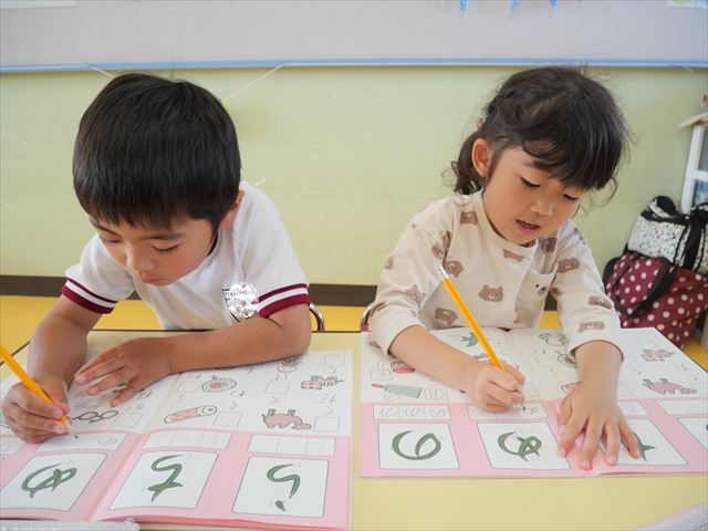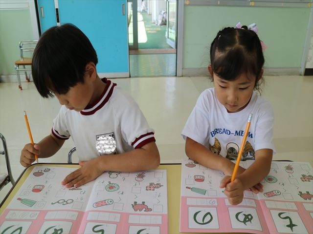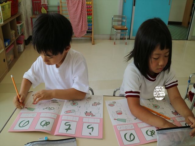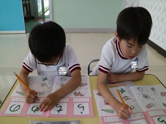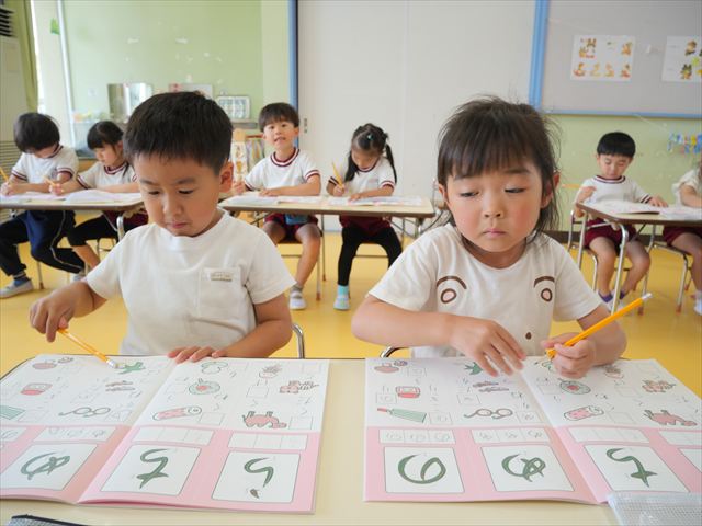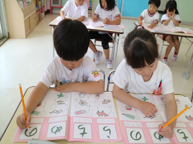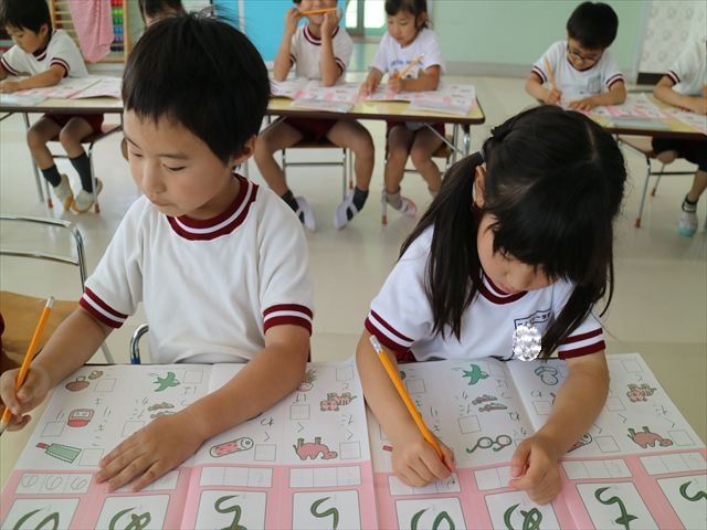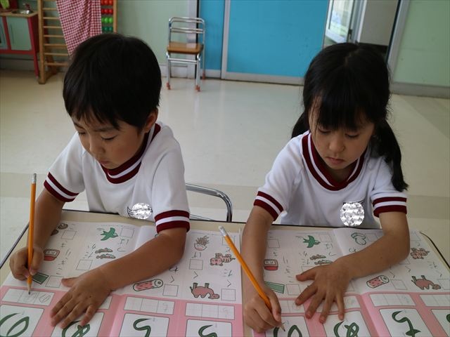 国語の時間で「ワーク」をやりました。今日練習したひらがなは「の」と「め」です。角が生えるのか生えないのか、はらうのか止めるのかなどを意識して取り組むことが出来ていました!