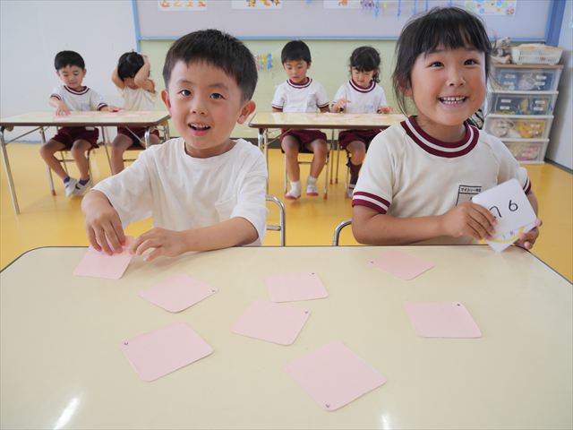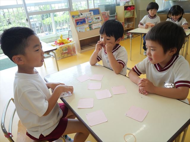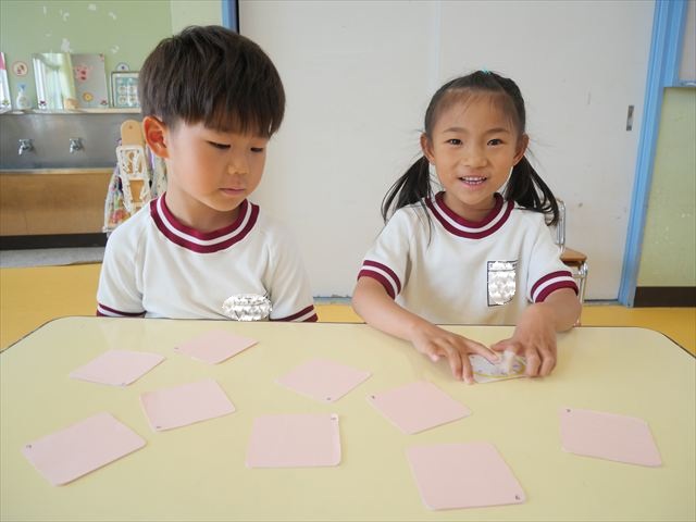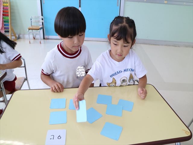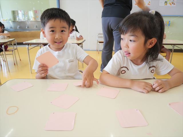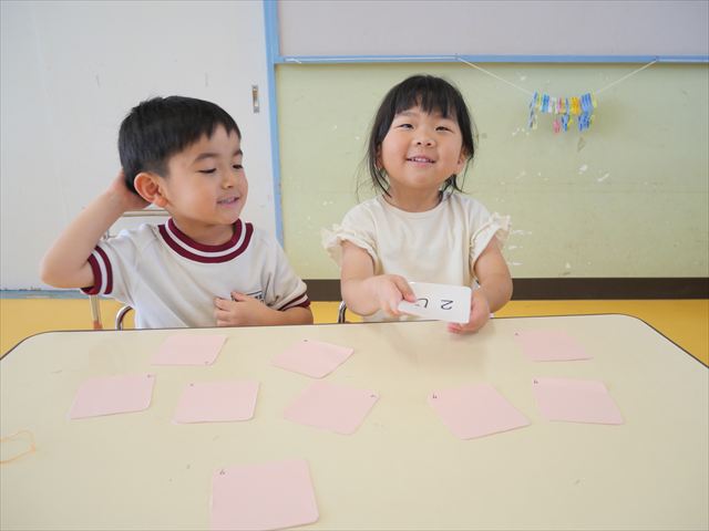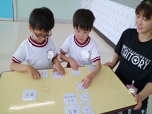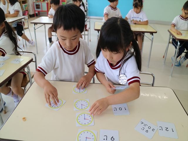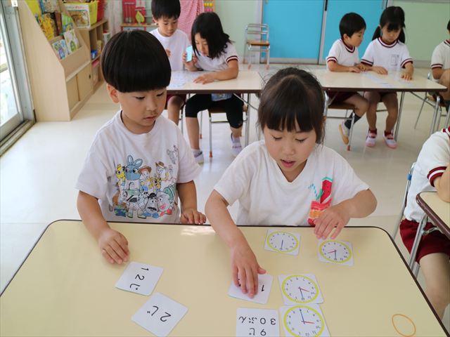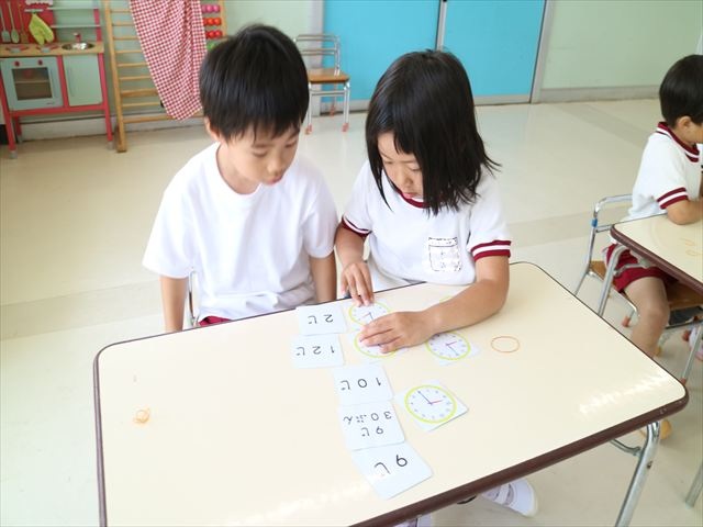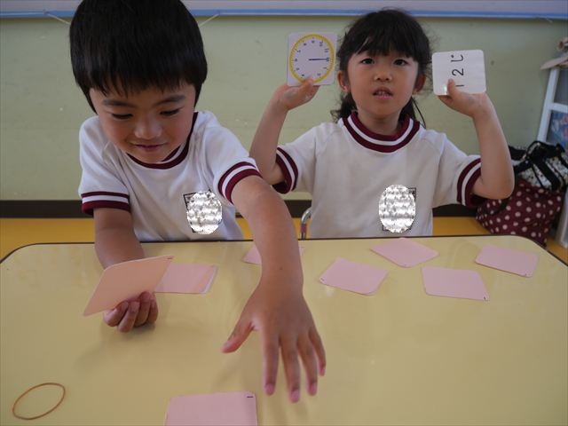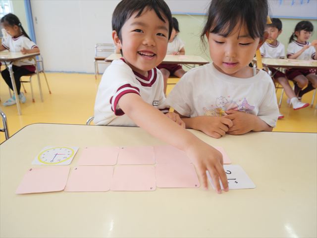 算数の時間では、前回に引き続きマイトリータイムを確認して、5つの時間を使って神経衰弱ゲームをしました!惜しくも勝負に負けてしまって涙を流す子も、(笑)真剣勝負で楽しめました^_^