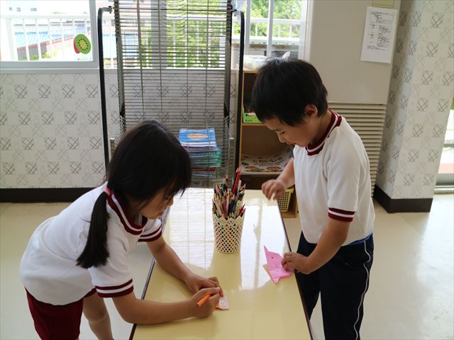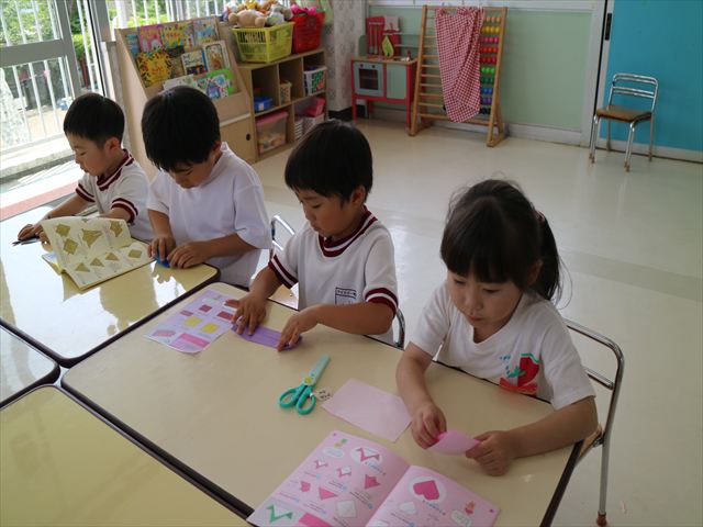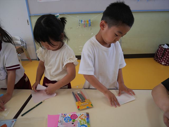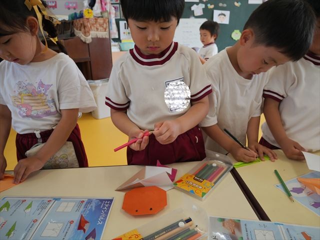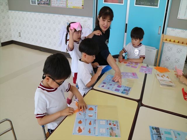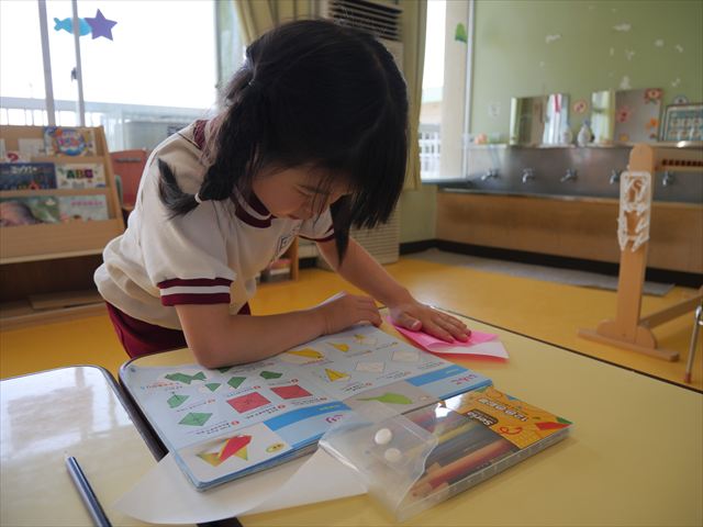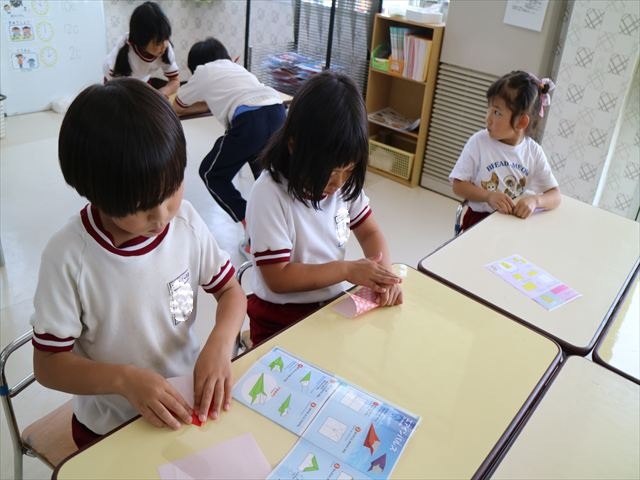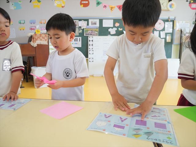 午後は自由保育の時間で折り紙遊びをしました。折り方の本を見ながら自分たちでいろいろなものを作りました!前回作った紙飛行機の作り方を覚えている子はアレンジを加えて作る様子も見られました!