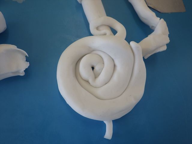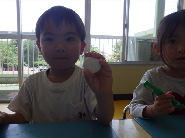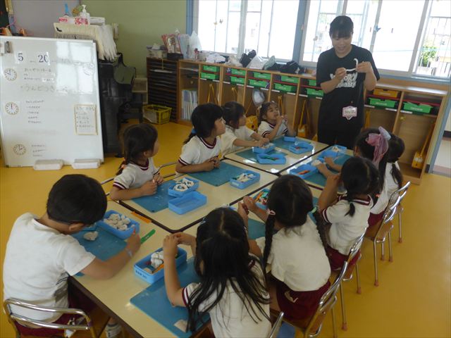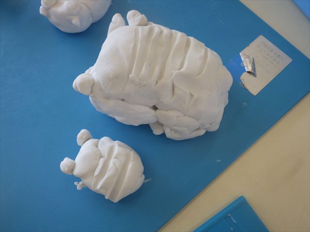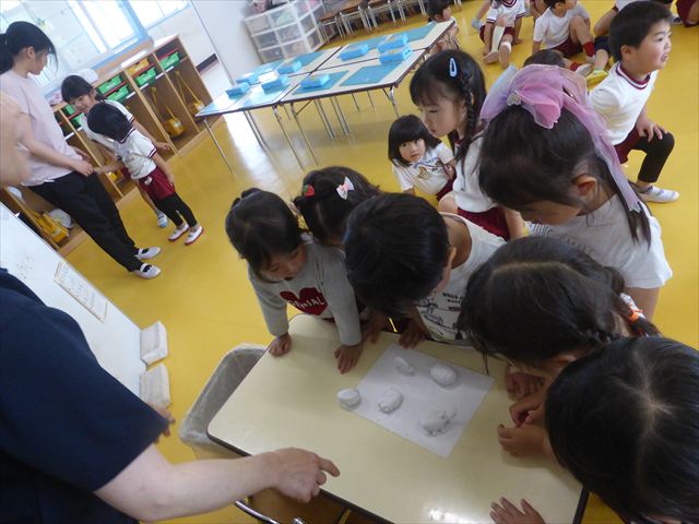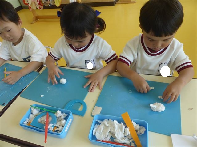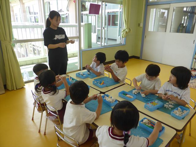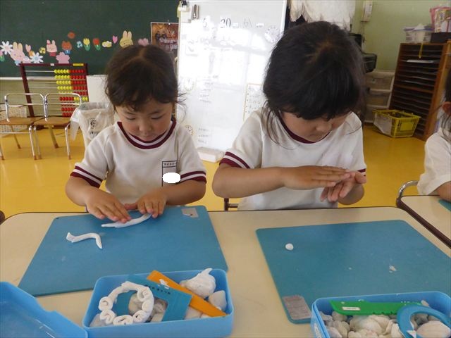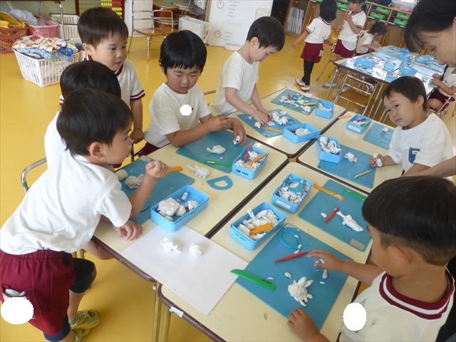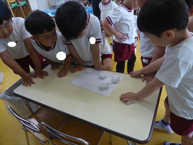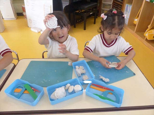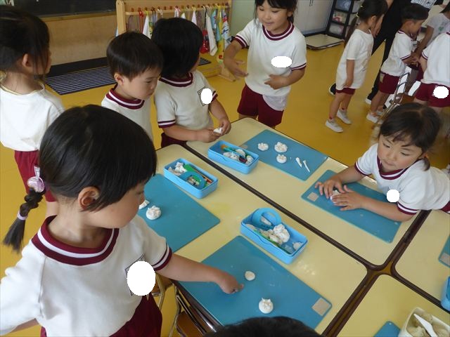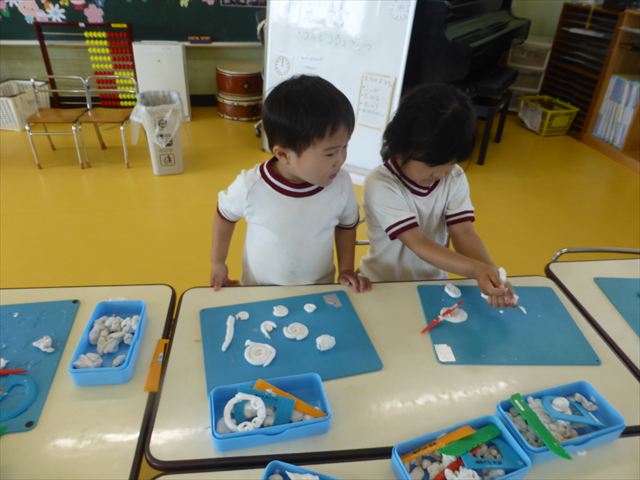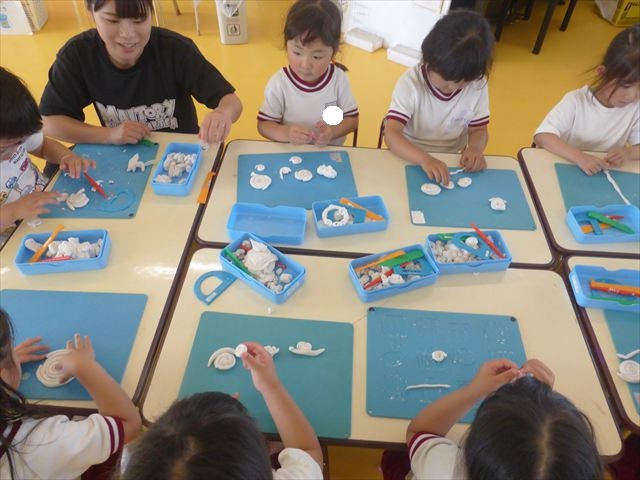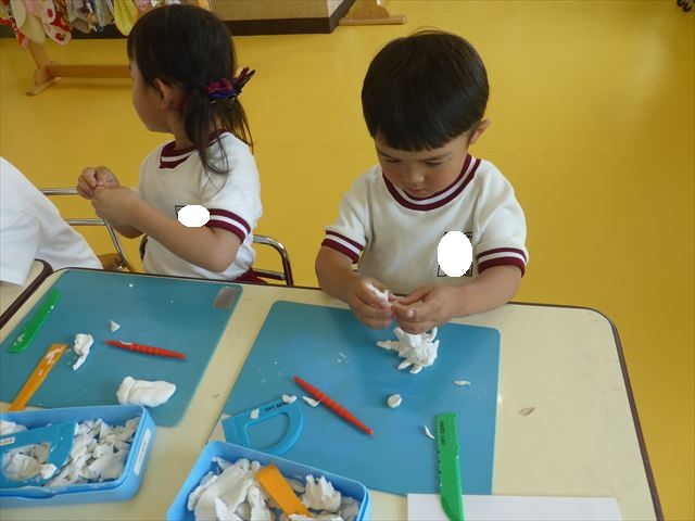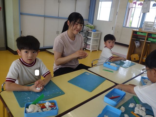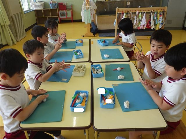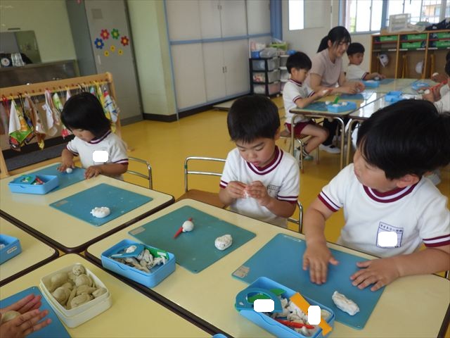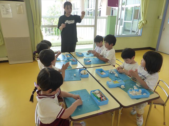 運動教室の後は、造形活動の時間として「粘土遊び」をしました。子どもたちは粘土遊びが大好きです!ですが、実際はじめて見ると「先生作って~。」と作ってもらうことを喜んだり、何を作ったらいいのかな~と悩む姿も見られています。そこで今日は4つの粘土教室を開催して自分の好きな教室に行って作品を作る粘土遊びをしました。教室の種類は「ダンゴムシ教室」「カブトムシ教室」「カタツムリ教室」「てんとう虫教室」です。子どもたちは主体的に自分の好きな教室を選んで先生にアドバイスをしてもらいながら作る事が出来ました!