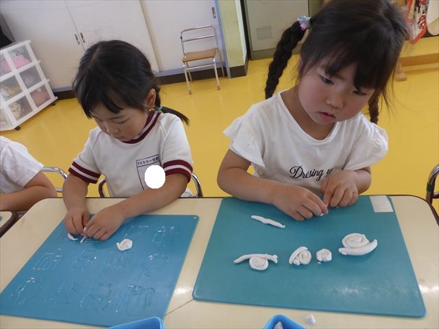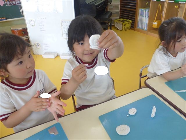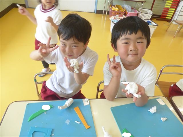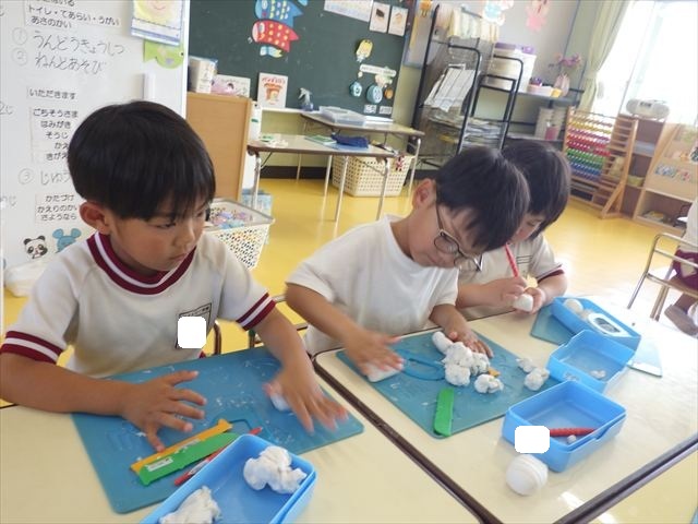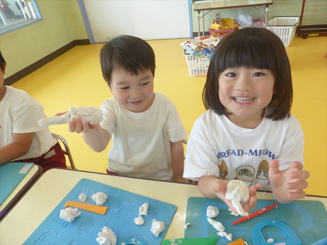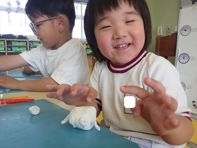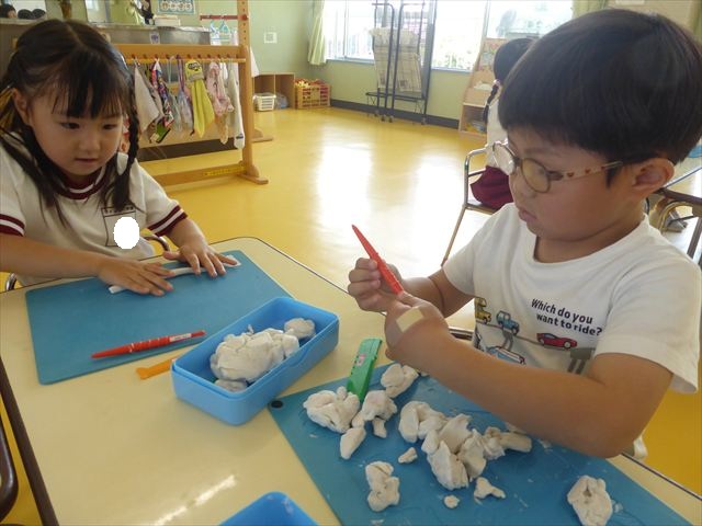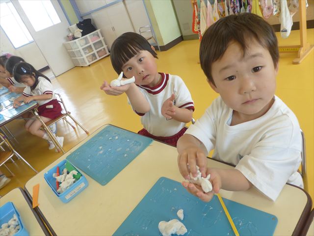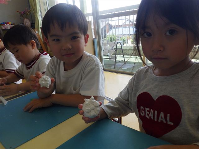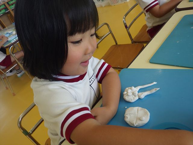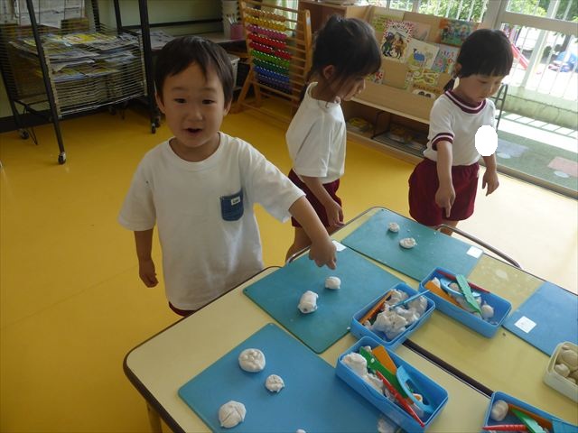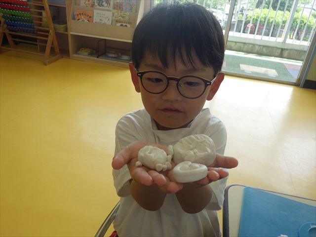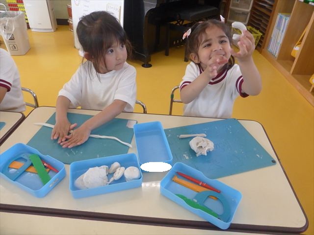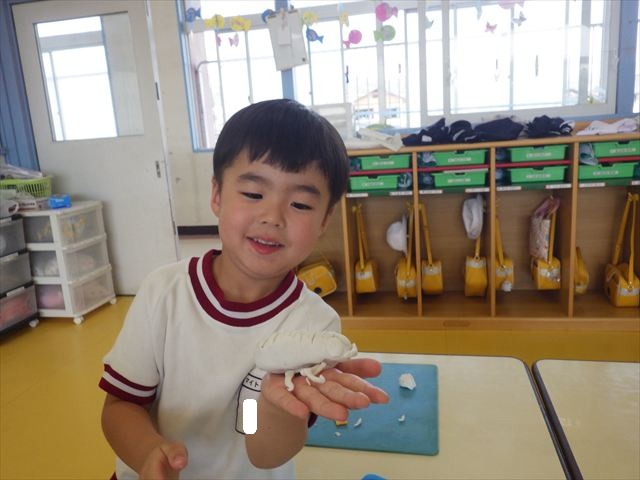 自分で頑張って作った虫は誇らしいようで、みんな自信を持って「見て~。」とお友だちや先生に見せていました。午後の自由遊びでも、続きの粘土遊びを楽しむ姿が見られました。