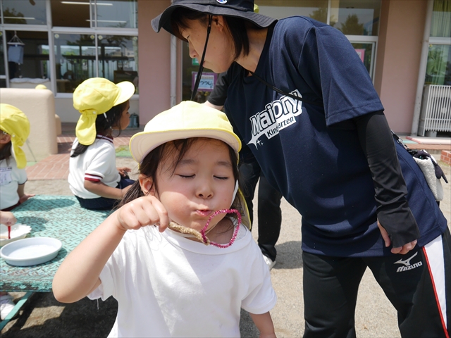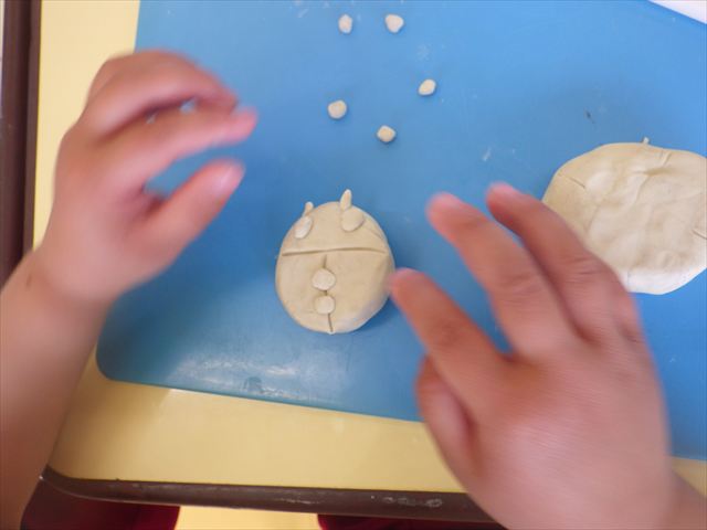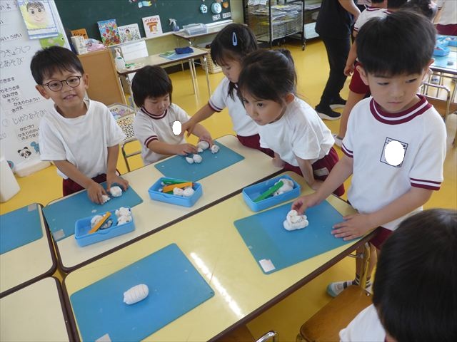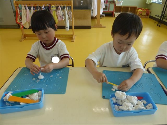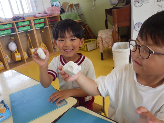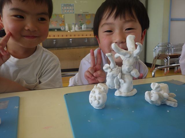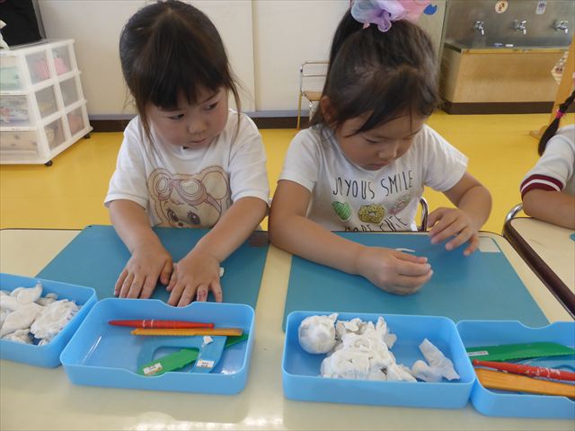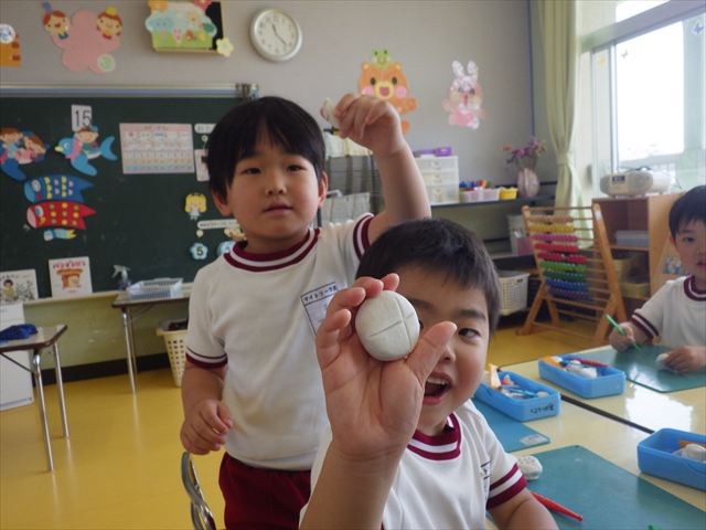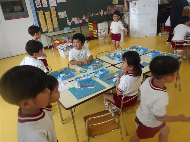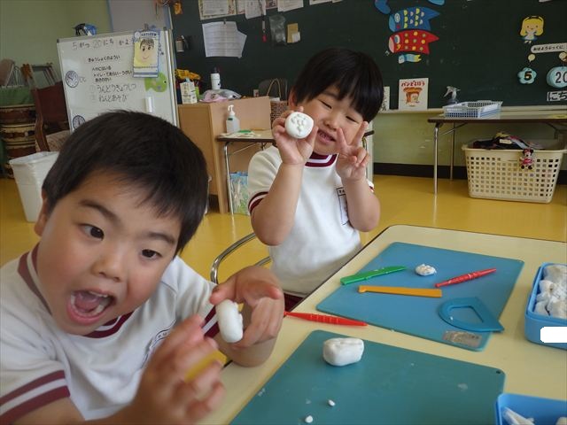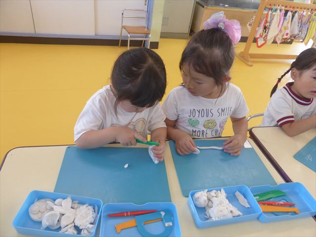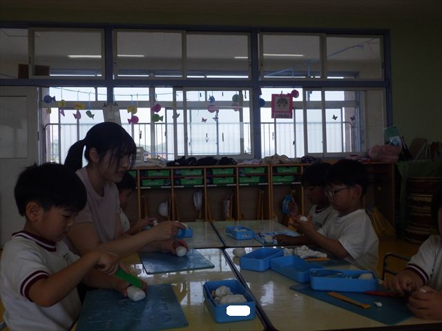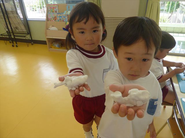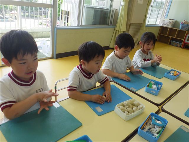 自分で頑張って作った虫は誇らしいようで、みんな自信を持って「見て~。」とお友だちや先生に見せていました。午後の自由遊びでも、続きの粘土遊びを楽しむ姿が見られました。