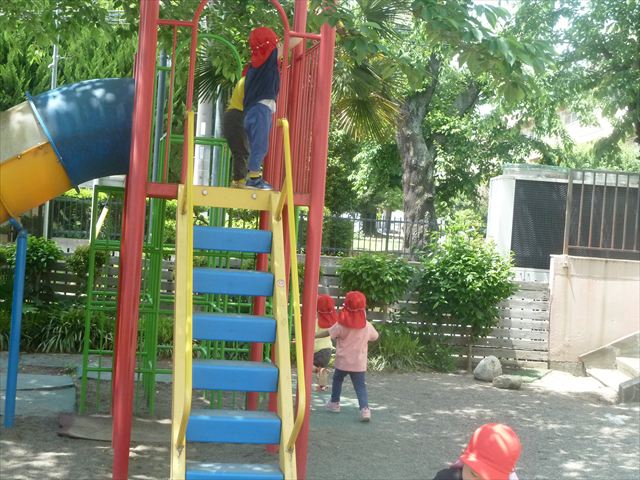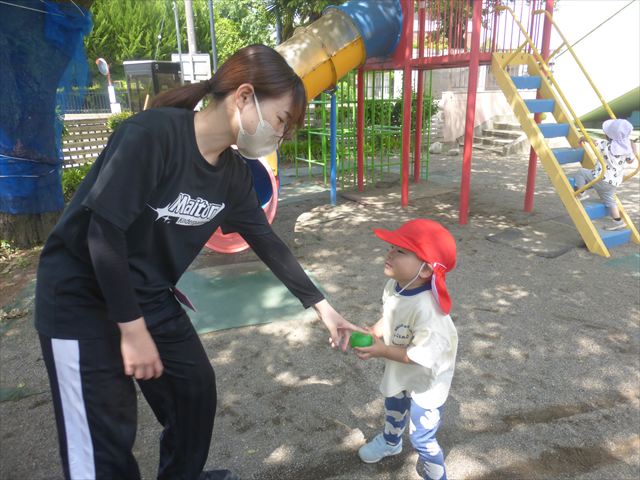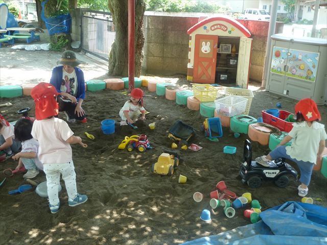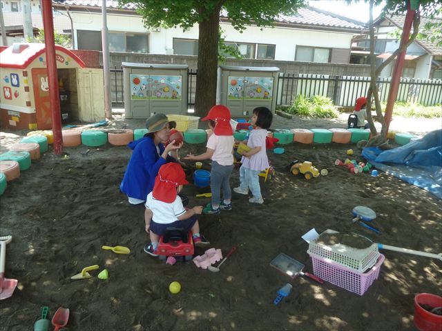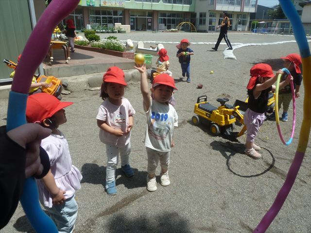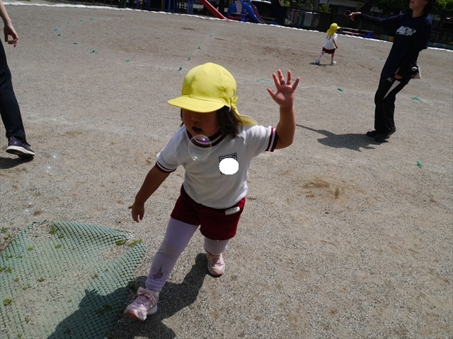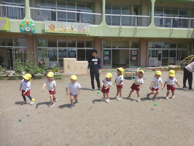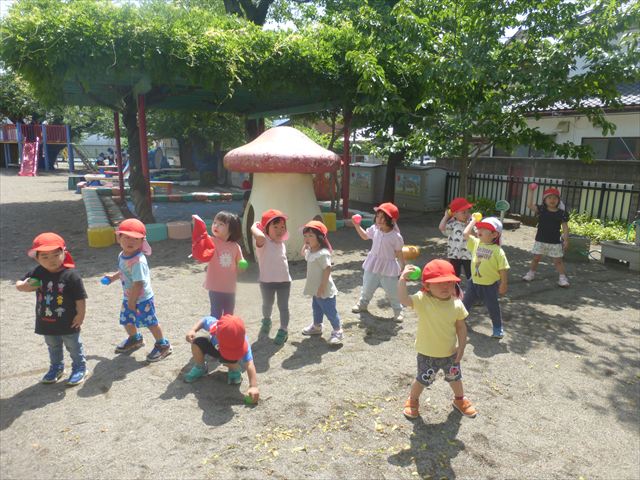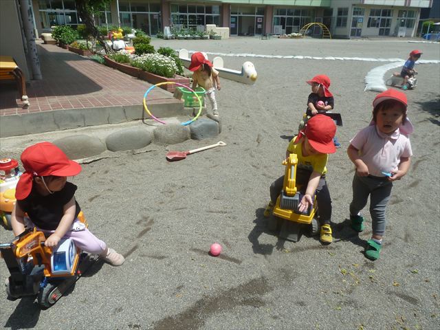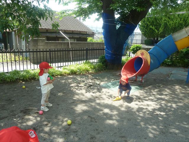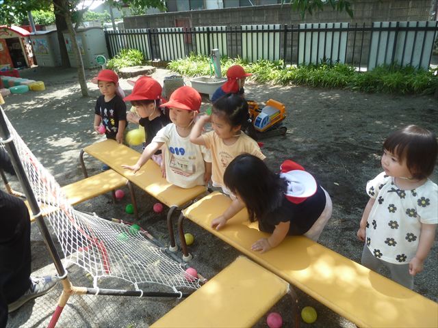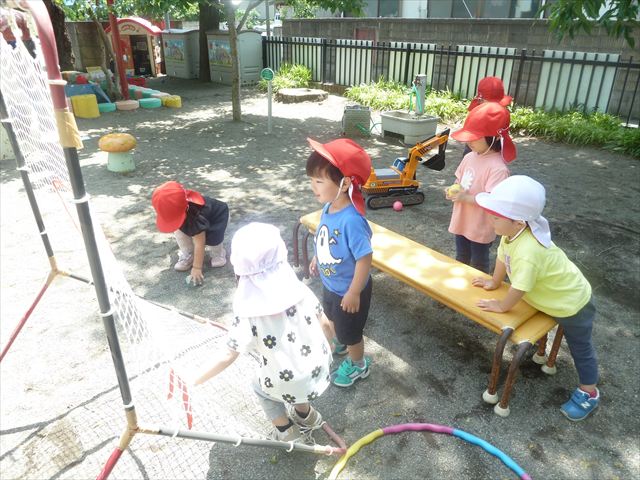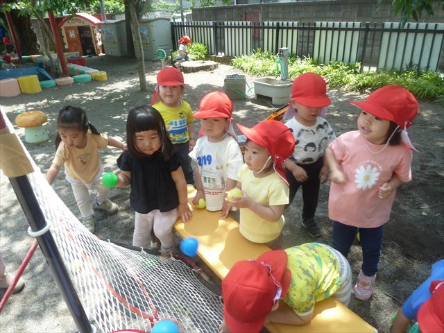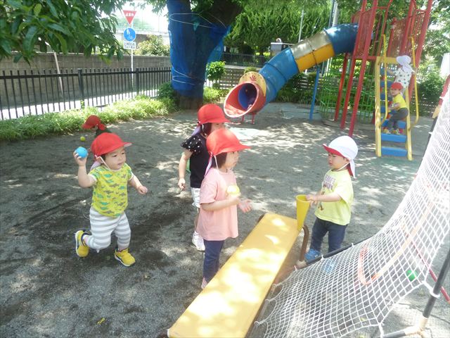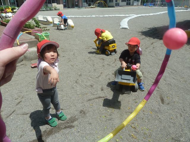 今日はとてもいい天気だったので、戸外遊びをしました!相変わらずお砂場が大人気☆お友だちや先生と一緒に、おいしいごを作る子、山を作る子などなど、お砂場での遊びを楽しんでいました(^^♪また、今日はボールとネットも出してみました!このネットはボールが当たると跳ね返るので、自分が投げたボールが跳ね返ってきて頭に直撃する子も(笑)上手に投げて、的に当てることができました!(^^)!