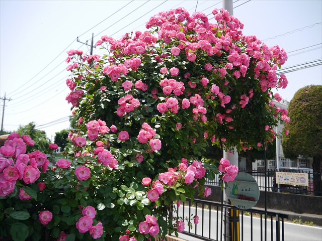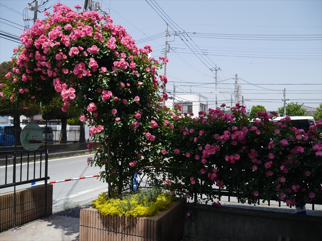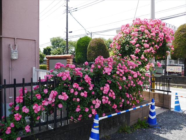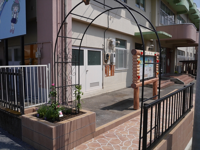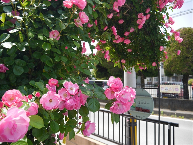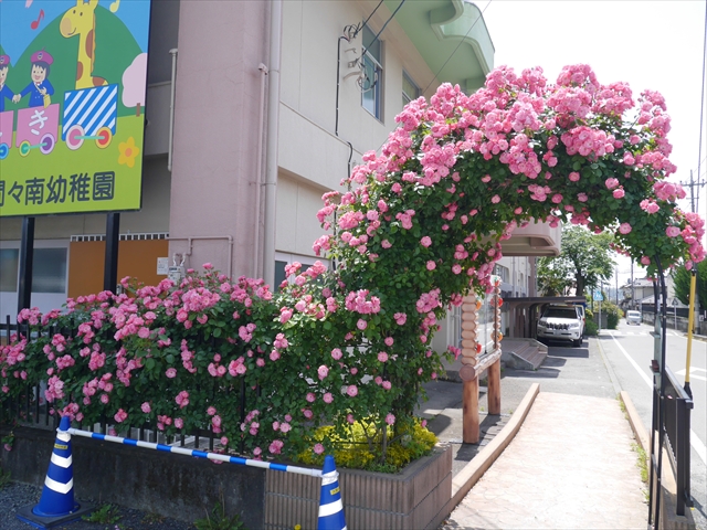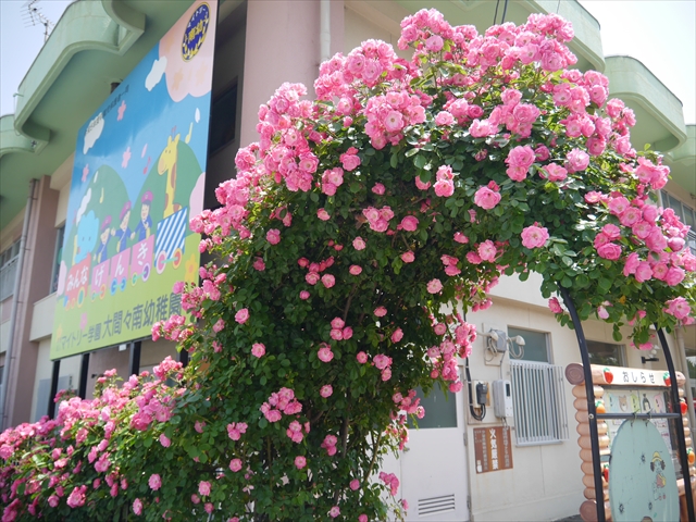 駐車場から玄関へのアプローチとアーチは、令和3年4月の正面玄関前大改修工事で新設しました。その際、アーチにバラを2本植えました。どこまで大きく綺麗に咲くか楽しみでしたが、年々ぐんぐん育ち、大きく豪華に綺麗に咲くようになりました。バラアーチのバラは、「アンジェラ」という種類で、ピンク色の綺麗な花をたくさん咲かせてくれます。今年は植えて4年目となり、さらに綺麗にたくさん咲いてくれました。来園の際やお子さんを送迎なさる際は、バラアーチをくぐる時ごゆっくりご覧下さい。小鳥もアーチに住みついています。見つけて下さい。(*^_^*) (^_^)v ・・・美しいバラにはトゲがあります。怪我をしないようお子さんには触らせないようにお願いします。(^_^;)
