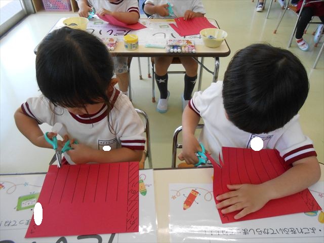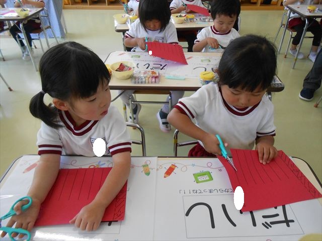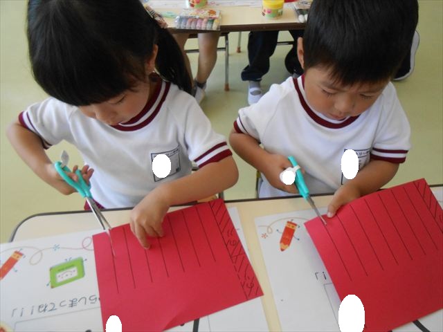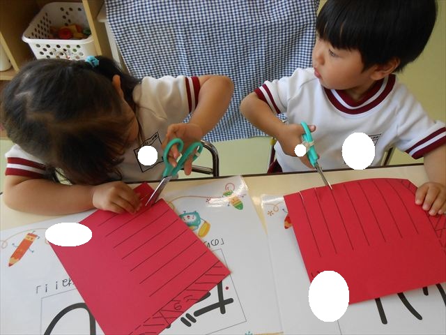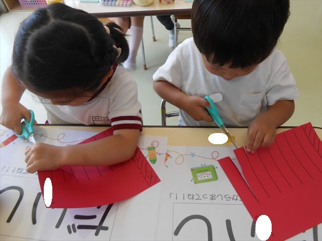 今日はホール飾り作りをしました!年少さんの担当は「たこ」。はさみを使ってたこを作りました(