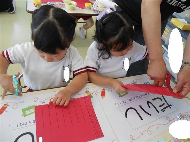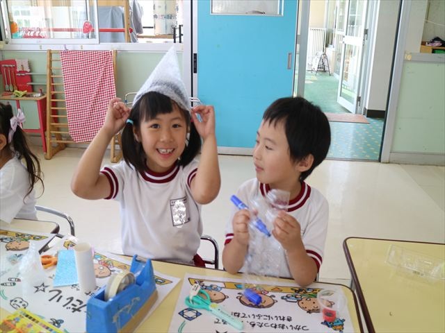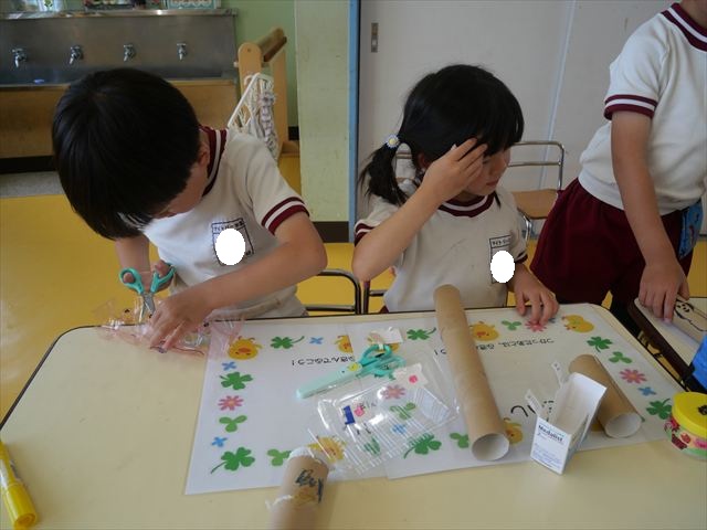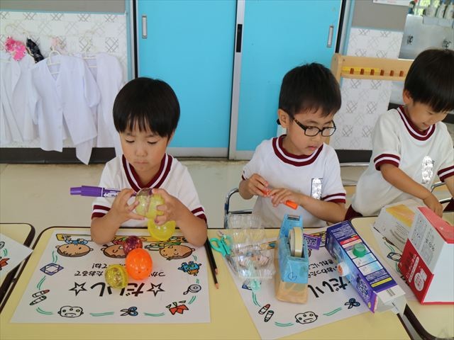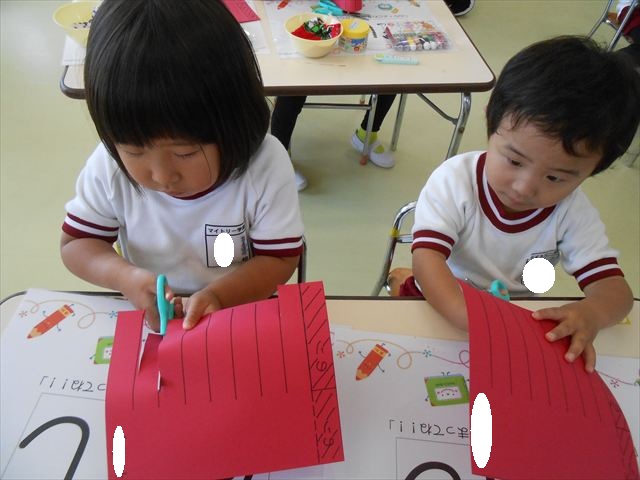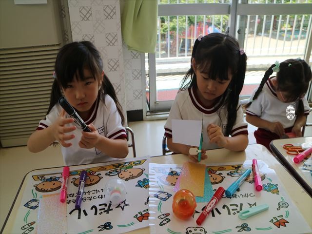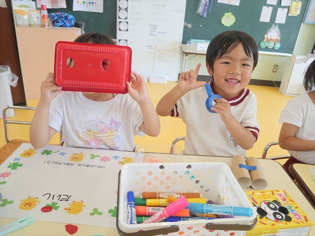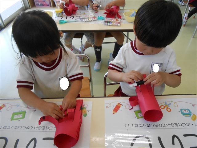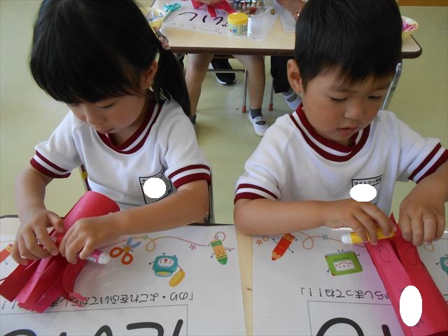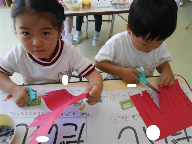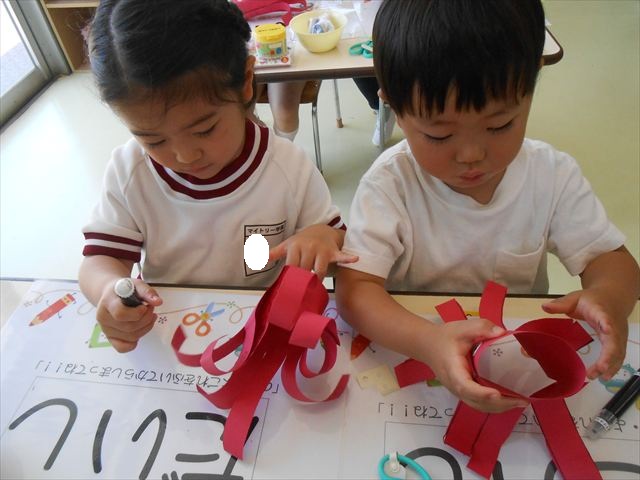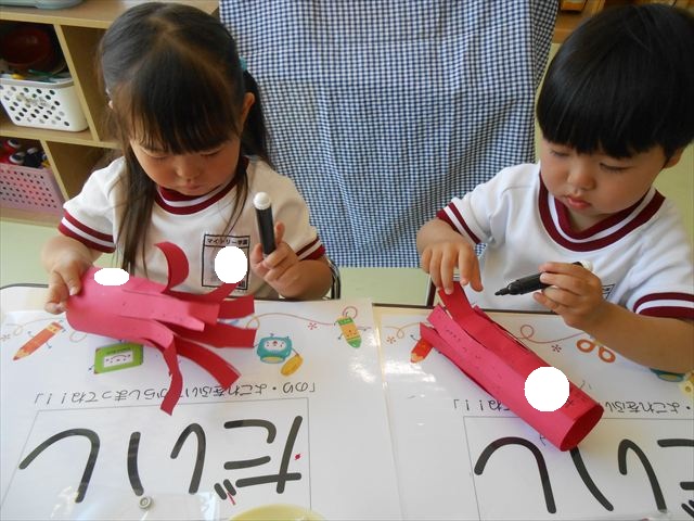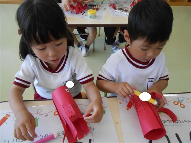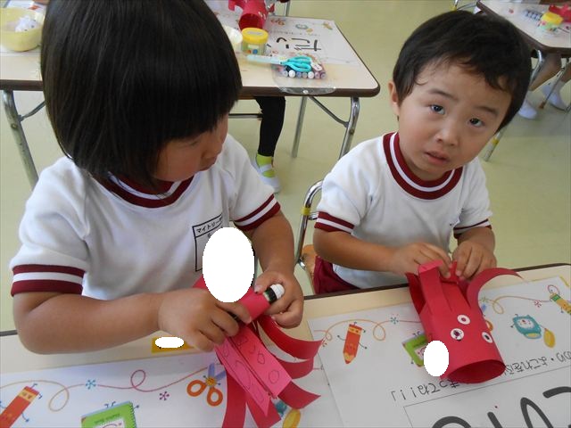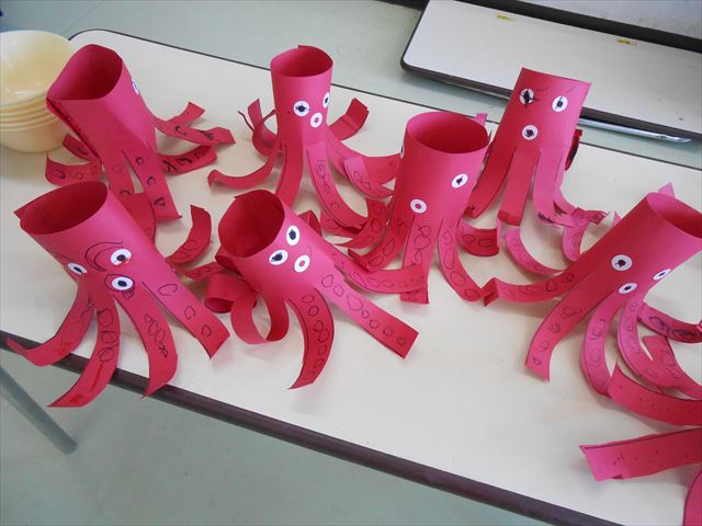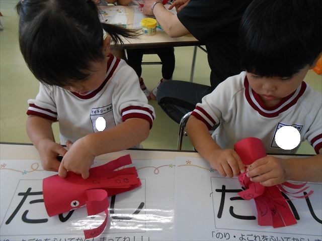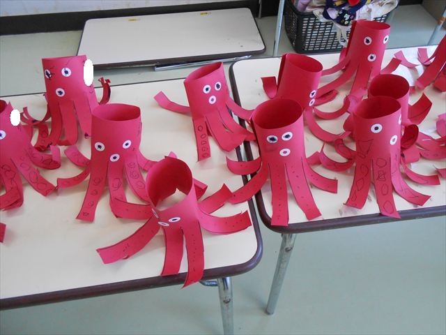 ^^)みんな真剣に取り組むことができました。目と口にシールを貼って、足をマジックを使ってくるくるにして完成!かわいいたこができました(