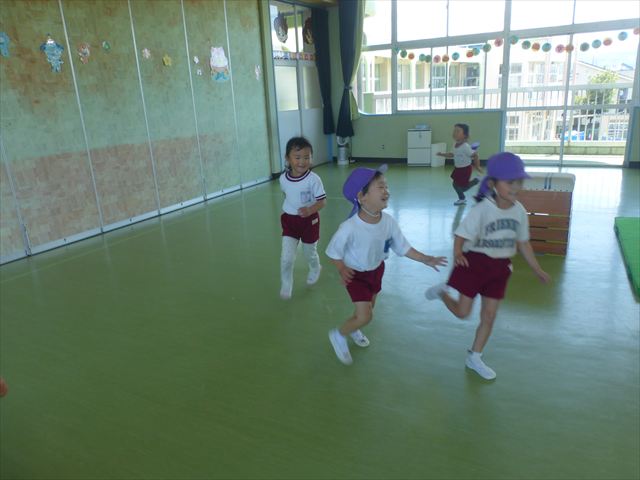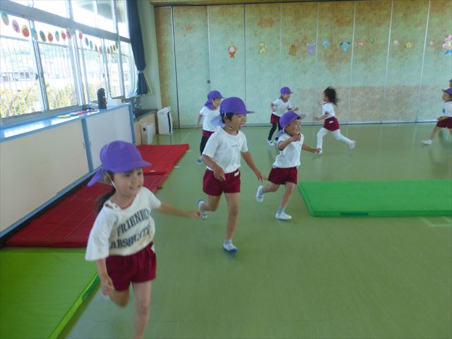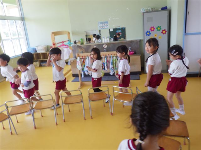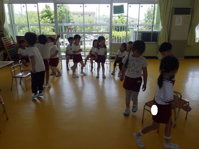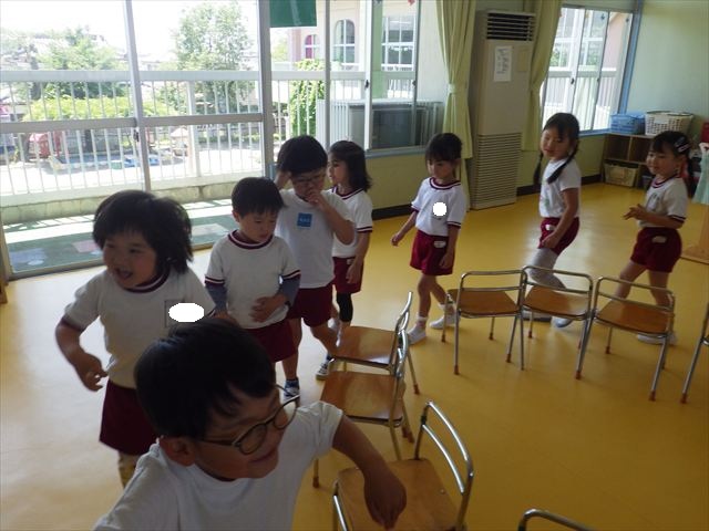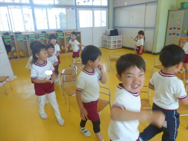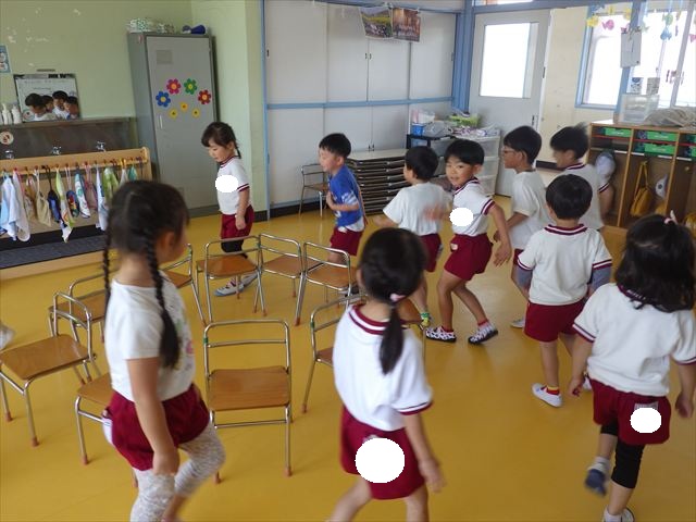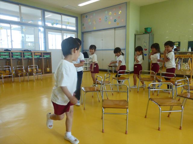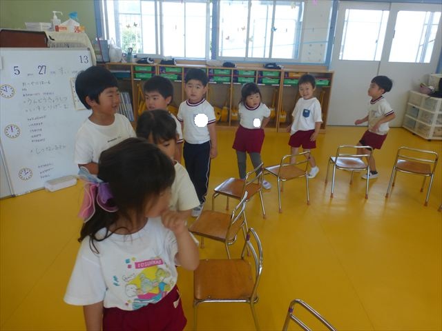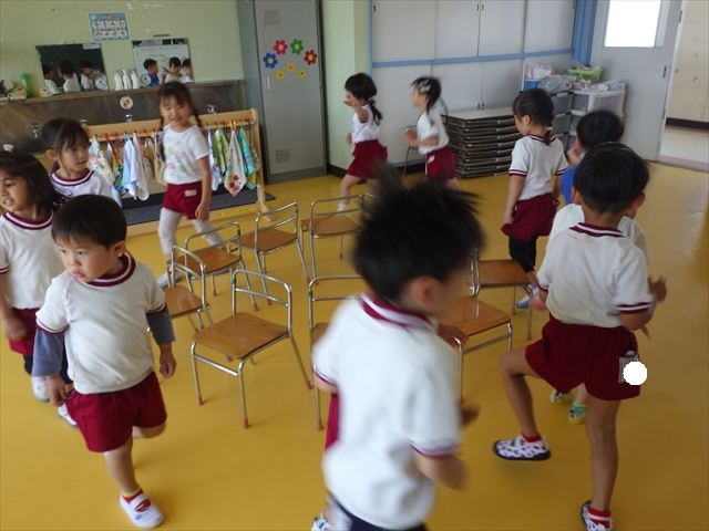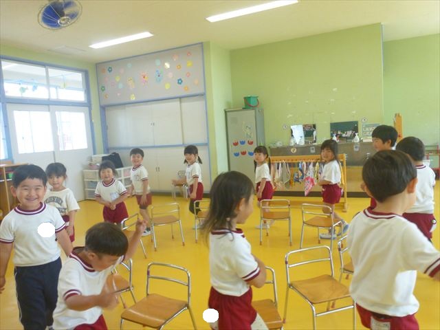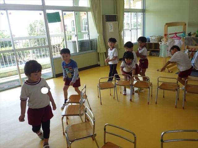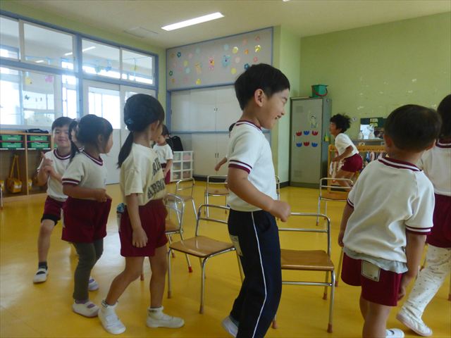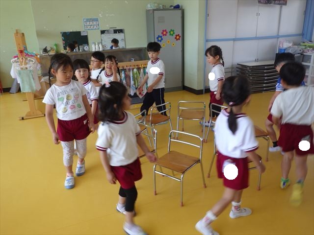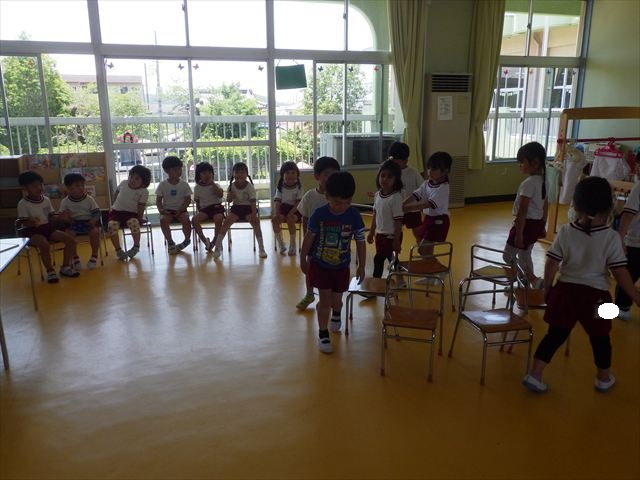 運動教室の後は、集団遊び「椅子取りゲーム」をしました。ルールを守り楽しく遊ぶことが出来ました。