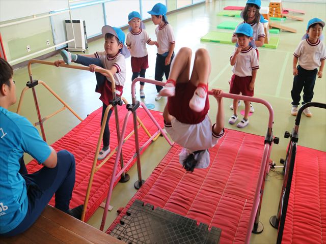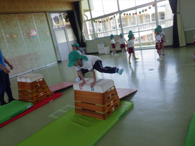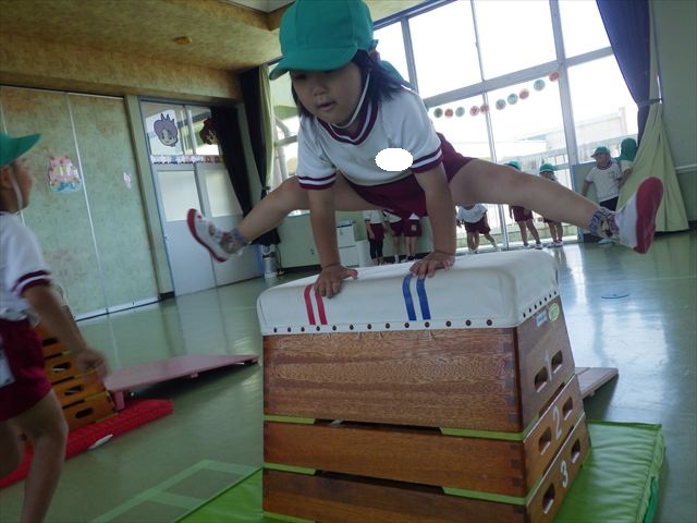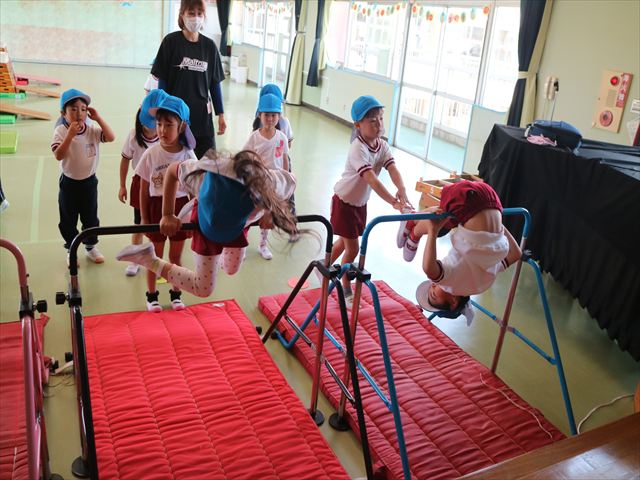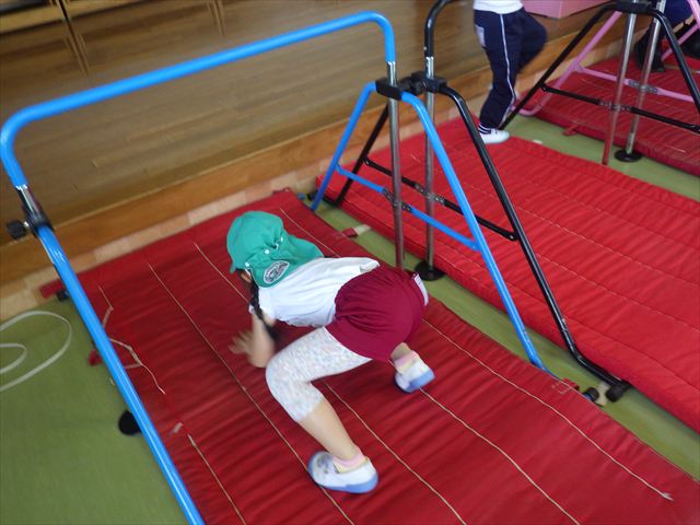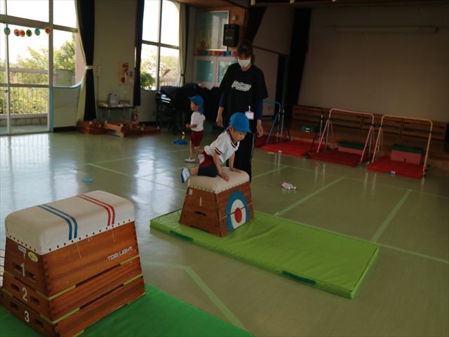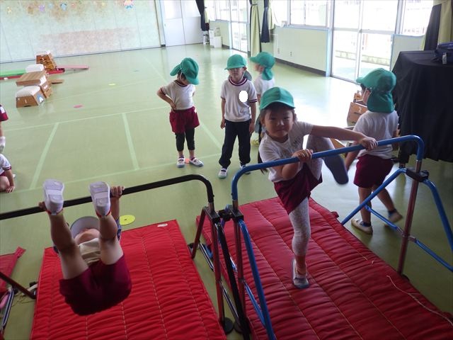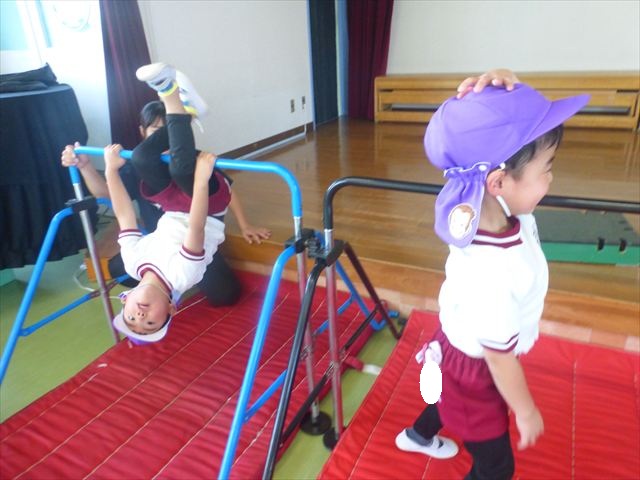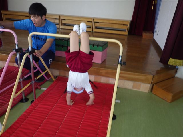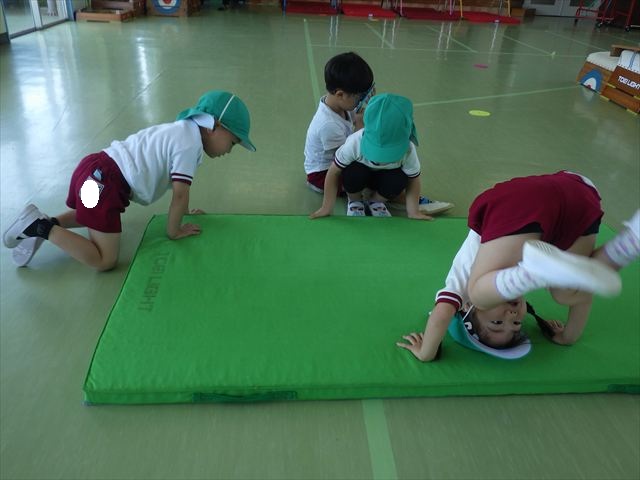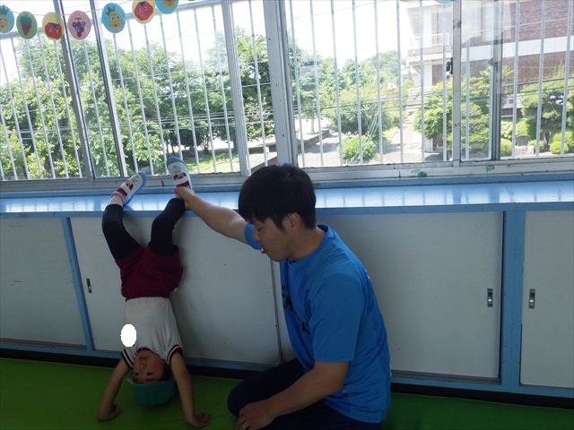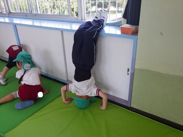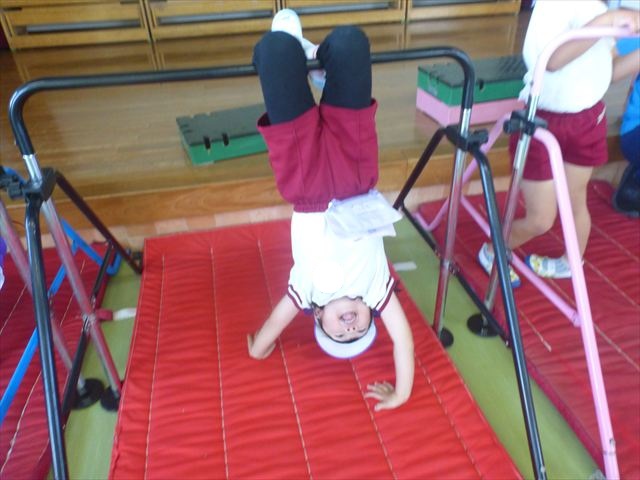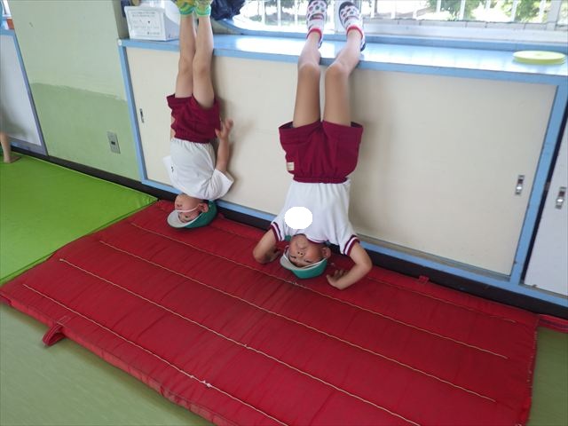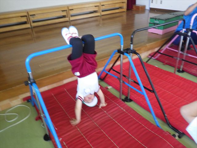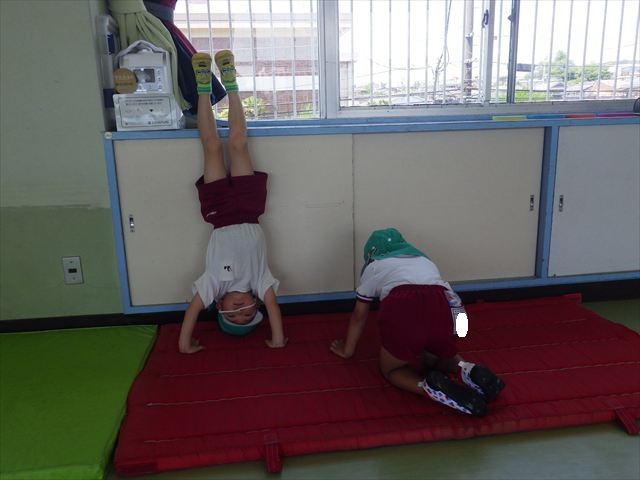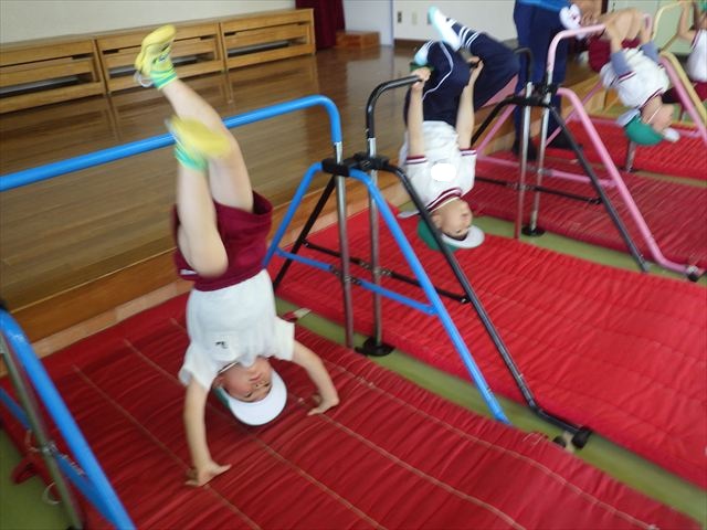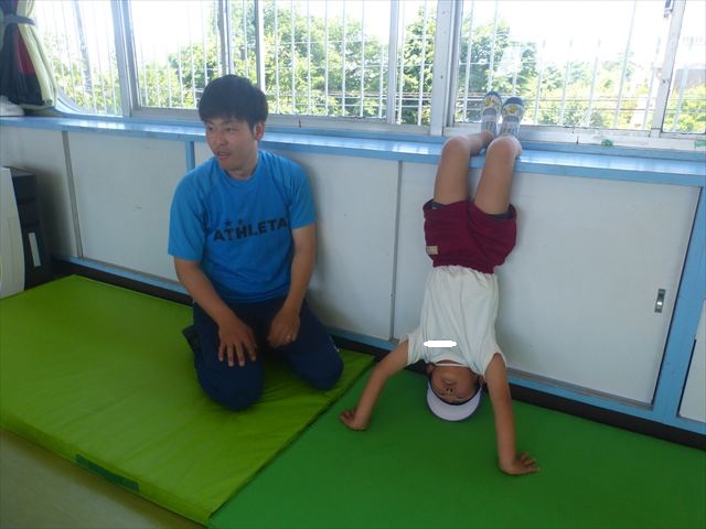 今日の運動教室は、跳び箱、鉄棒、三点倒立を行いました。鉄棒では「コウモリ降り」と言う鉄棒に足を引っ掛けて逆立ちの様に手を着き、引っ掛けた足を外して着地するやり方を教えてもらい練習しました。三点倒立は、マットの上で壁を使って練習しました。壁がなくても出来る様になるのが目標です!