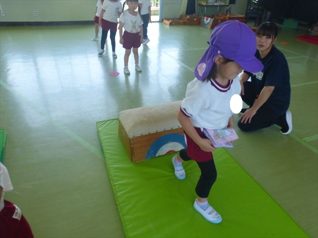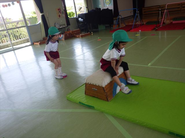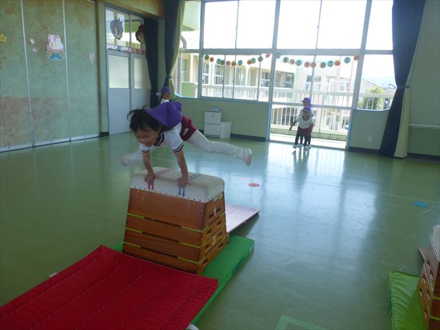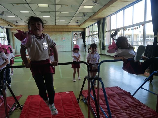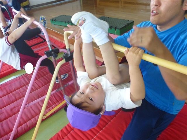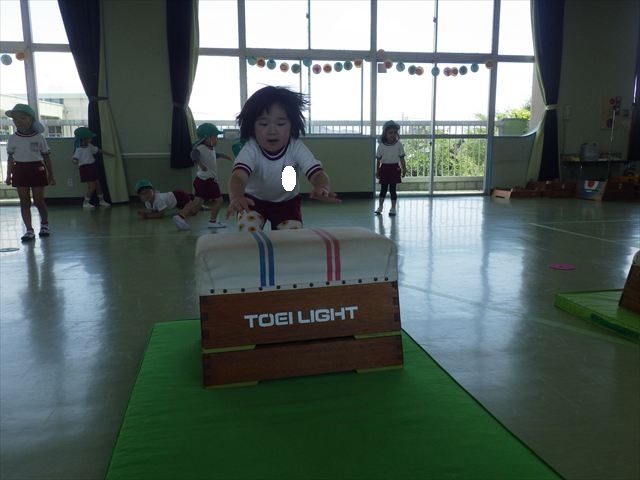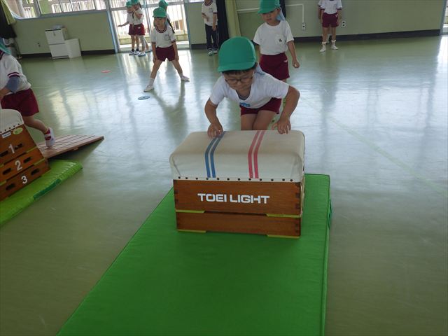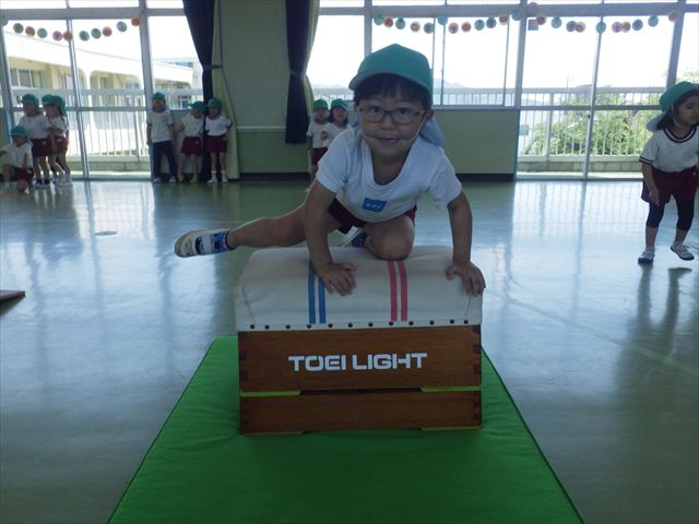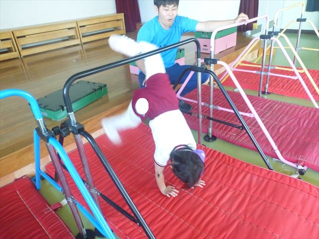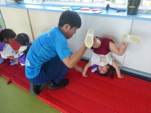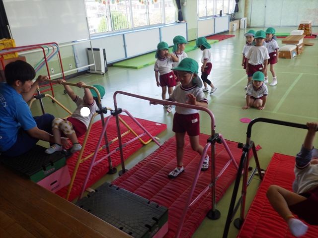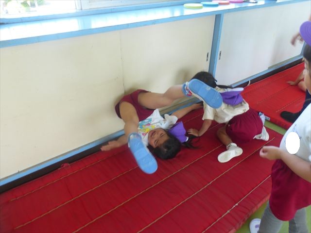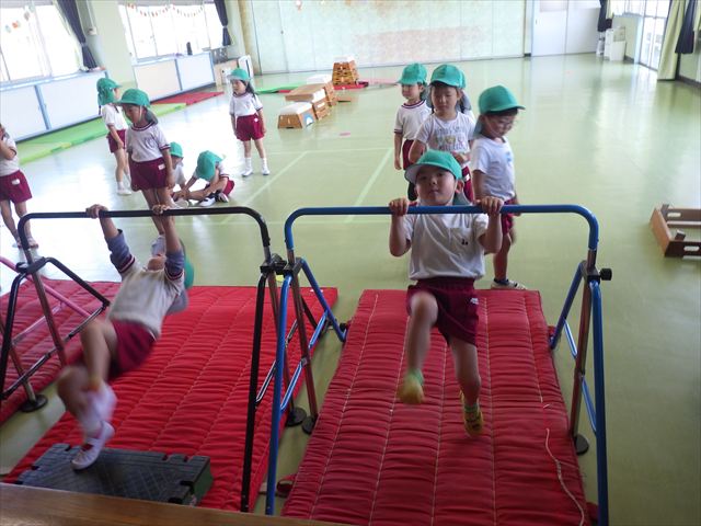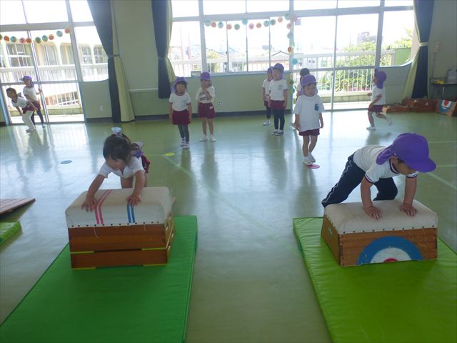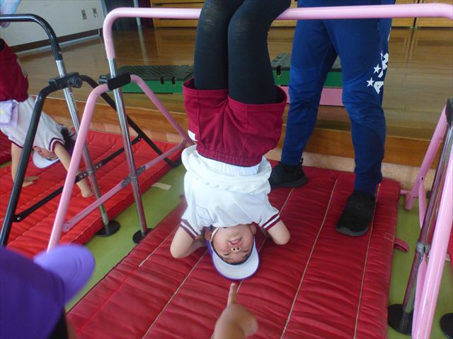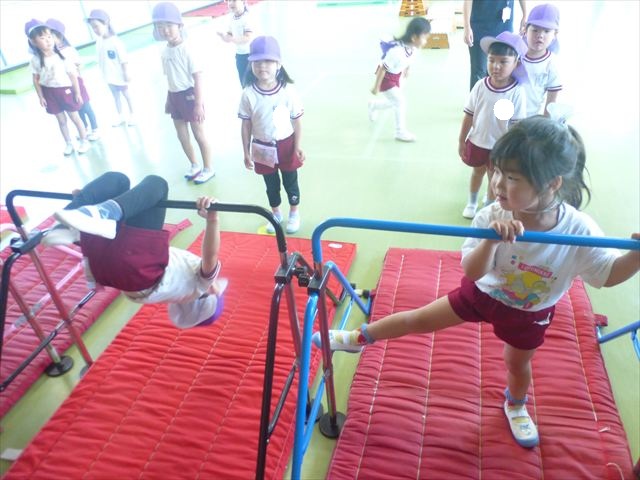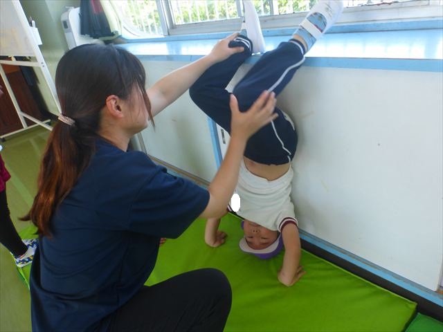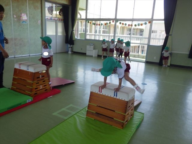 今日の運動教室は、跳び箱、鉄棒、三点倒立を行いました。鉄棒では「コウモリ降り」と言う鉄棒に足を引っ掛けて逆立ちの様に手を着き、引っ掛けた足を外して着地するやり方を教えてもらい練習しました。三点倒立は、マットの上で壁を使って練習しました。壁がなくても出来る様になるのが目標です!