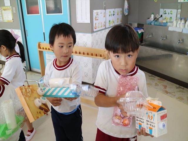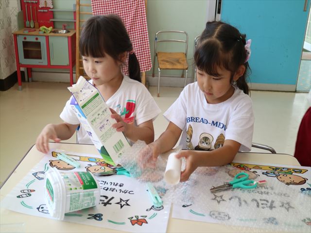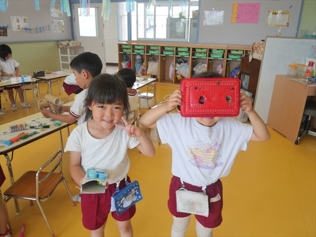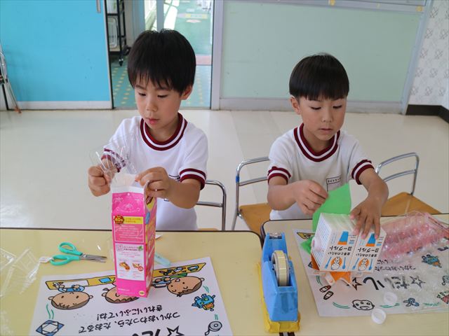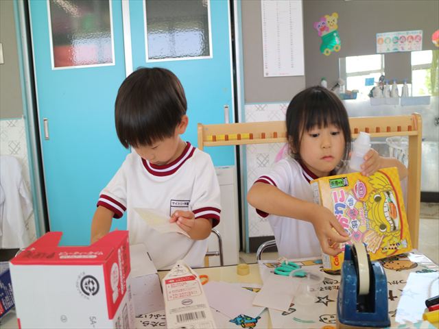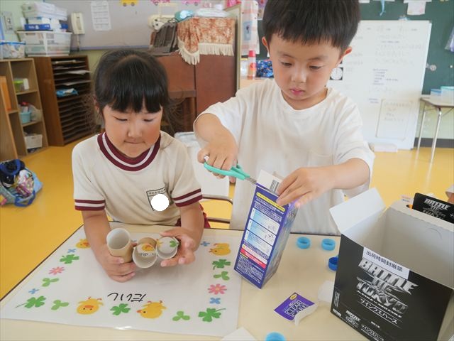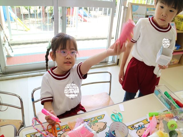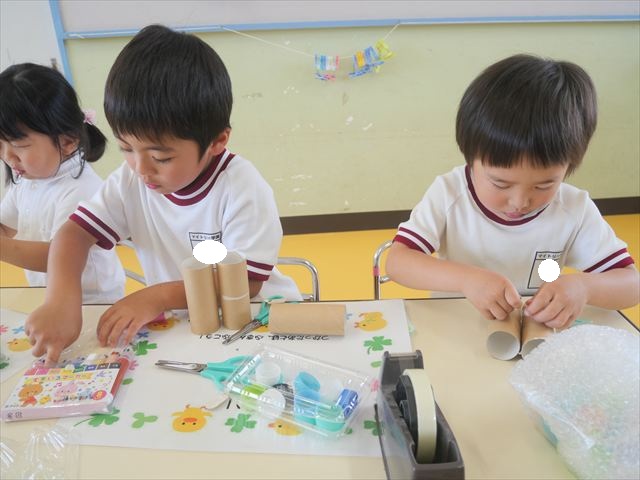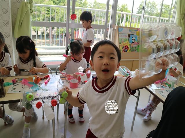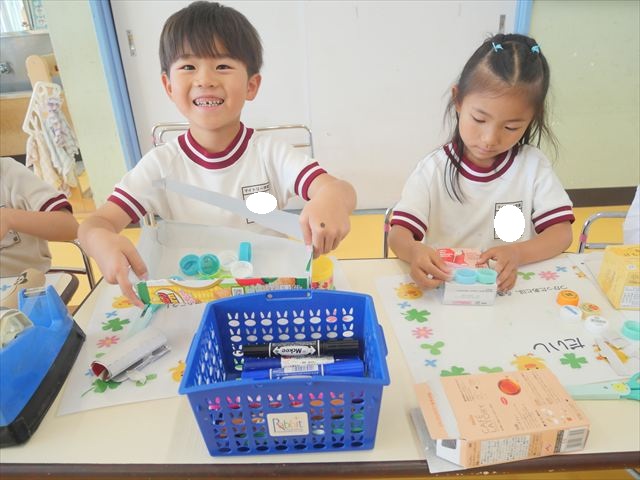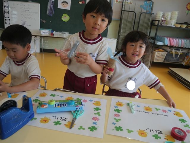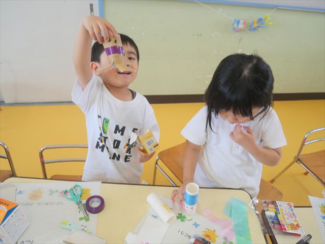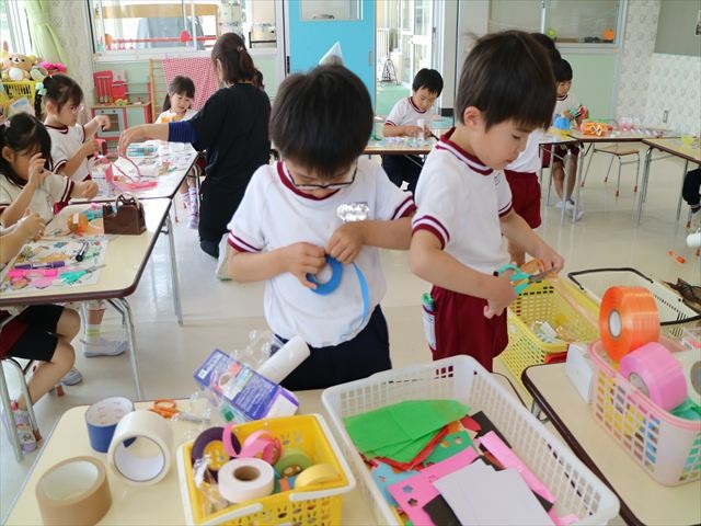 午後は、主体性の時間として「工作遊び」をしました。色々な廃材や折り紙、スズランテープなど自分たちで好きなものを使って好きなように工作遊びが楽しめました!ガムテープやビニールテープなども初めは使い方が難しく苦戦する様子も見られましたが、1度教えるとコツを掴んで自分たちだけでテープを切ったり貼ったりすることが出来ていました!また友だちと見せ合いながら自分の作りたいものを創意工夫して表現していました!今日持ち帰ったのでお子さんに何を作ったか聞いてみてください!(
