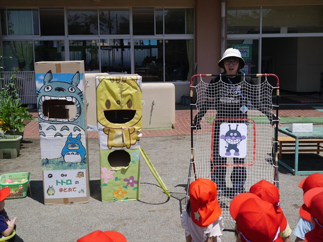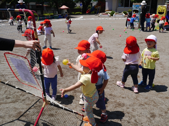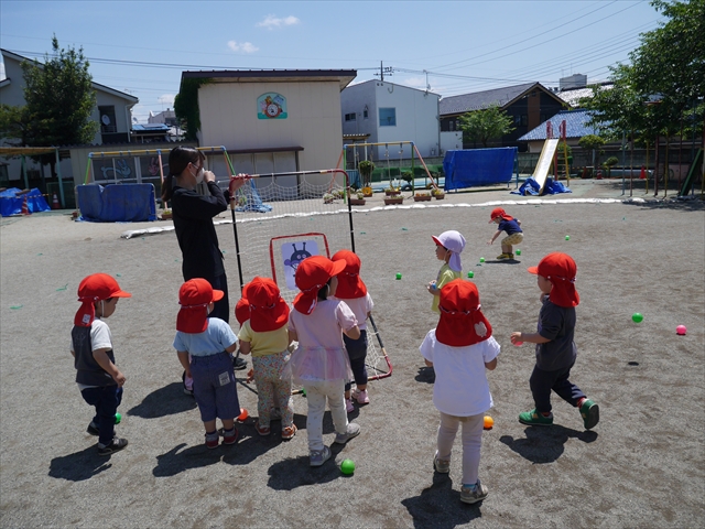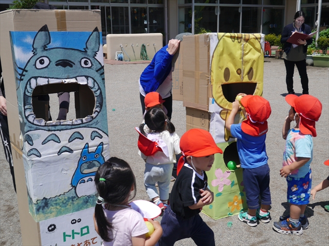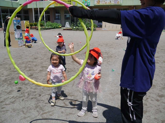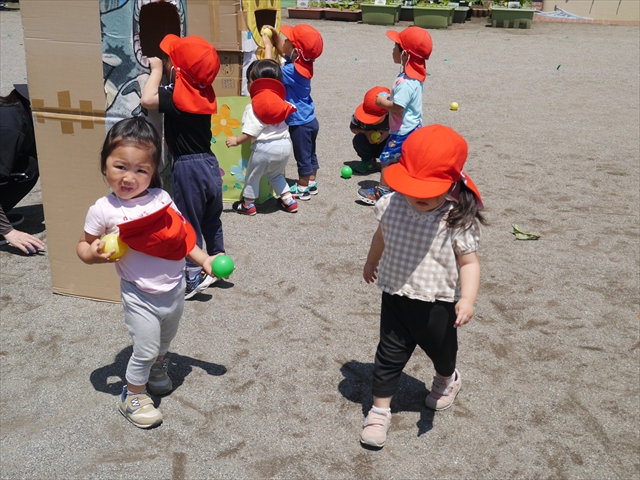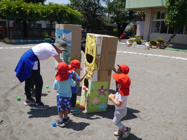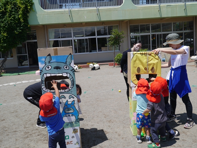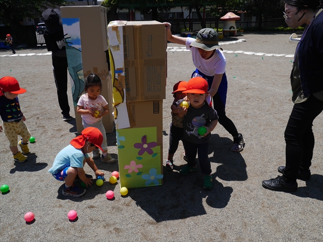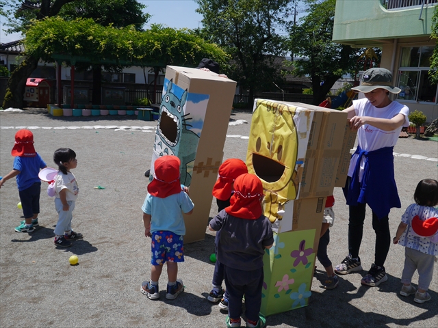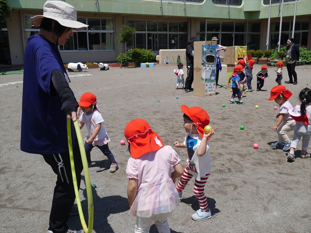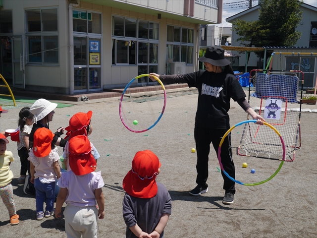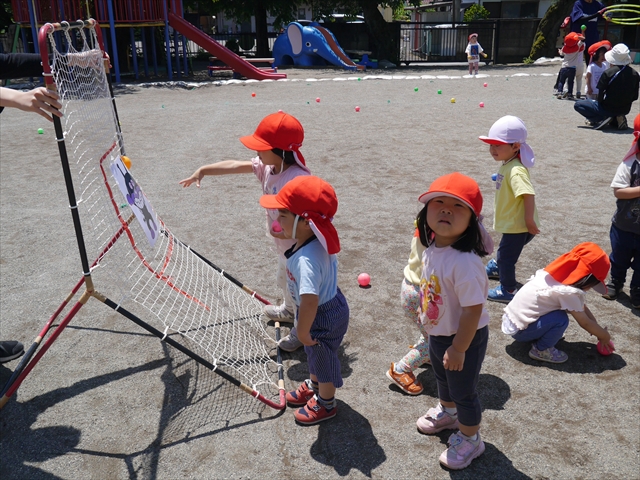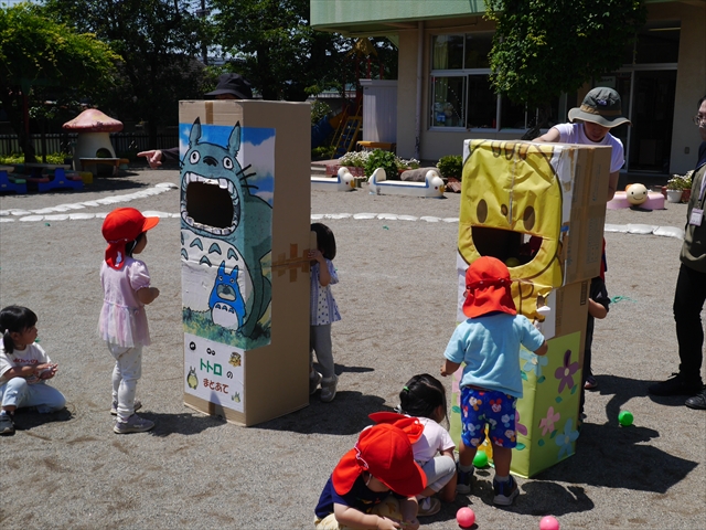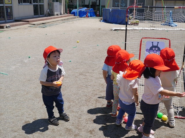 今日のたんぽぽ組は、ボール遊びをしました!先日の体育の時間で取り組んだボール遊びを、今回は子どもたちが自分の好きなところで遊べるように設置しました。ボールの狙いがより定まるよう、ネットの部分にバイキンマンを付けてみると「バイキンマンだ~!」と子どもたちは大喜び!バイキンマンに向かって投げたり、トトロとりすの口に投げ入れたり、動くフープに投げたりなど、ボールにたくさん触れて楽しむことができました最後は、フープにテープを付けてボールが貼りつくように変身☆今までの”投げる”とはまた違ったボールの楽しさを味わってくれました。