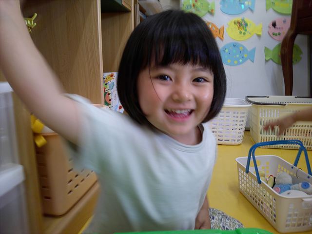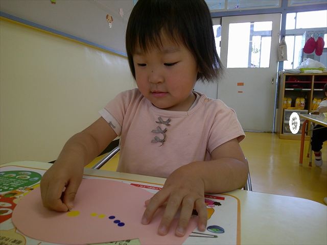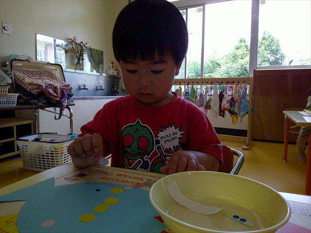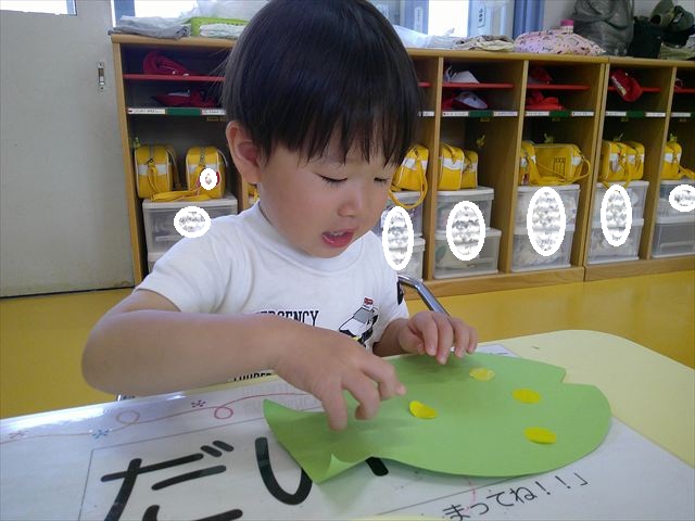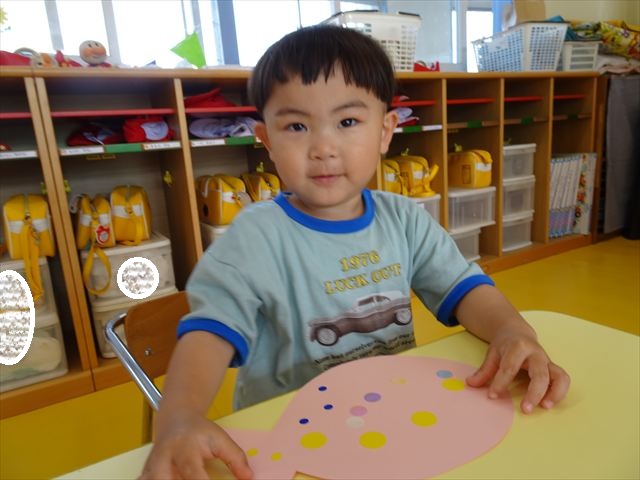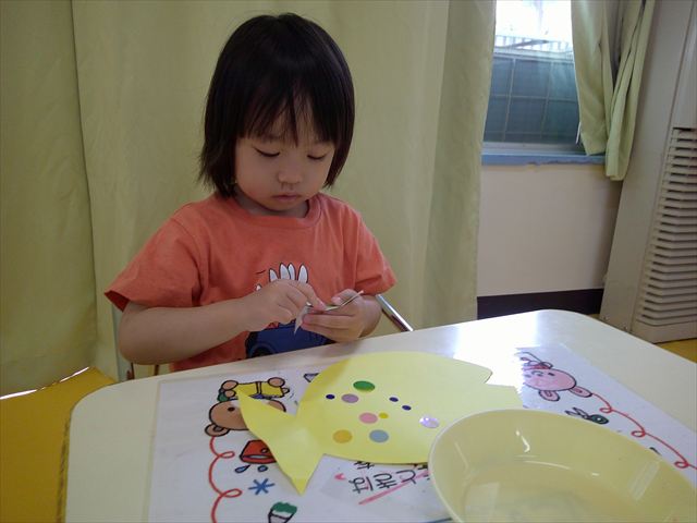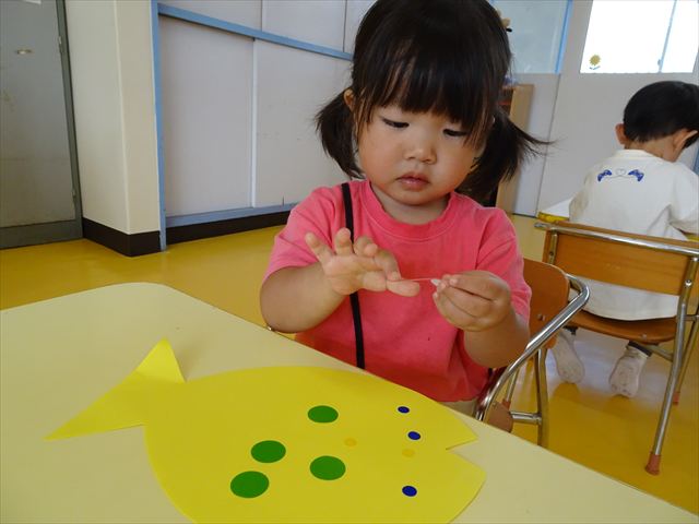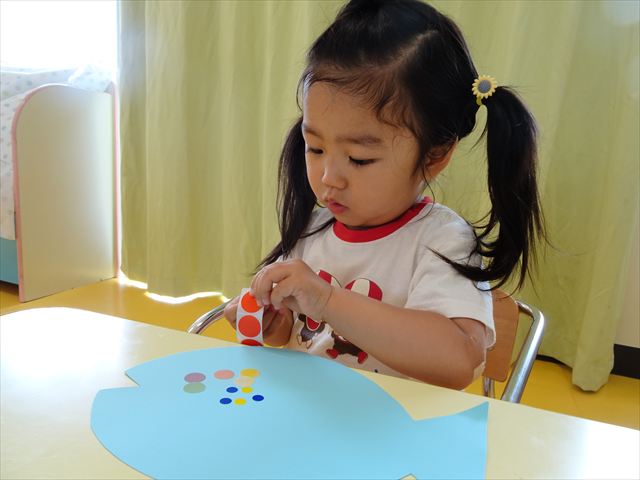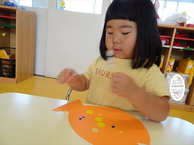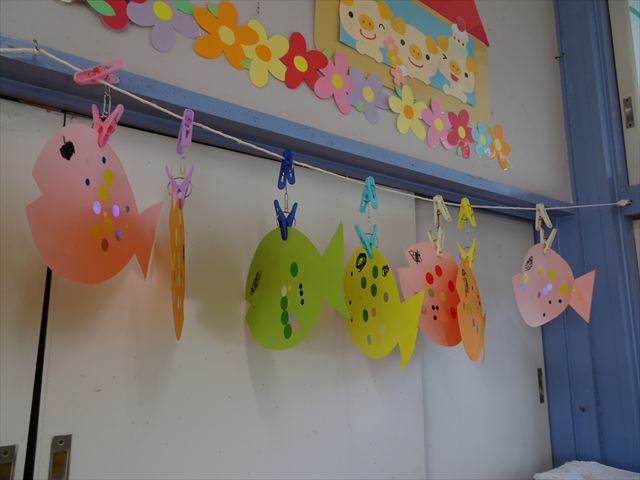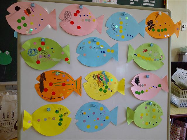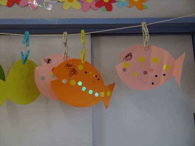 ^-^)最後はクレパスで目を描いて完成!色とりどりでかわいいさかなが出来ました♡後日ホールに飾りますので、幼稚園に来た時にぜひご覧になってください♪