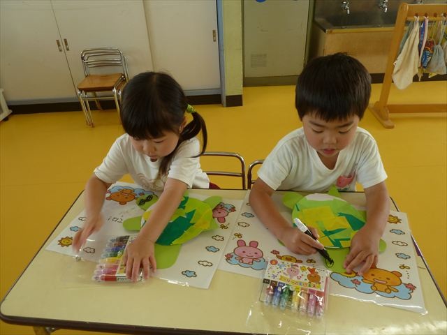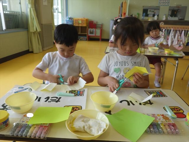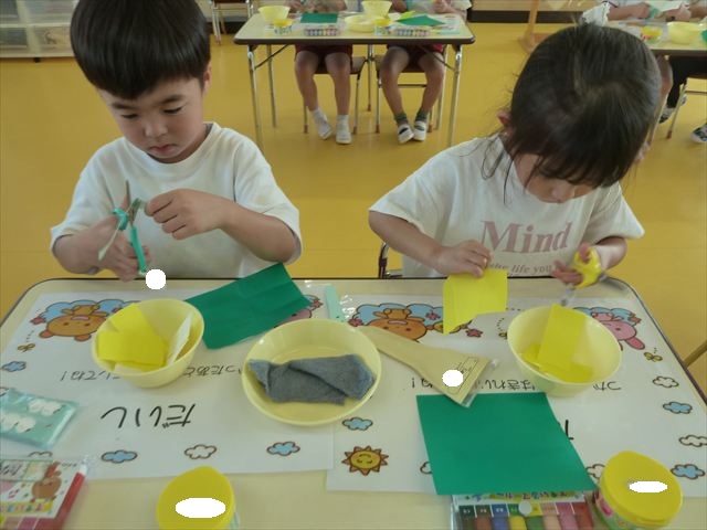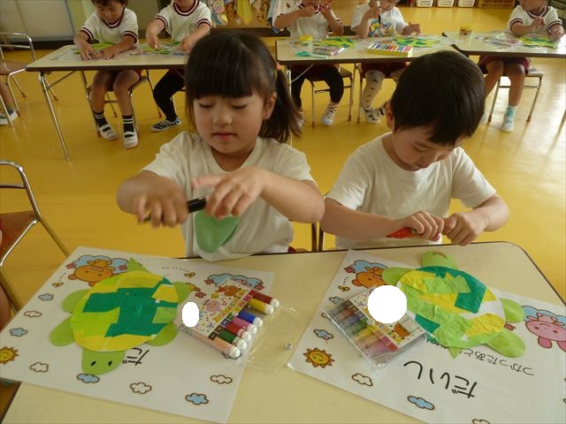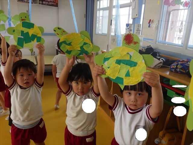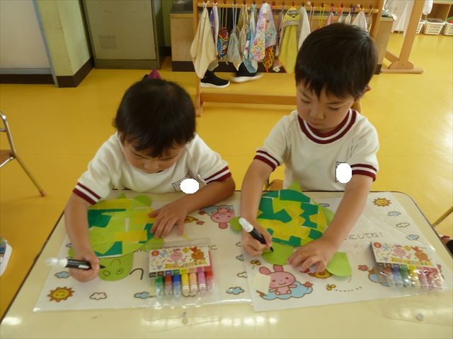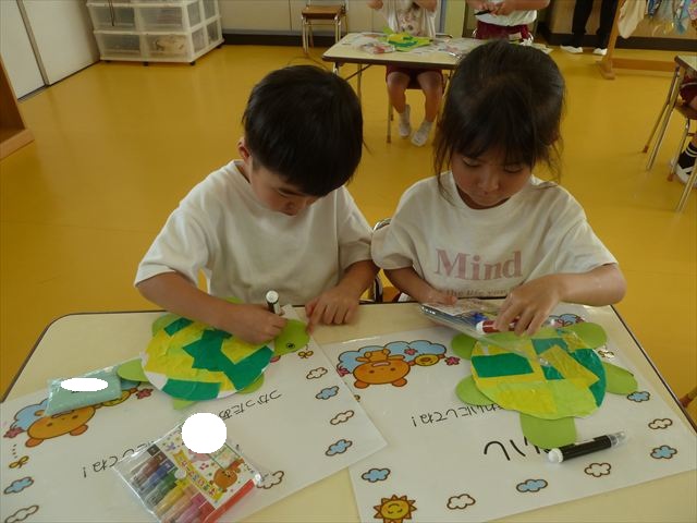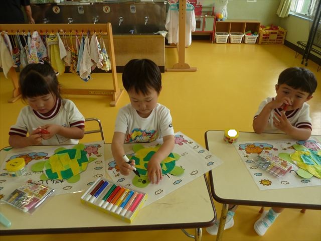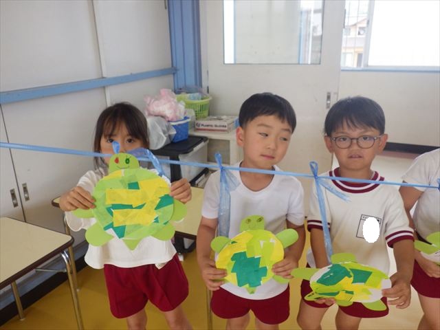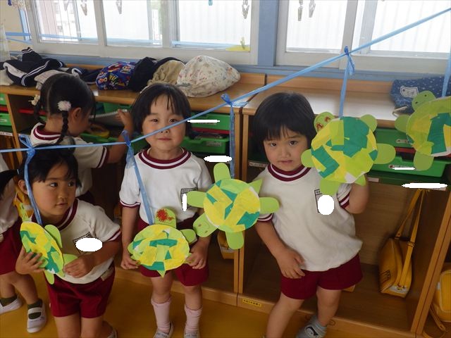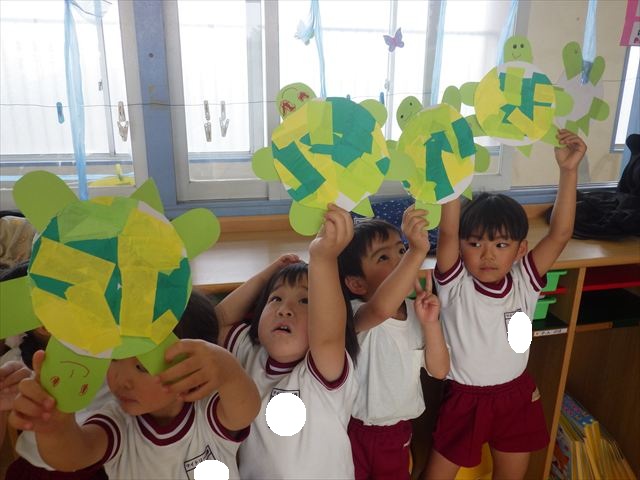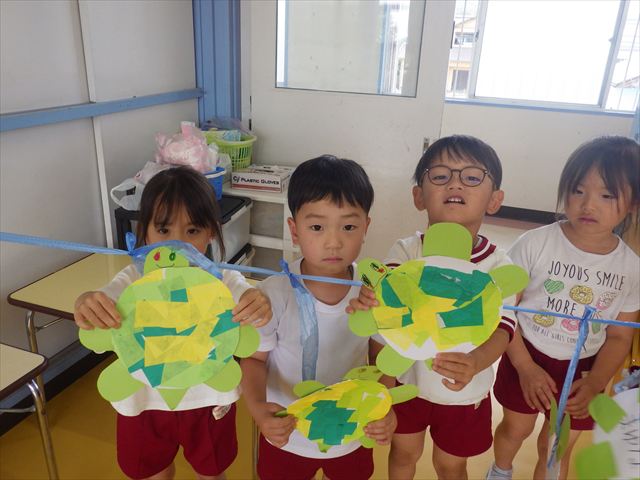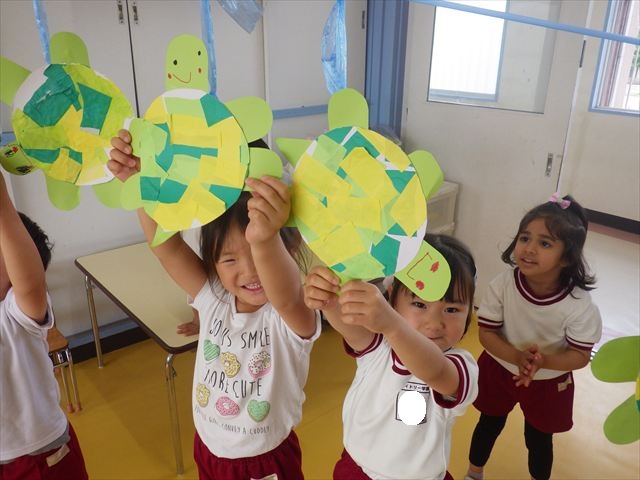 今日は造形活動としてホールに飾る「かめ」を作りました。見本のかめを見せると「かわいい♡」「仲間を作りたい。」と作る気満々の声がたくさん聞こえてきました。3枚の折り紙を3回四角に折って開いて、その折線をハサミで切っていきました。そしてその折り紙を画用紙にのりで貼って、またハサミを使て丸く切りかめの甲羅を作りました。ここまでがとっても大変な作業だったのですがみんな楽しそうに取り組んでいました。成長を感じました!最後に顔、手足、しっぽをつけて完成となりました。