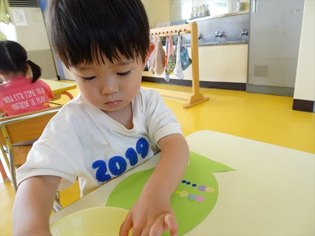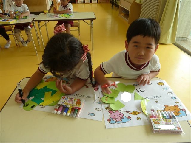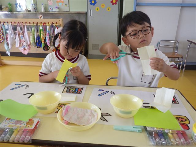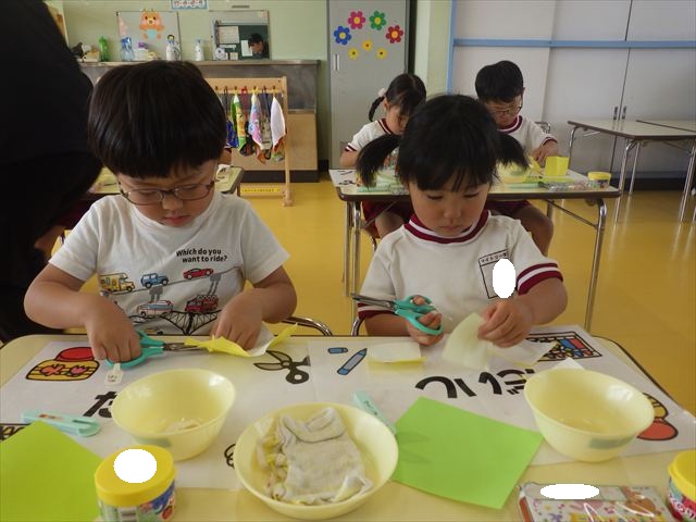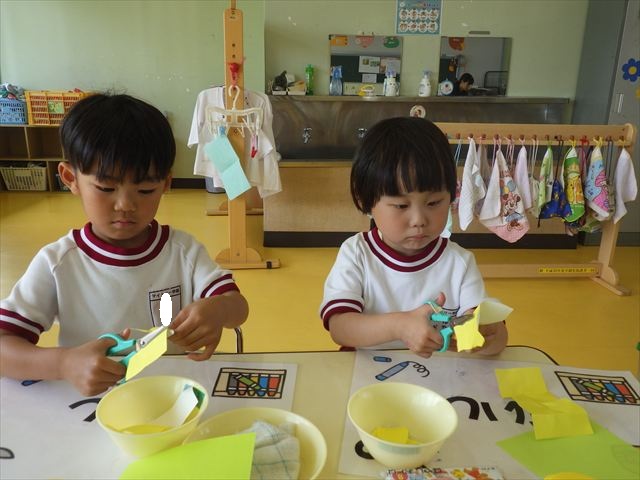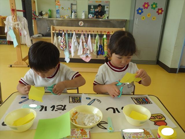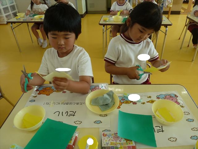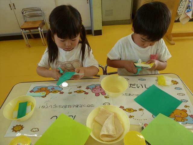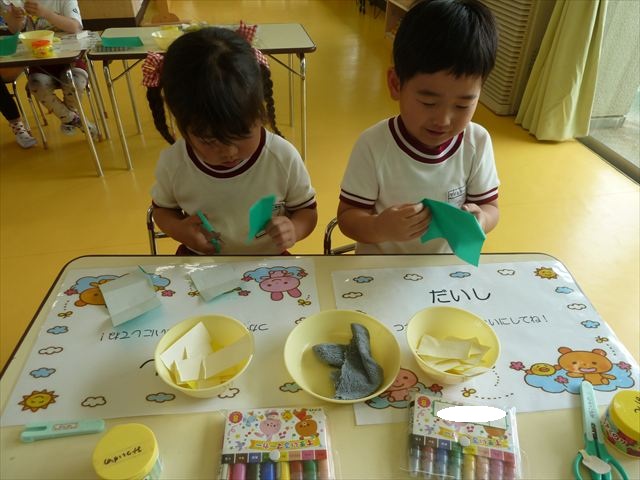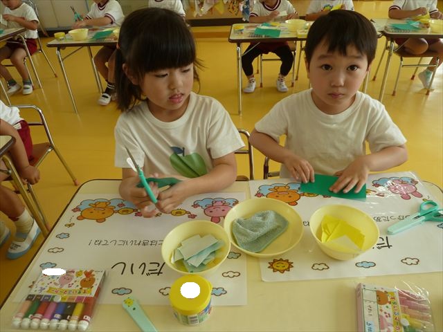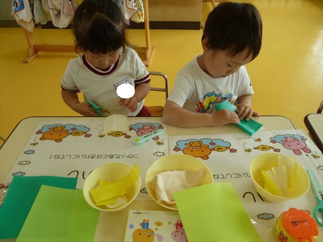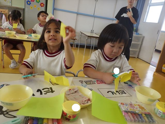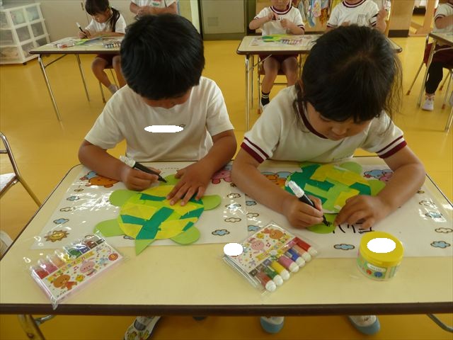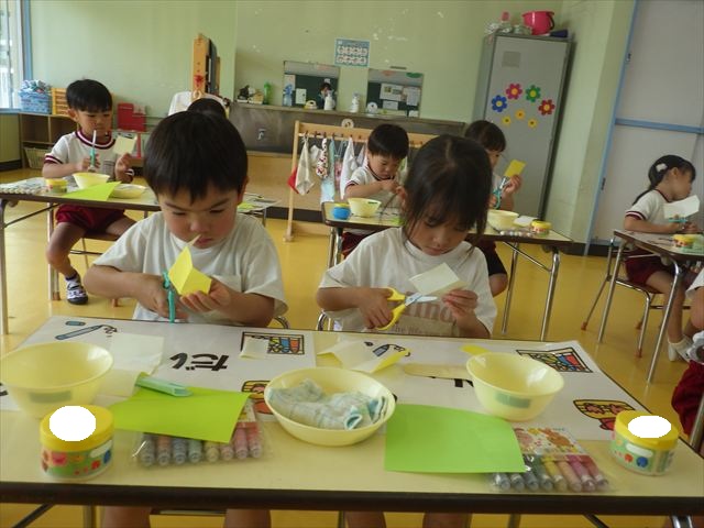今日は造形活動としてホールに飾る「かめ」を作りました。見本のかめを見せると「かわいい♡」「仲間を作りたい。」と作る気満々の声がたくさん聞こえてきました。3枚の折り紙を3回四角に折って開いて、その折線をハサミで切っていきました。そしてその折り紙を画用紙にのりで貼って、またハサミを使て丸く切りかめの甲羅を作りました。ここまでがとっても大変な作業だったのですがみんな楽しそうに取り組んでいました。成長を感じました!最後に顔、手足、しっぽをつけて完成となりました。