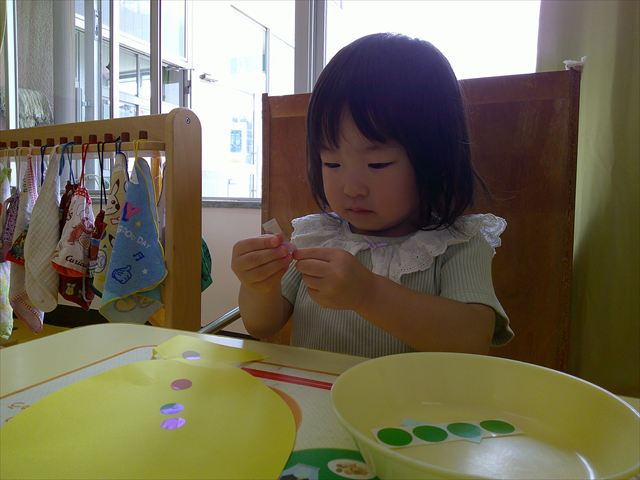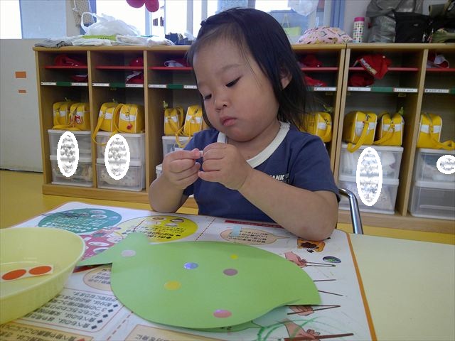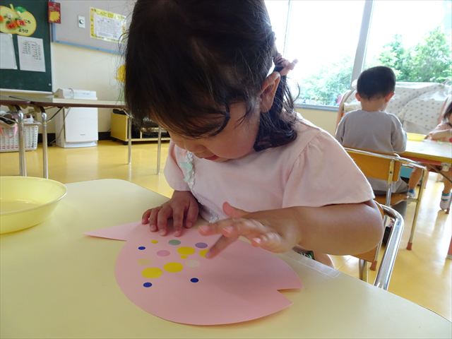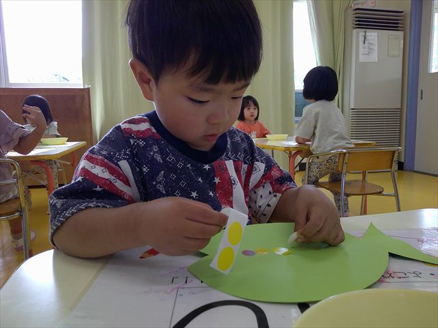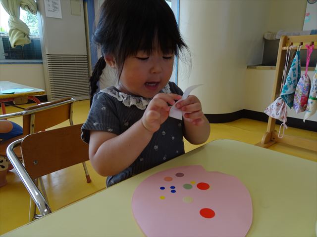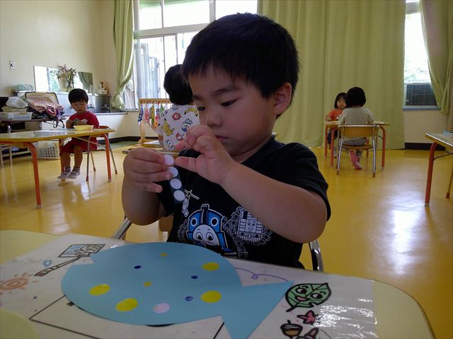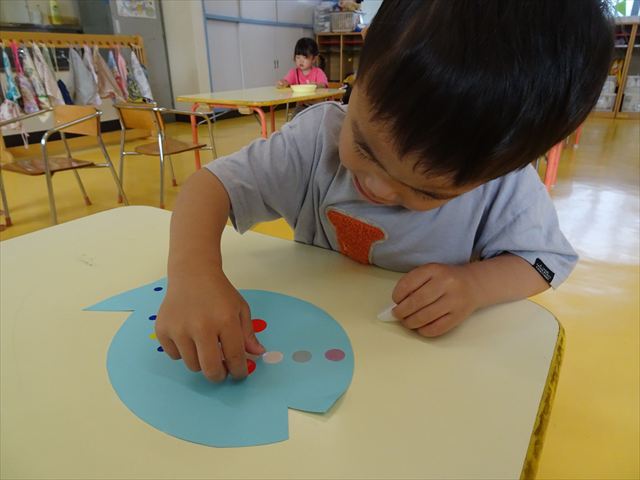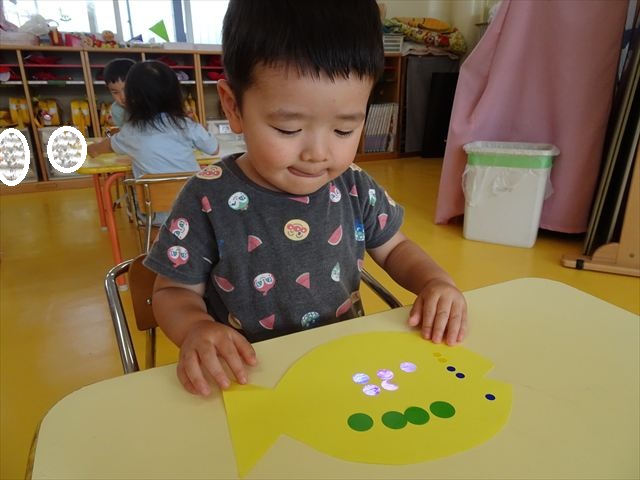 今日はホール飾り作りをしました!たんぽぽさんの担当は「さかな」。大中小3つの大きさのシールを使い、うろこを作りました。中サイズはキラキラのシールで、角度によって色が変わって見えるので、子どもたちも興味津々☆彡バラバラに貼る子、大きさの違うものを重ねて貼る子、綺麗に並べて貼る子など個性あふれていました(