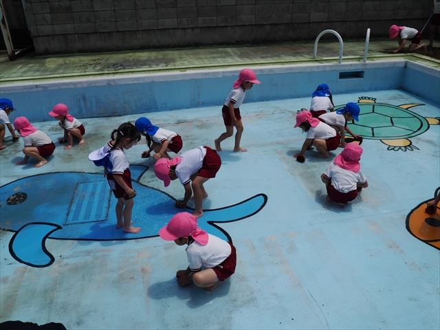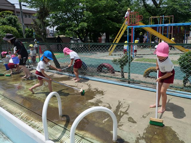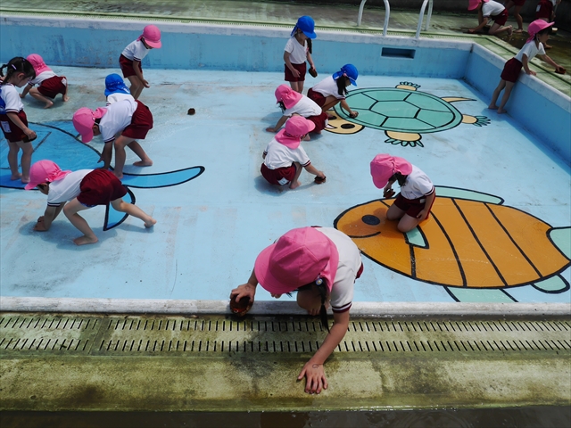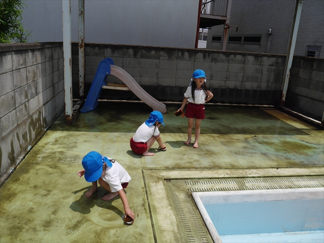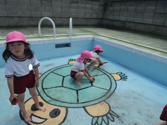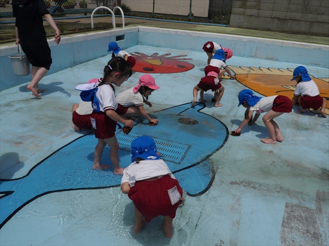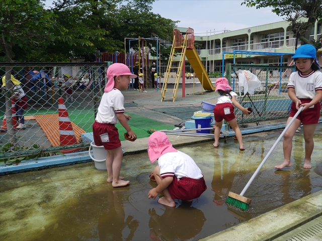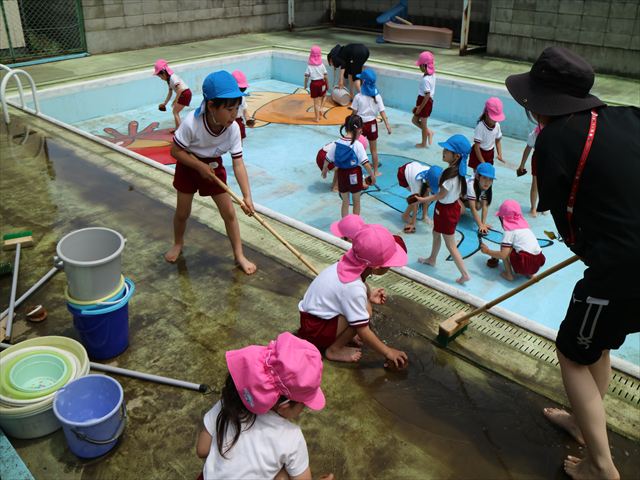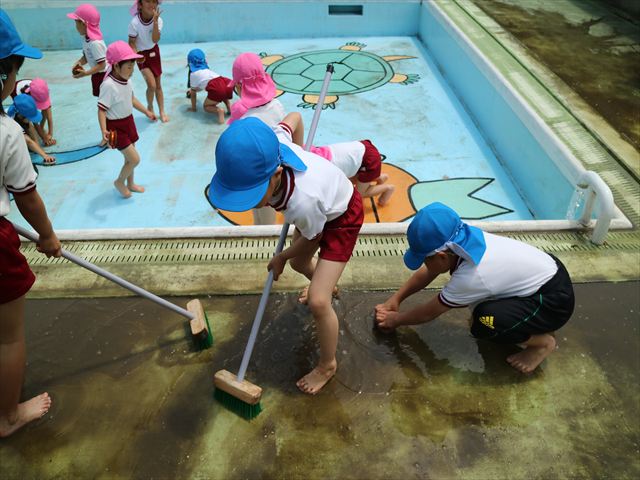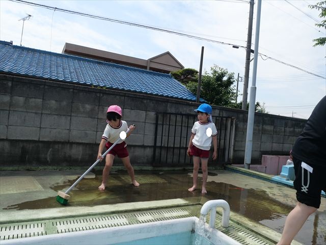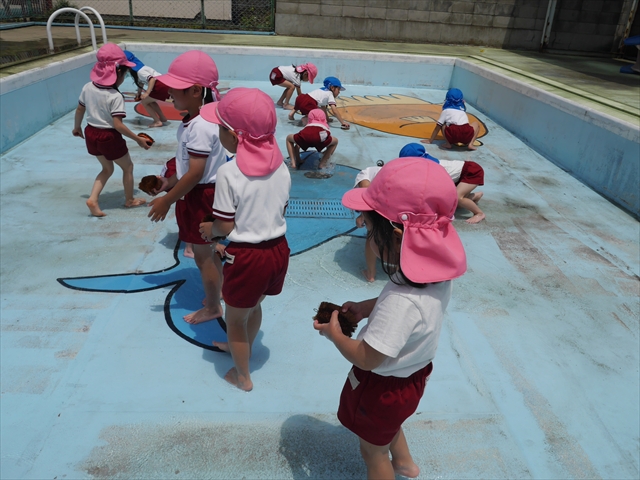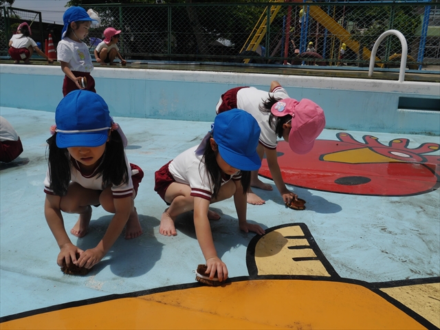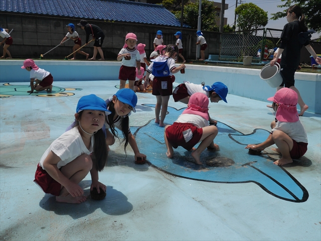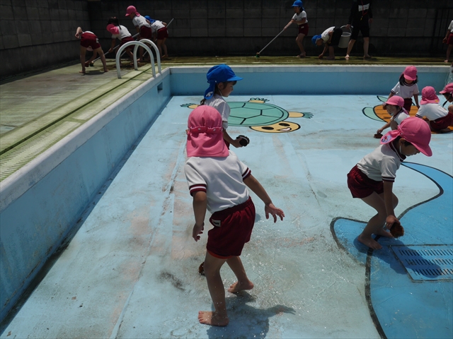 ドッジボールの後には、プール掃除をしました。去年プールを使った時から一年が経ち、泥や落ち葉で真っ黒だったプールでしたが子どもたちが一生懸命タワシやブラシで擦ってくれたおかげでとてもきれいになりました!これでみんなが気持ちよくプールに入ることができます!※服に汚れがついたり、濡れてしまった子は着替えて持ち帰りましたので確認をお願い致します。