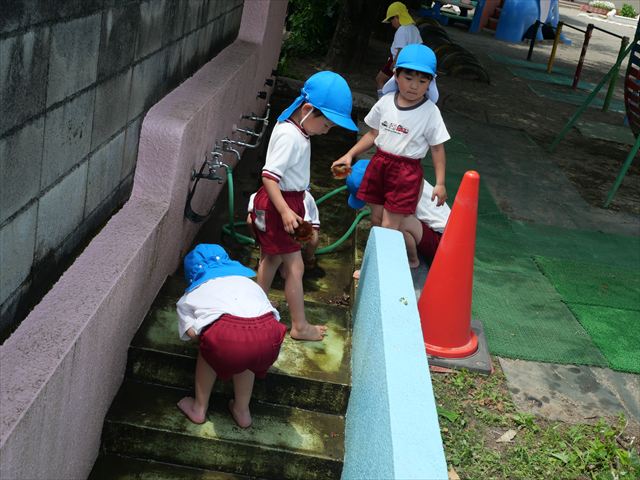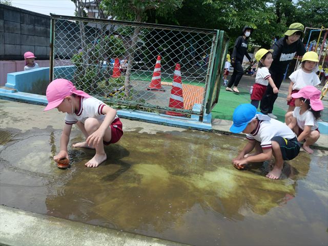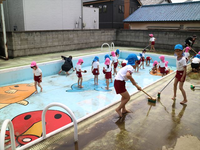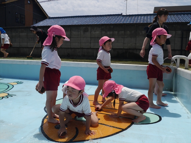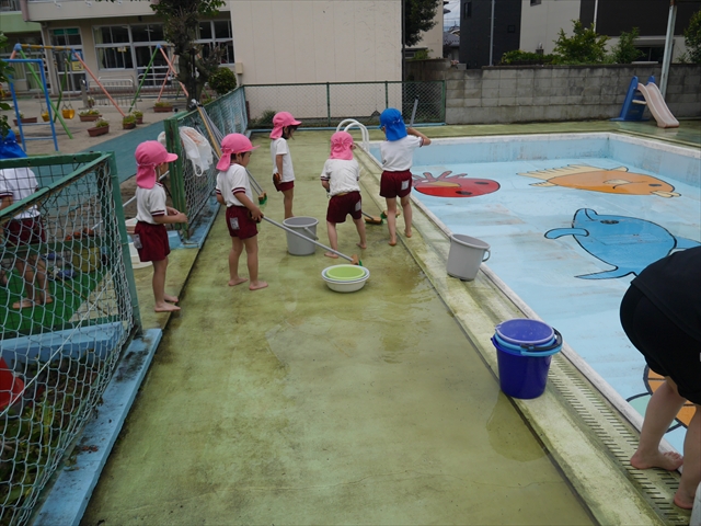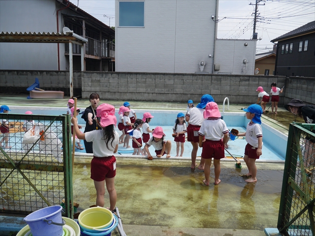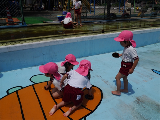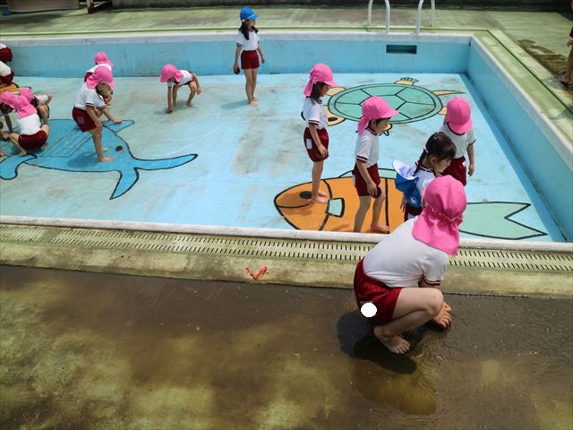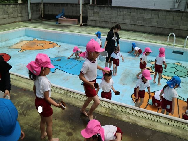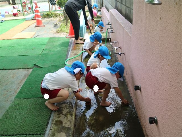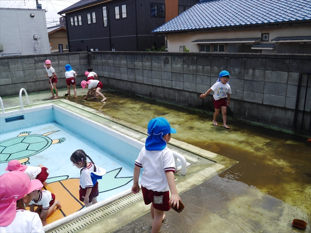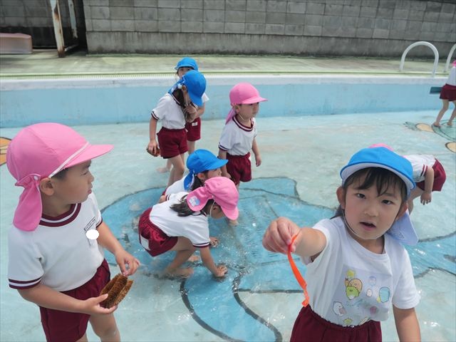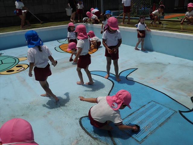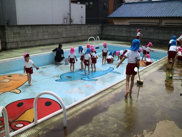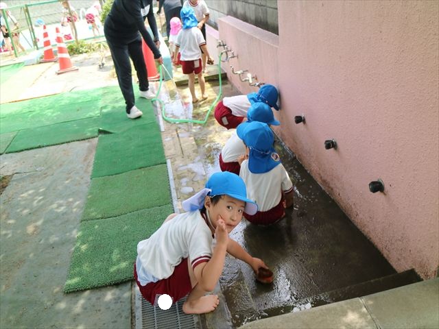 ドッジボールの後には、プール掃除をしました。去年プールを使った時から一年が経ち、泥や落ち葉で真っ黒だったプールでしたが子どもたちが一生懸命タワシやブラシで擦ってくれたおかげでとてもきれいになりました!これでみんなが気持ちよくプールに入ることができます!※服に汚れがついたり、濡れてしまった子は着替えて持ち帰りましたので確認をお願い致します。