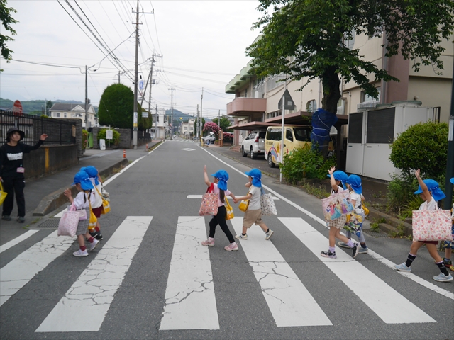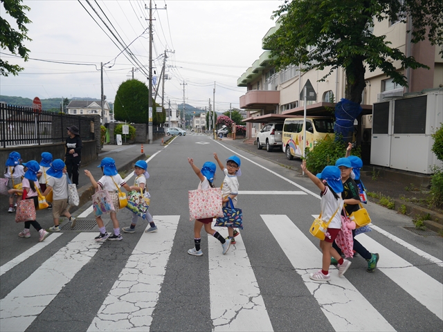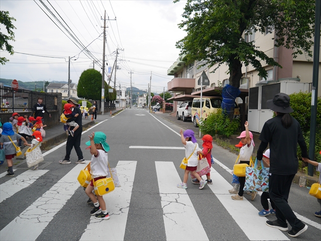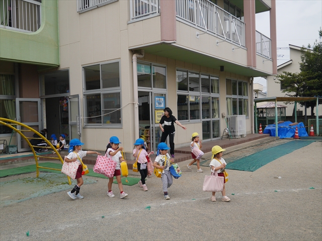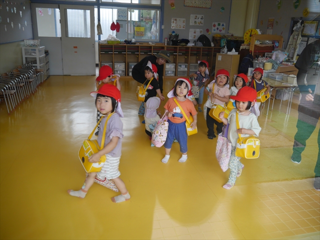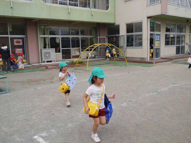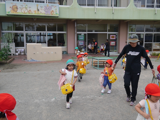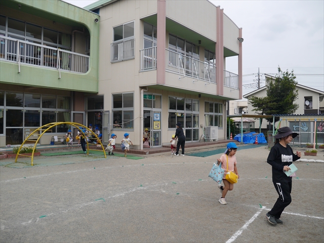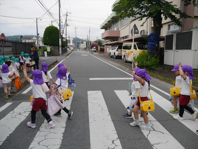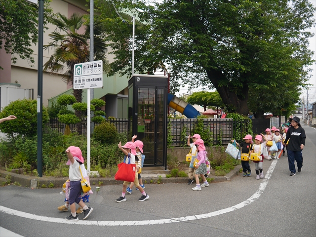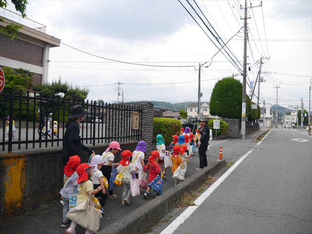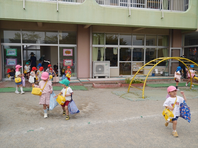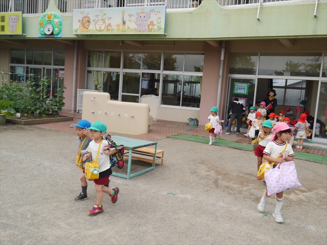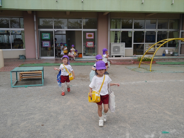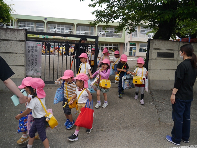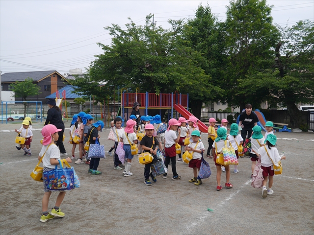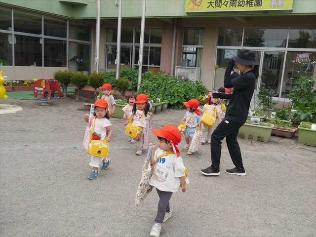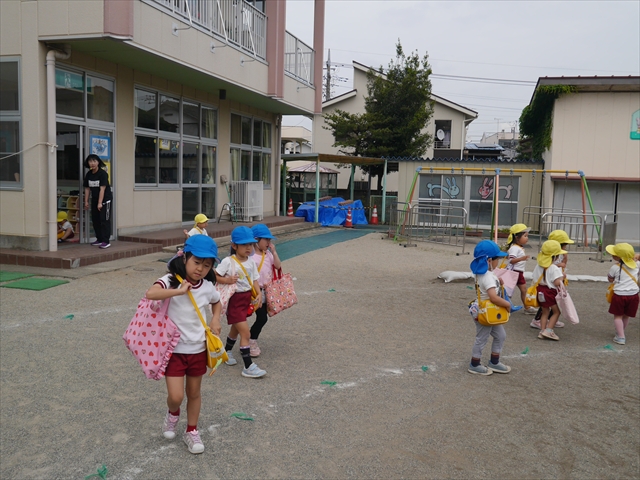 今日は、雨も降らず、暑過ぎもせず、引き渡し訓練には丁度良い天気でした。子どもたちもしっかり園庭に避難し、そして、大間々南小学校へもみんなしっかり行くことができ、無事保護者の皆さんに引き渡すことができました。(^