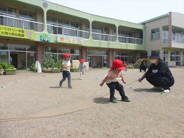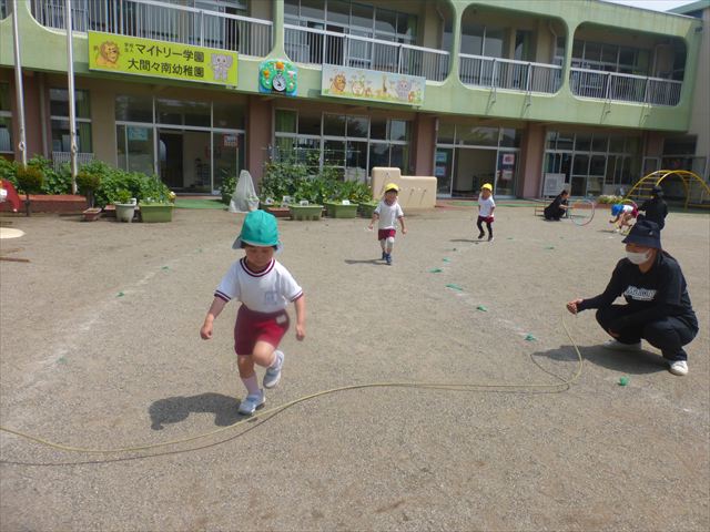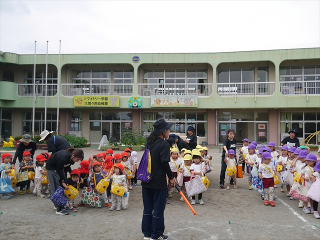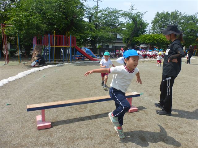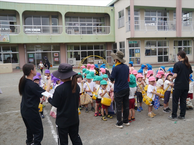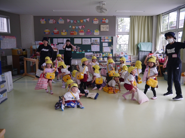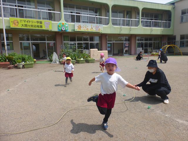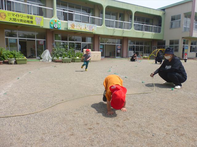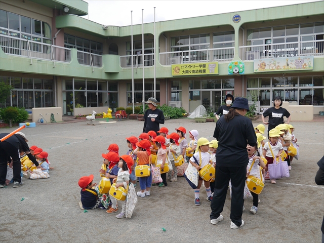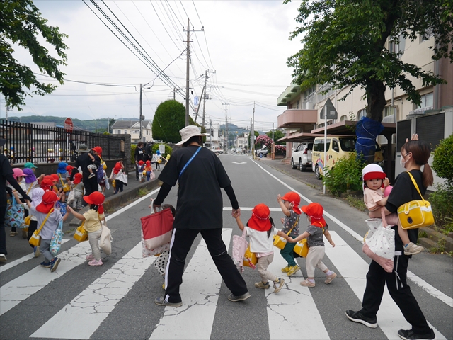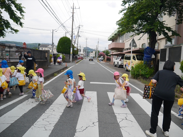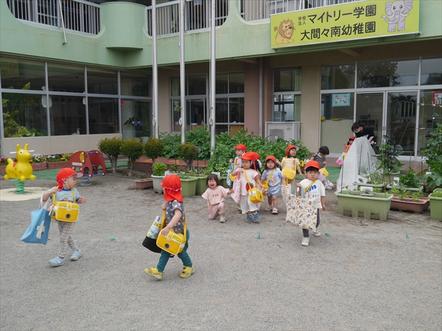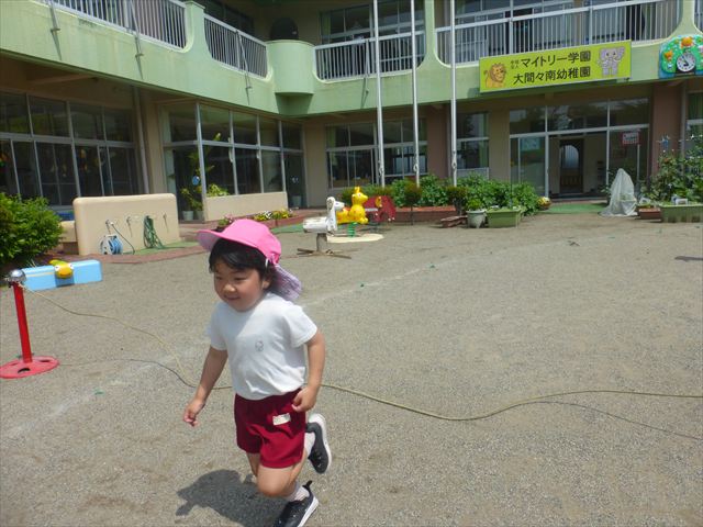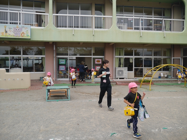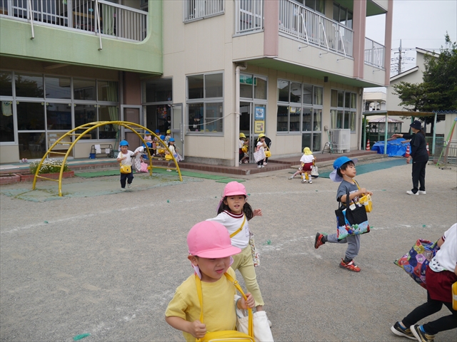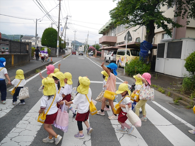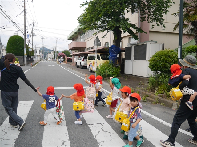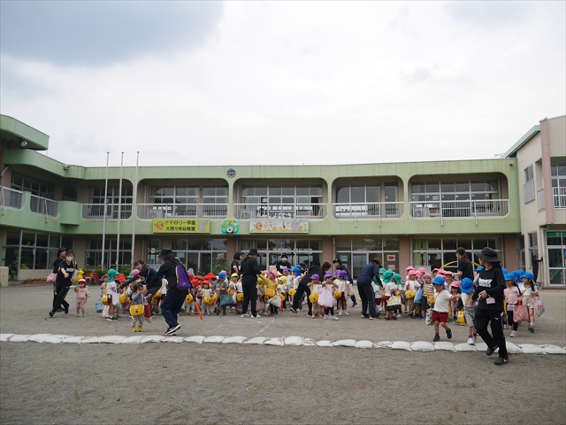 今日は、雨も降らず、暑過ぎもせず、引き渡し訓練には丁度良い天気でした。子どもたちもしっかり園庭に避難し、そして、大間々南小学校へもみんなしっかり行くことができ、無事保護者の皆さんに引き渡すことができました。(^