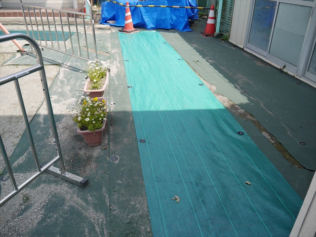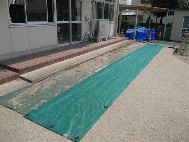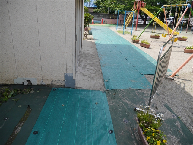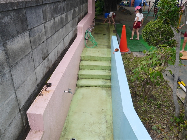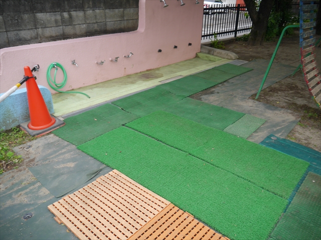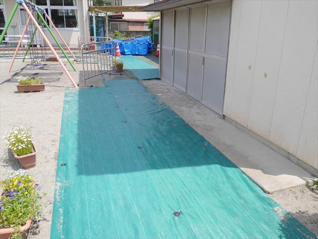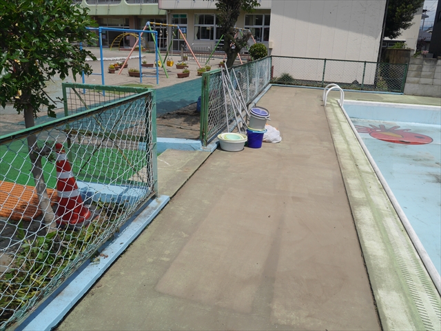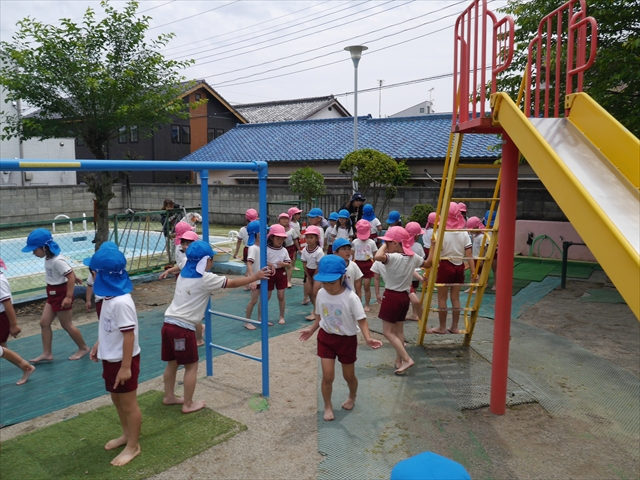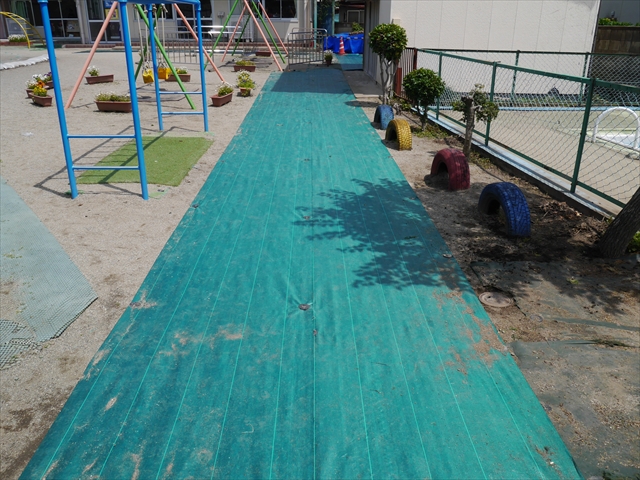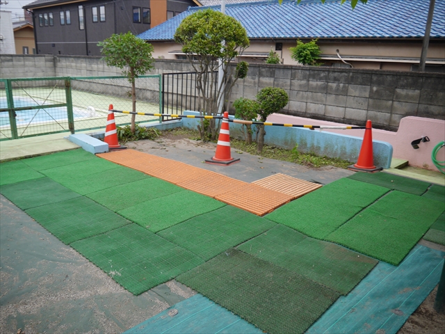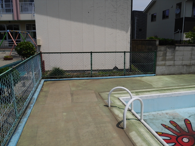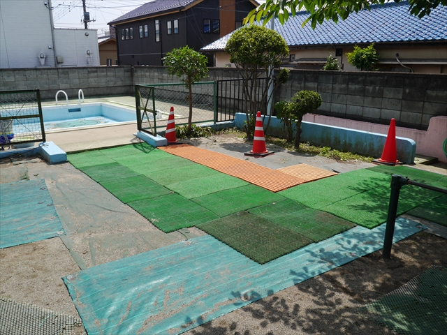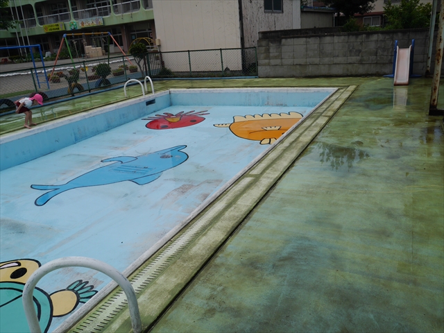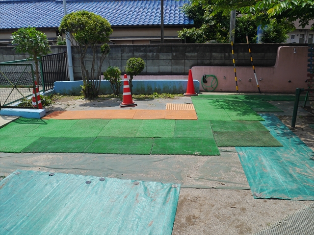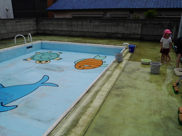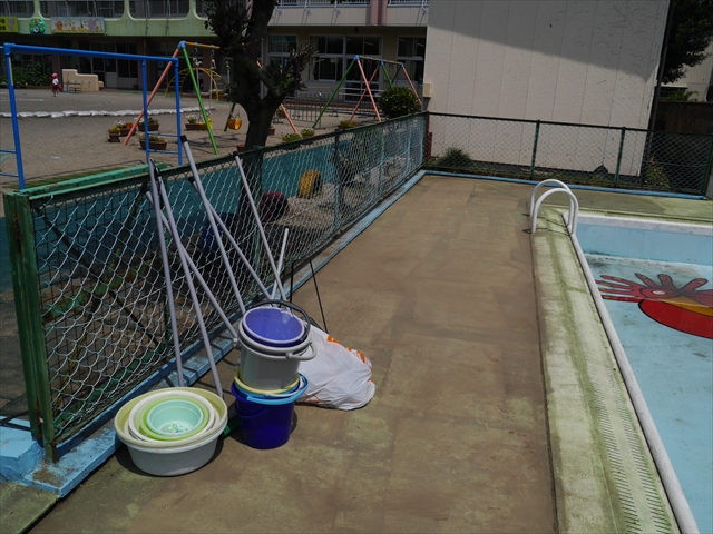 6月3日(火)は、いよいよ子どもたちが待ちに待った「プール開き」です。昨日と今日の午前中、職員作業で、もうもうと伸び放題の樹木や雑草などの剪定・除草を行い、除草シートや人工芝マットを敷き、プール周り清掃し、年長さんたちが「プール掃除」をしやすいように、廃墟となっていたプールをきれいにしました。その後、年長さんが「プール清掃」でみんなで頑張って綺麗にしてくれました。「引き渡し訓練」の後、年長さんがプール掃除をしてくれた後のプールを全職員でさらに綺麗にいつでも入れるように「プール掃除」をしました。また、たんぽぽさんたちの「プール」も設営しました。これで準備万端整いました。(^_^)v