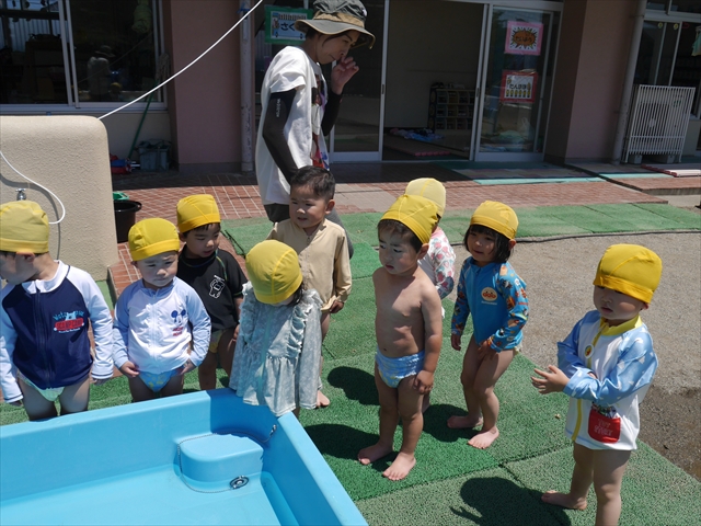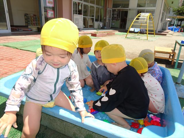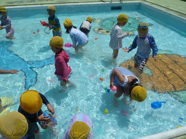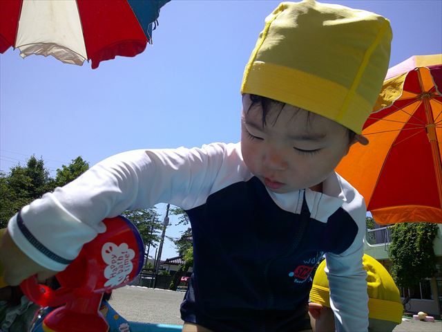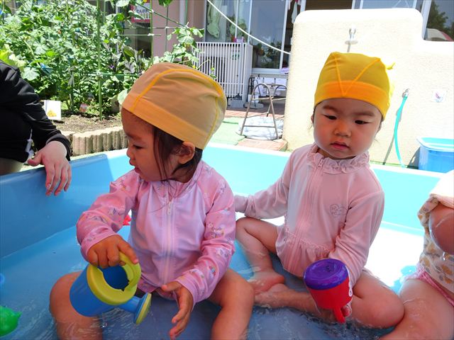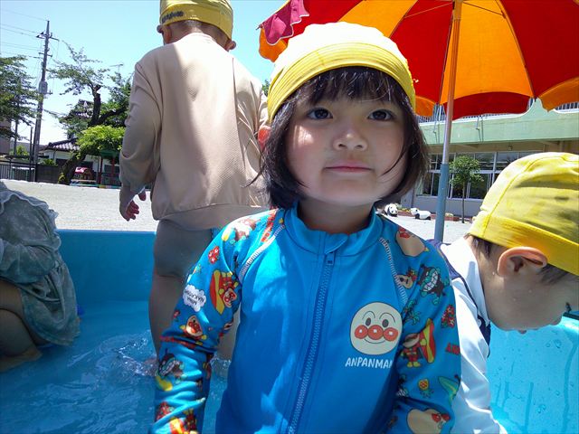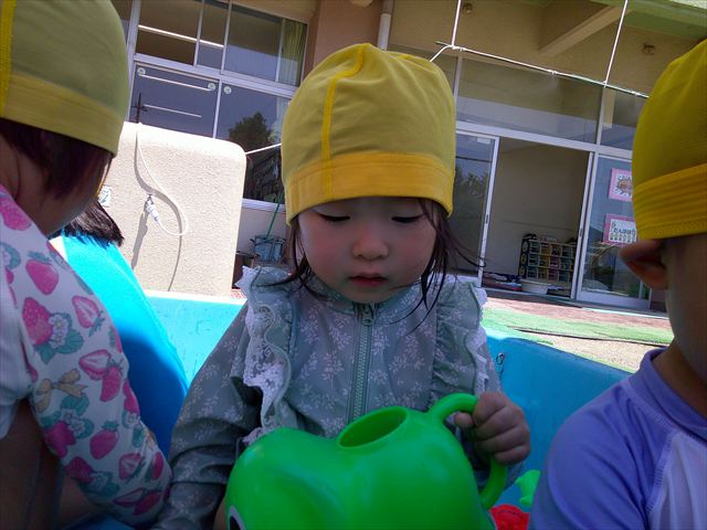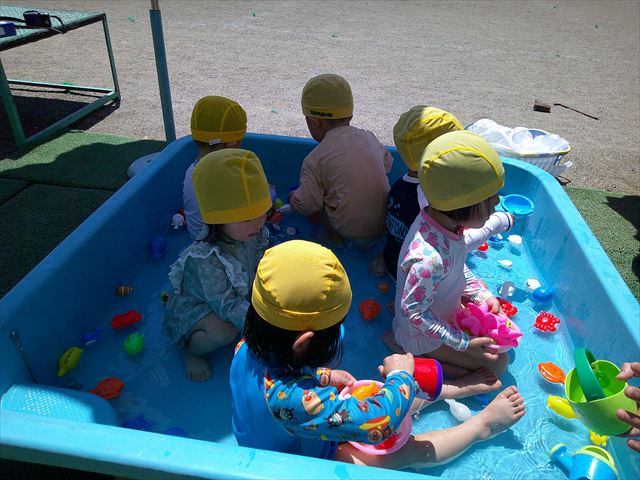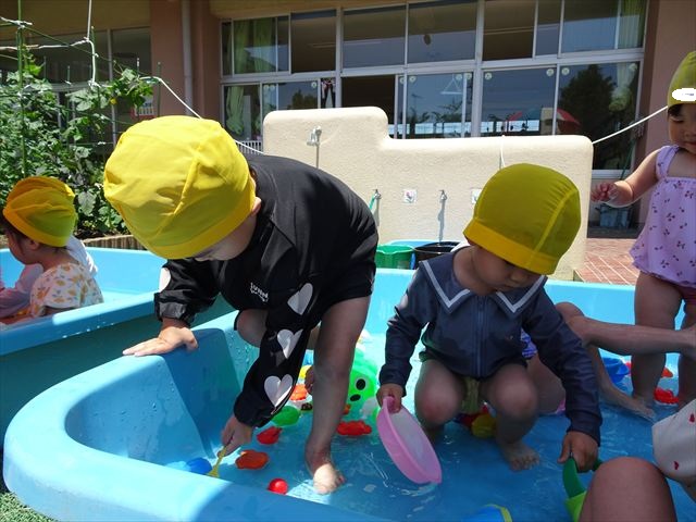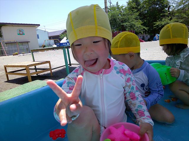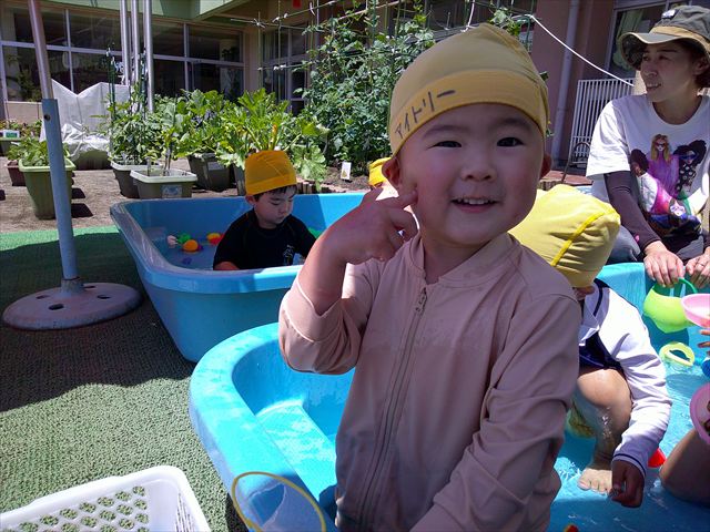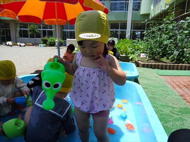 天気も良く、気温も上がったので今日もプールに入る事が出来ました!水の量も昨日より増やして楽しみました。子どもたちは「キャーキャー」言いながら水の感触を楽しんでいました!笛に合わせて流れるプールを作ったり、おもちゃで遊んだりしてとても楽しそうでした♪