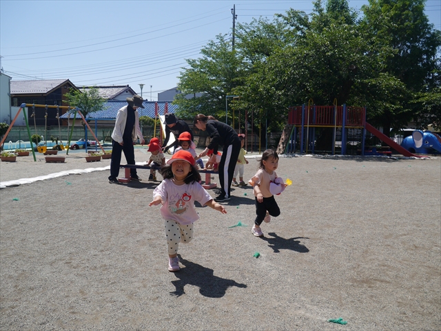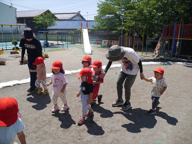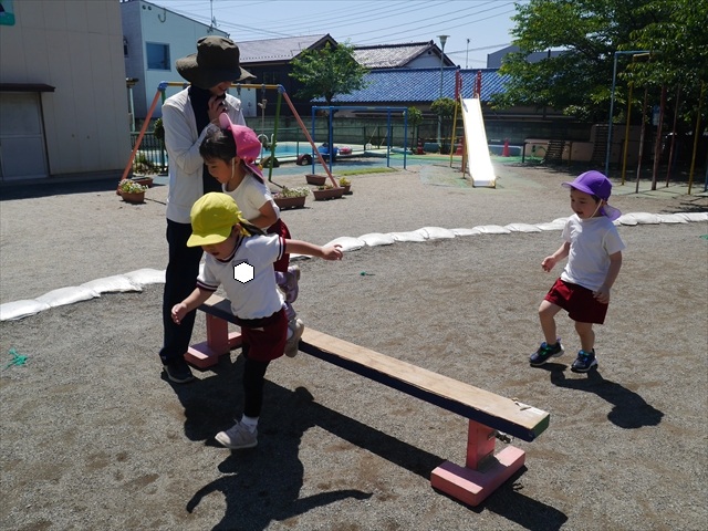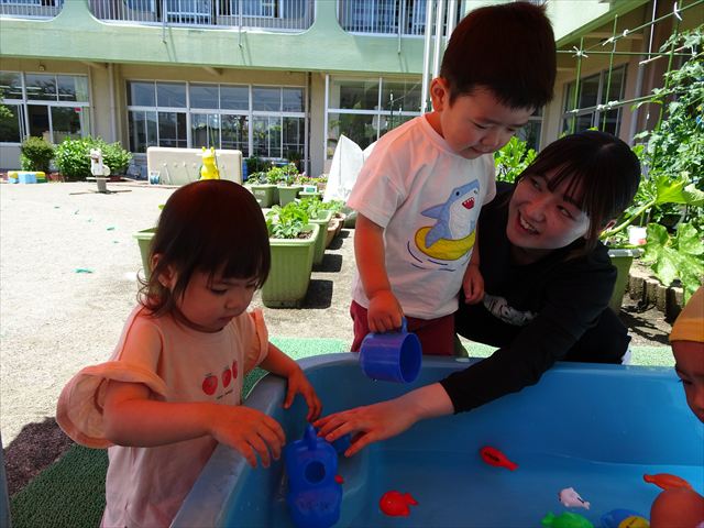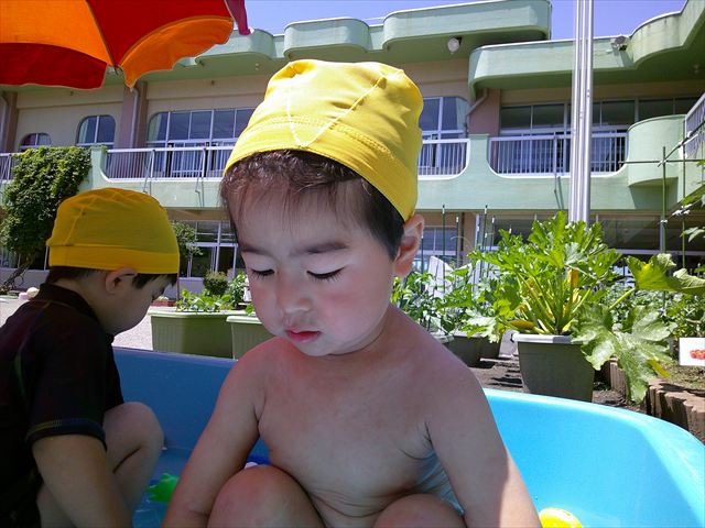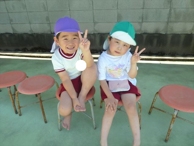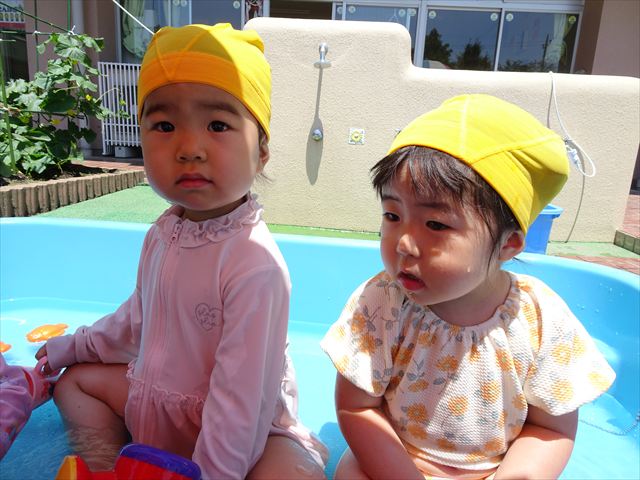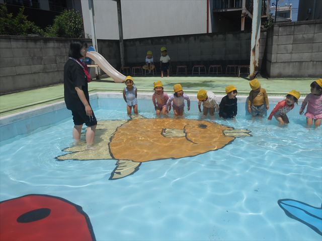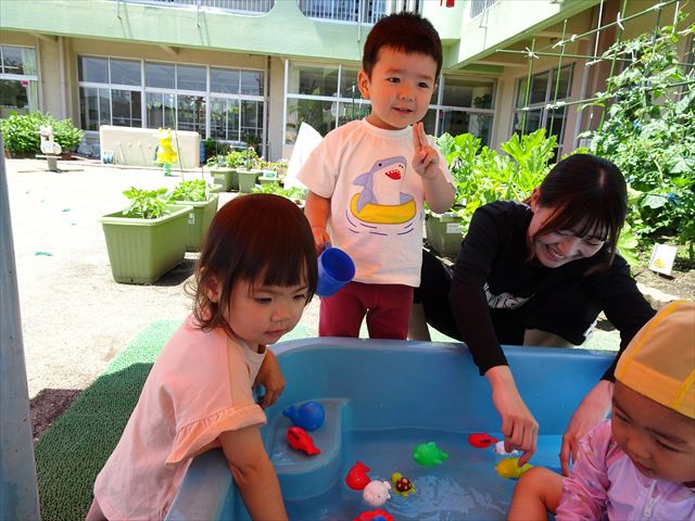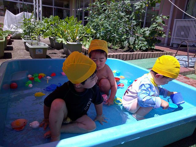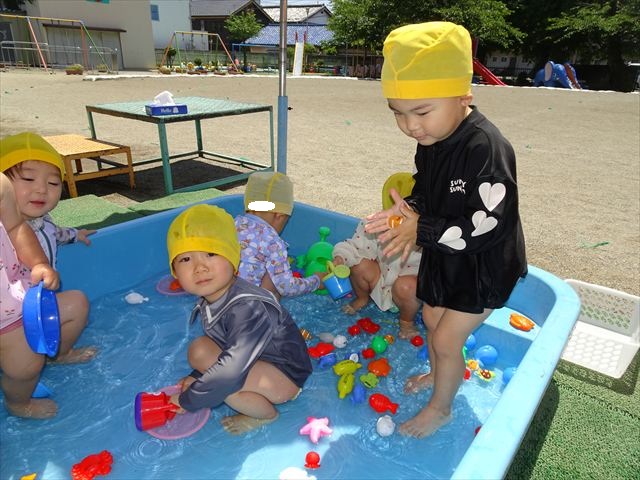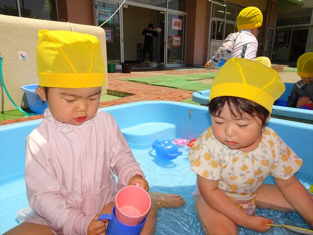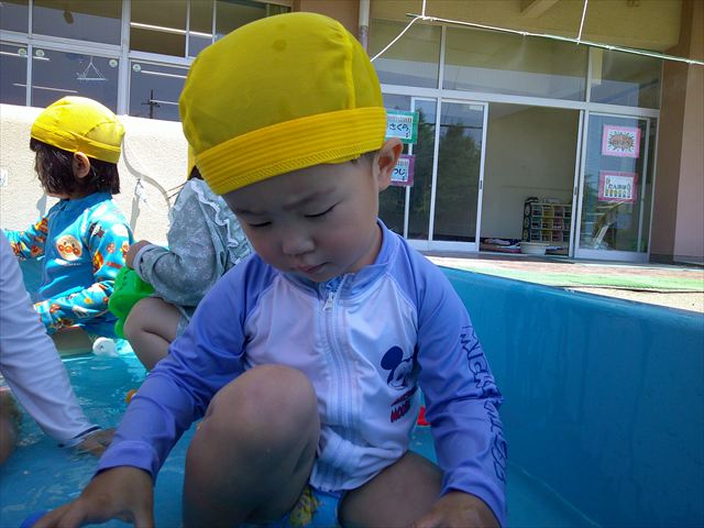 天気も良く、気温も上がったので今日もプールに入る事が出来ました!水の量も昨日より増やして楽しみました。子どもたちは「キャーキャー」言いながら水の感触を楽しんでいました!笛に合わせて流れるプールを作ったり、おもちゃで遊んだりしてとても楽しそうでした♪