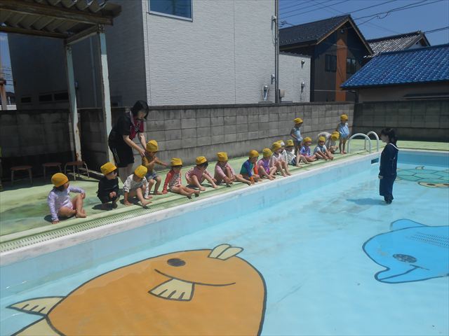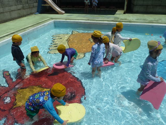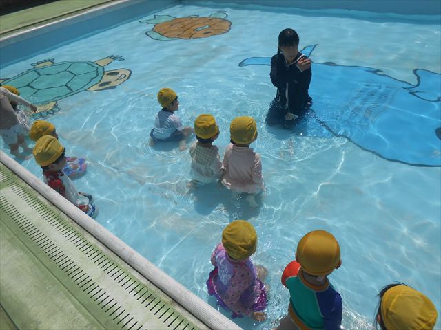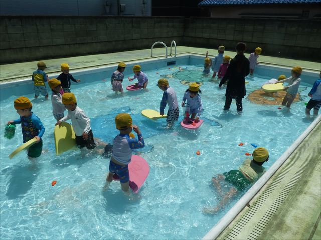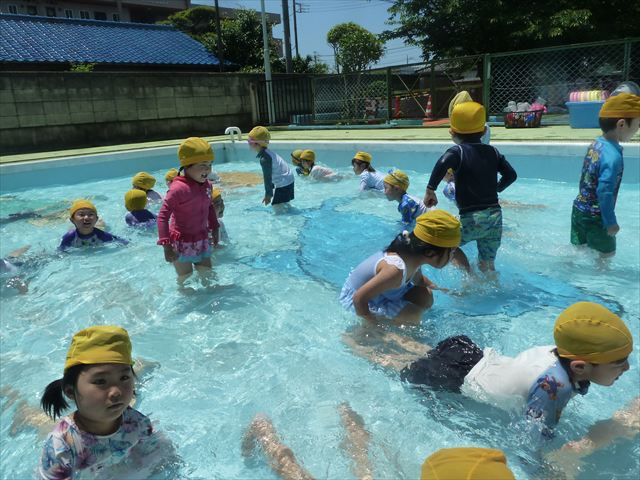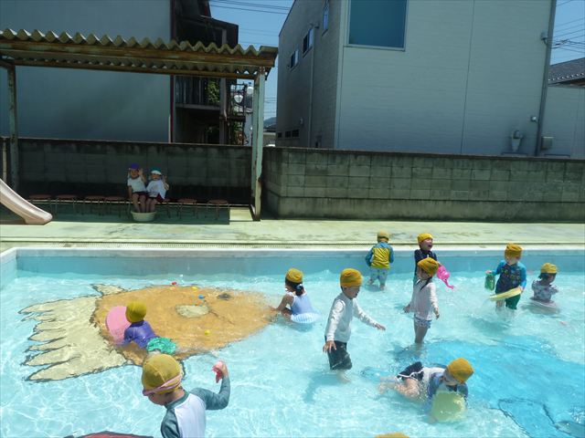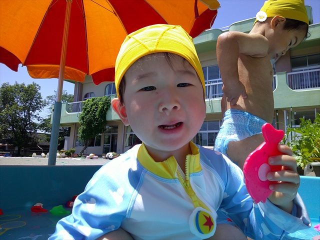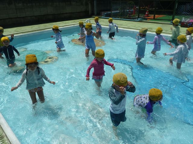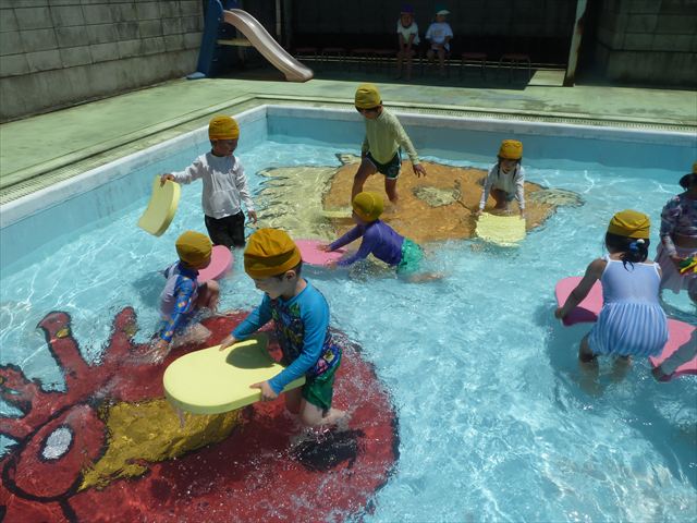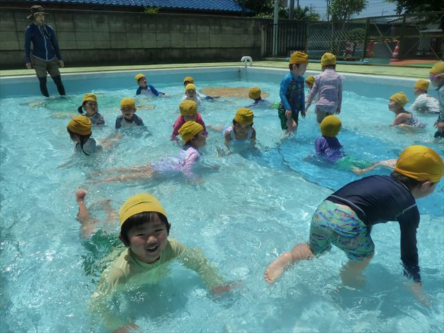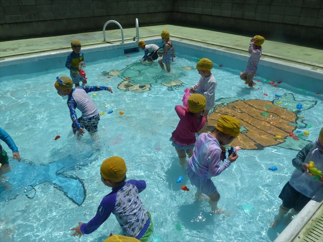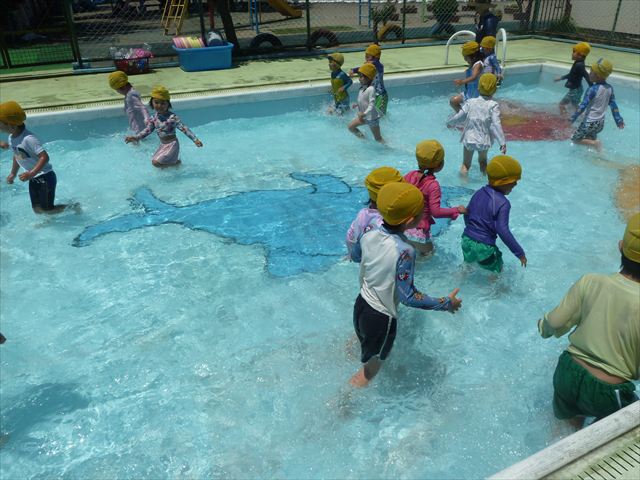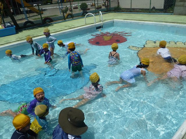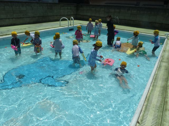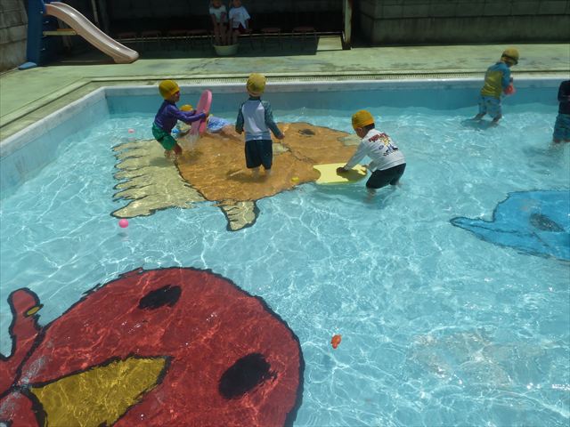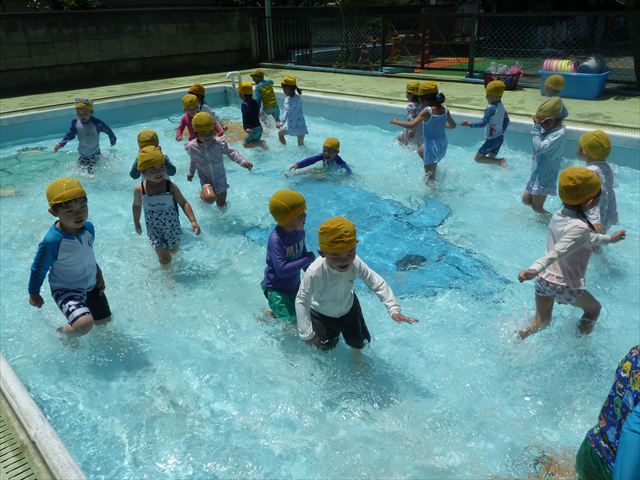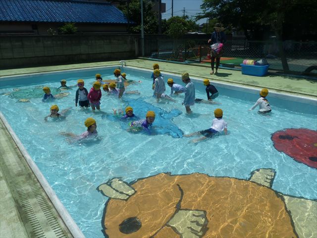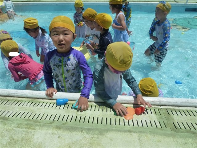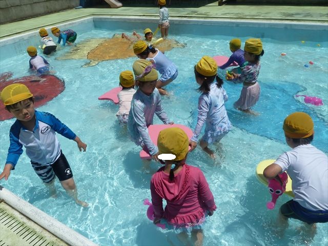 ^^)午後は楽しみにしていたプール遊び。憧れの大きいプールに入れてとっても嬉しそうな年少さんでした(